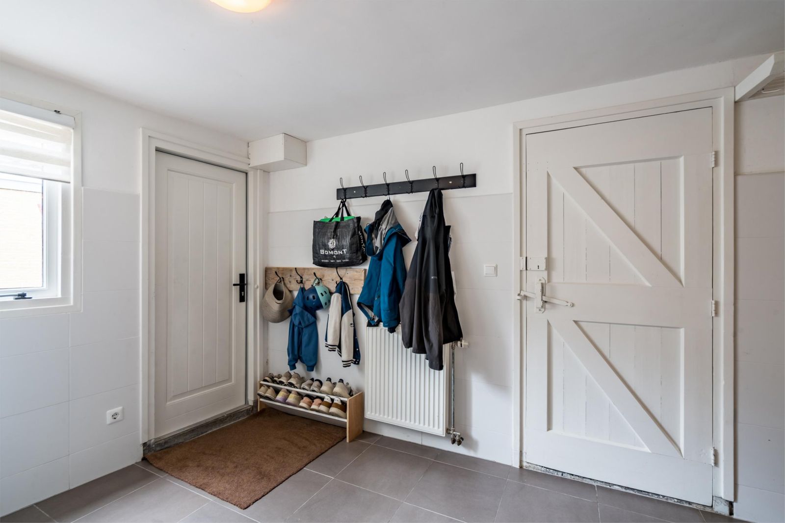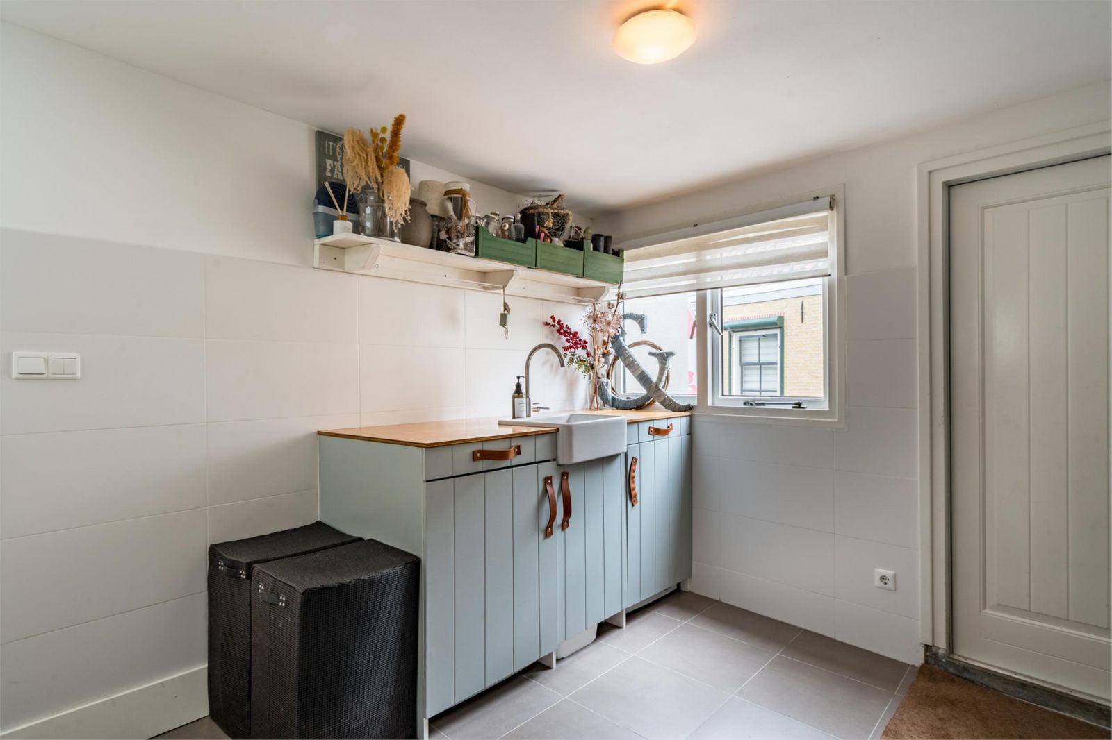 De bijkeuken met opstelplaats voor wasmachine en droger is netjes weggewerkt in een keukenblok met gootsteen. Daarnaast bevindt zich hier de opstelplaats van de cv-ketel. De bijkeuken biedt veel handige bergruimte en geeft toegang tot de kelder, die dankzij de constante temperatuur ook geschikt is als wijnkelder.