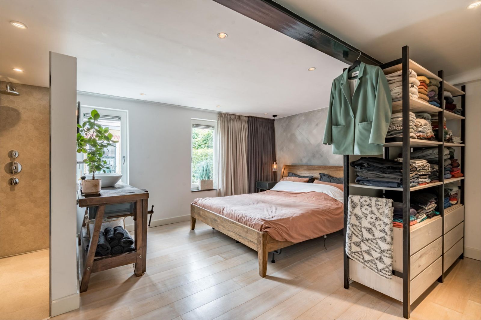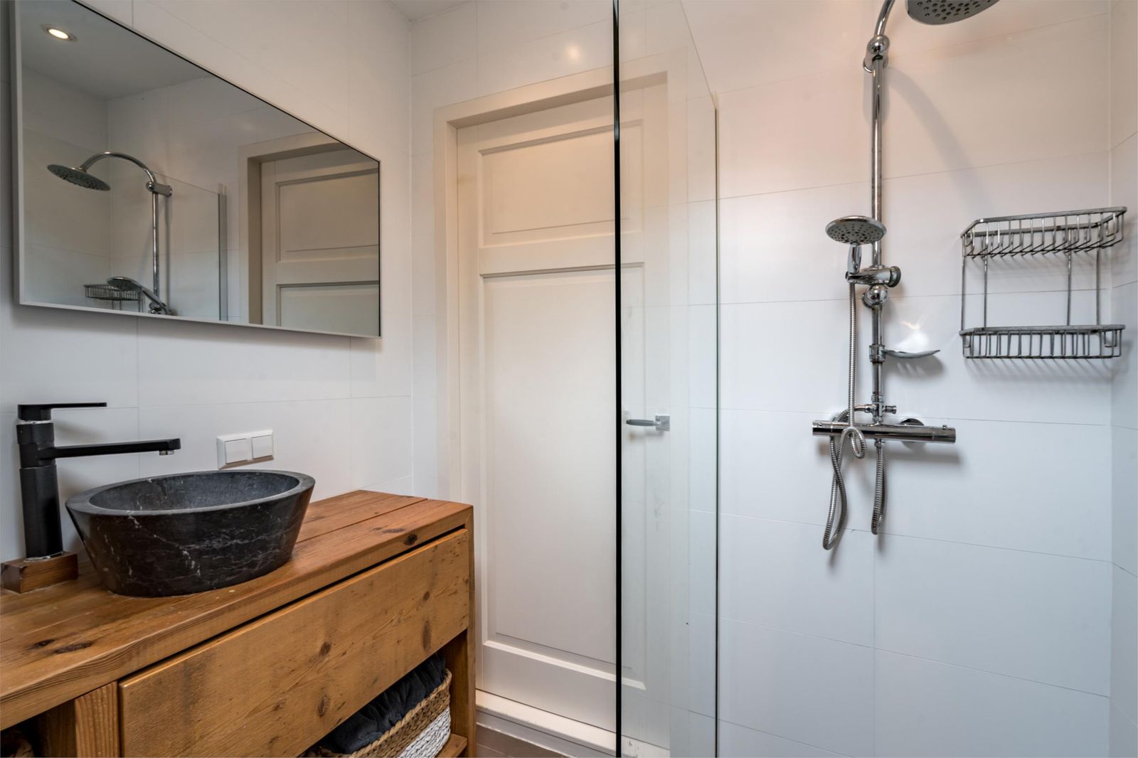 Via de oude achterdeur is er toegang tot de aangebouwde slaapkamer met eigen inloopdouche. De slaapkamer is voorzien van een ruime kastenwand met schuifdeuren over de gehele achterwand (1 meter diep), inbouwspots, radiator en infrarood plafondverwarming.