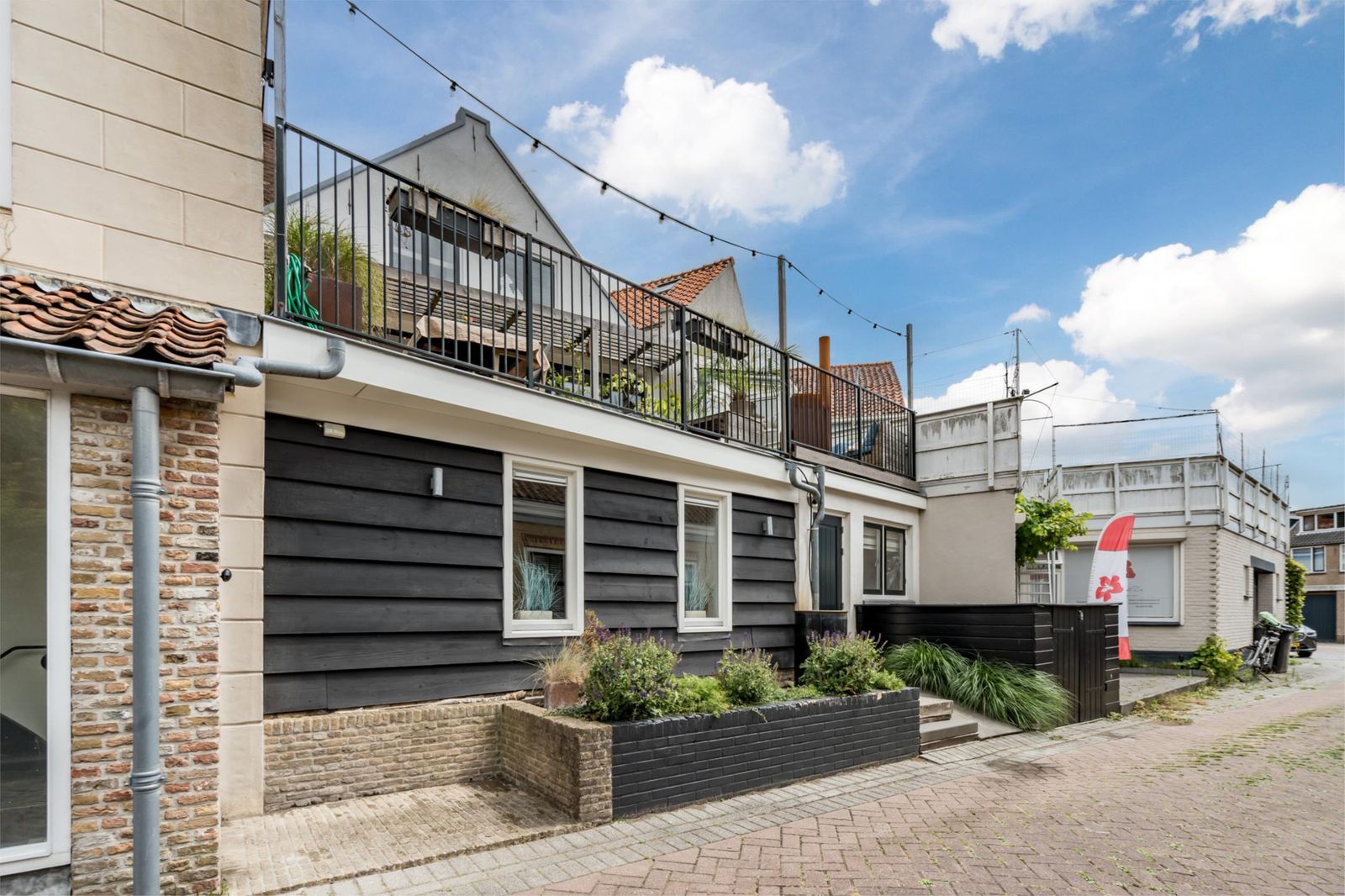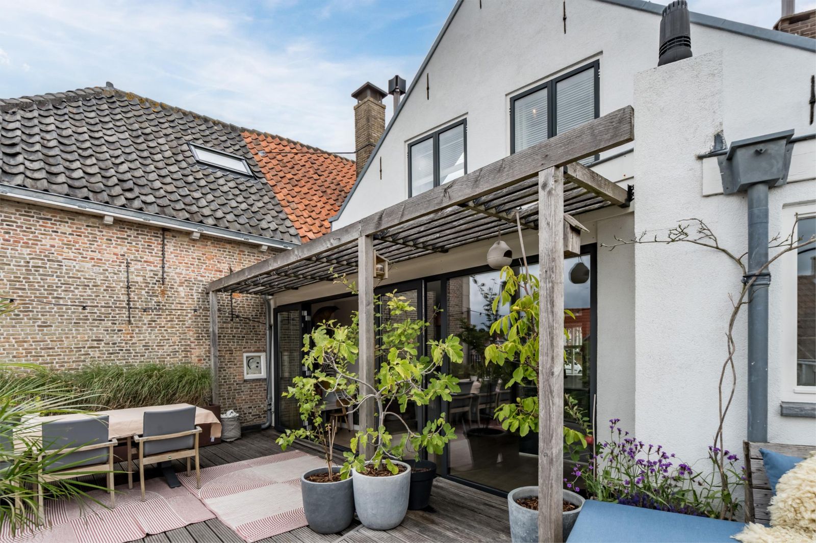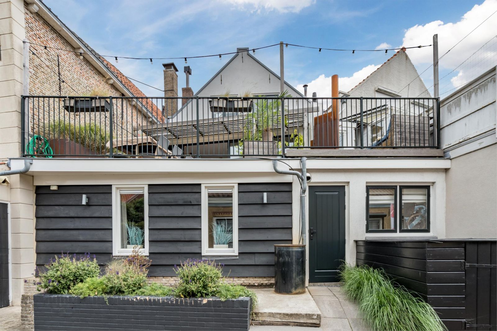 Vanuit de bijkeuken is er tevens toegang tot de smalle achtertuin en de straat aan de achterzijde. Hier bevinden zich een lage schuur voor fietsen en een opstelplaats voor containers.