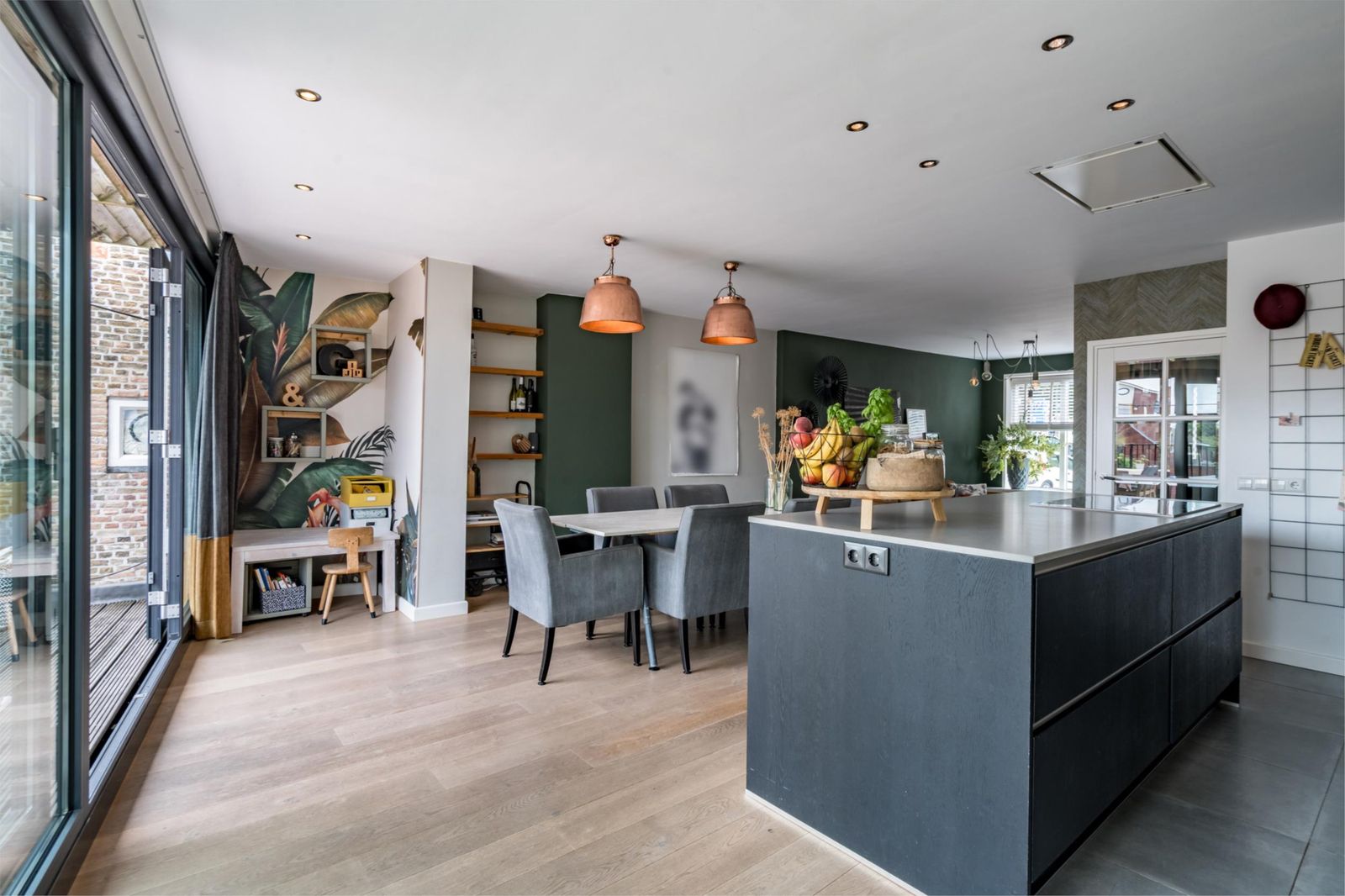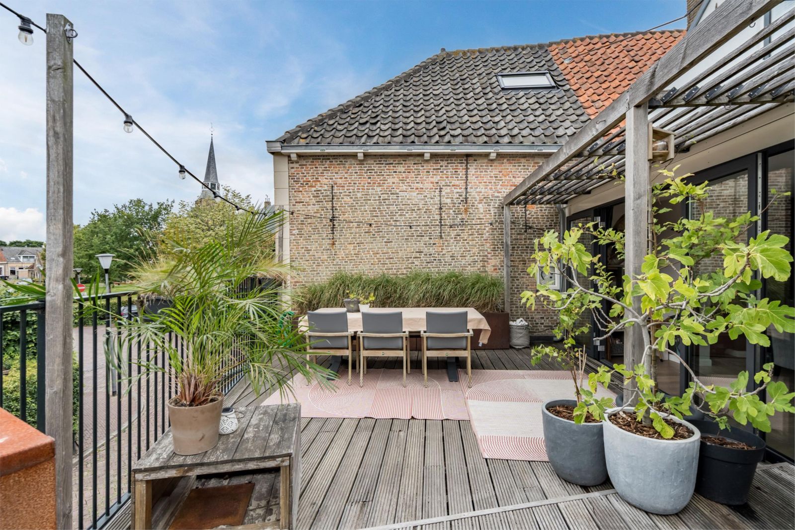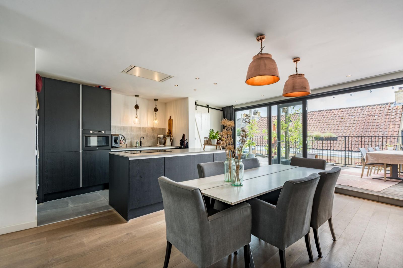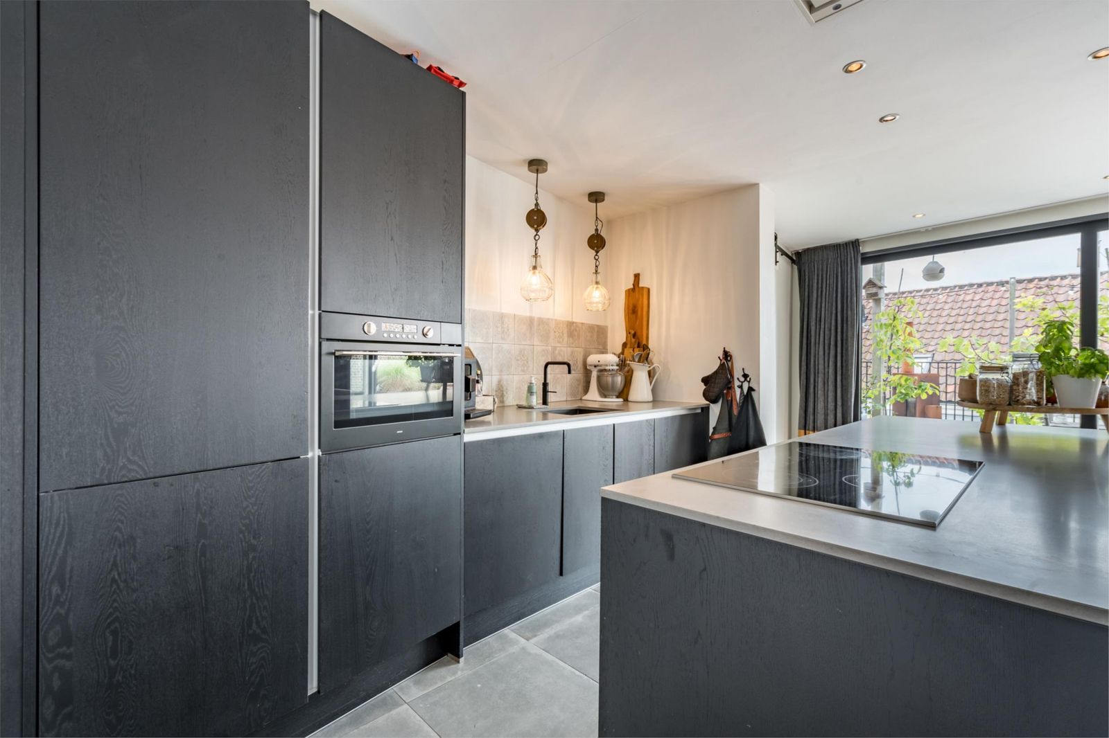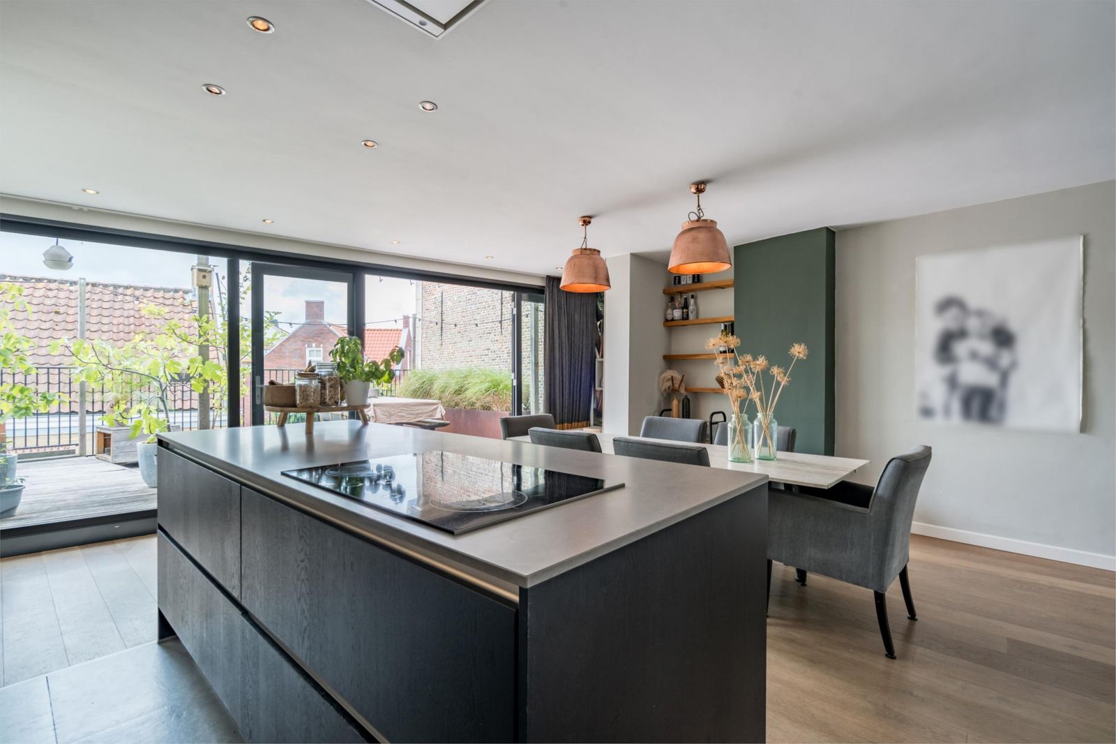 De ruime leefruimte op de begane grond heeft een brede glazen pui naar het gezellige en royale dakterras op het zuiden van maar liefst 35 m², waar je ’s avonds de zon achter de oude kerktoren ziet ondergaan. De stoere zwarte houten keuken met ruim kookeiland is voorzien van moderne apparatuur en biedt veel opbergruimte.