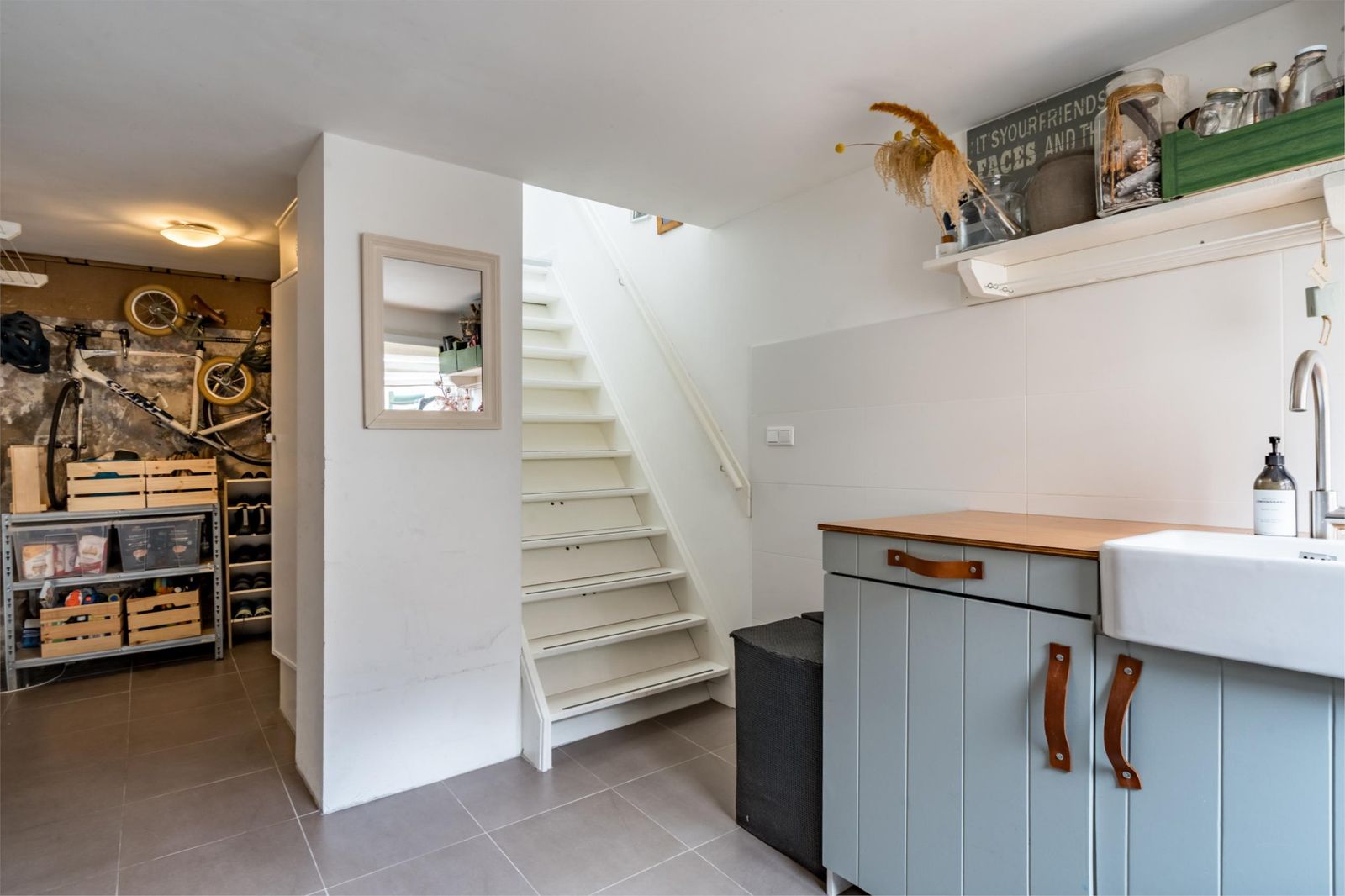 Aan de achterzijde van de leefruimte bevindt zich de trap naar de benedenverdieping met bijkeuken, slaapkamer, douche en kelder.