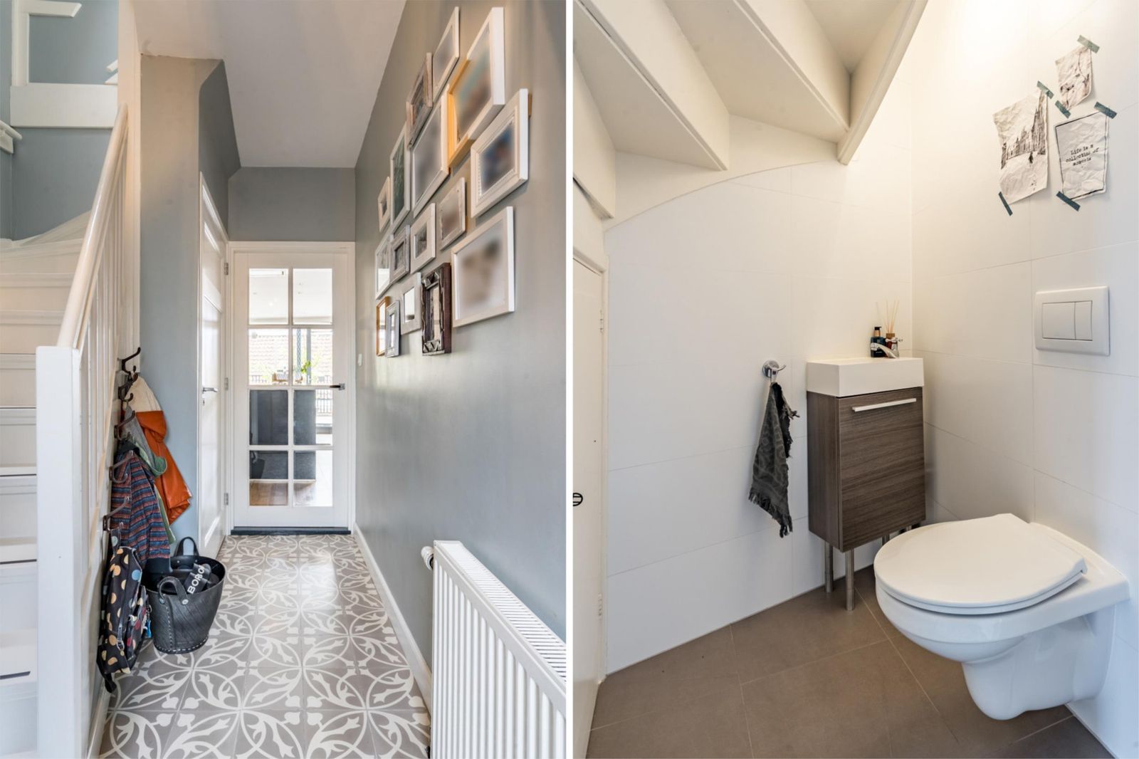Entree/hal voorzien van karakteristieke tegels met vloerverwarming, meterkast en toiletruimte. Vanuit de hal is er toegang tot de trap naar de eerste verdieping.