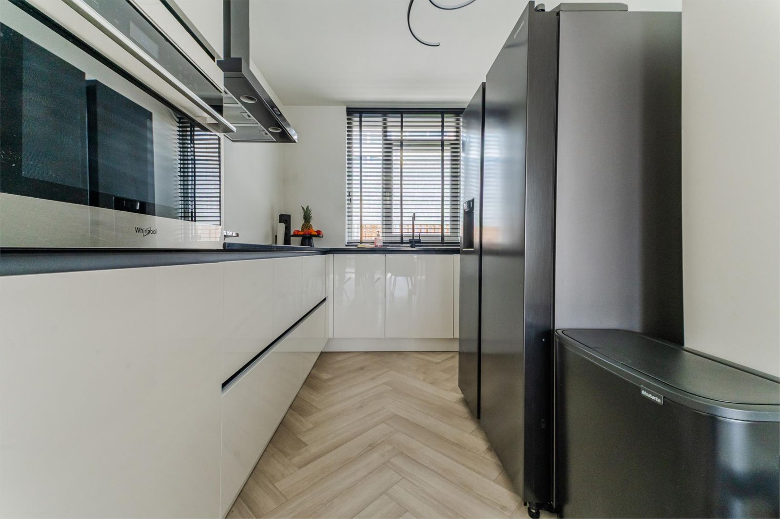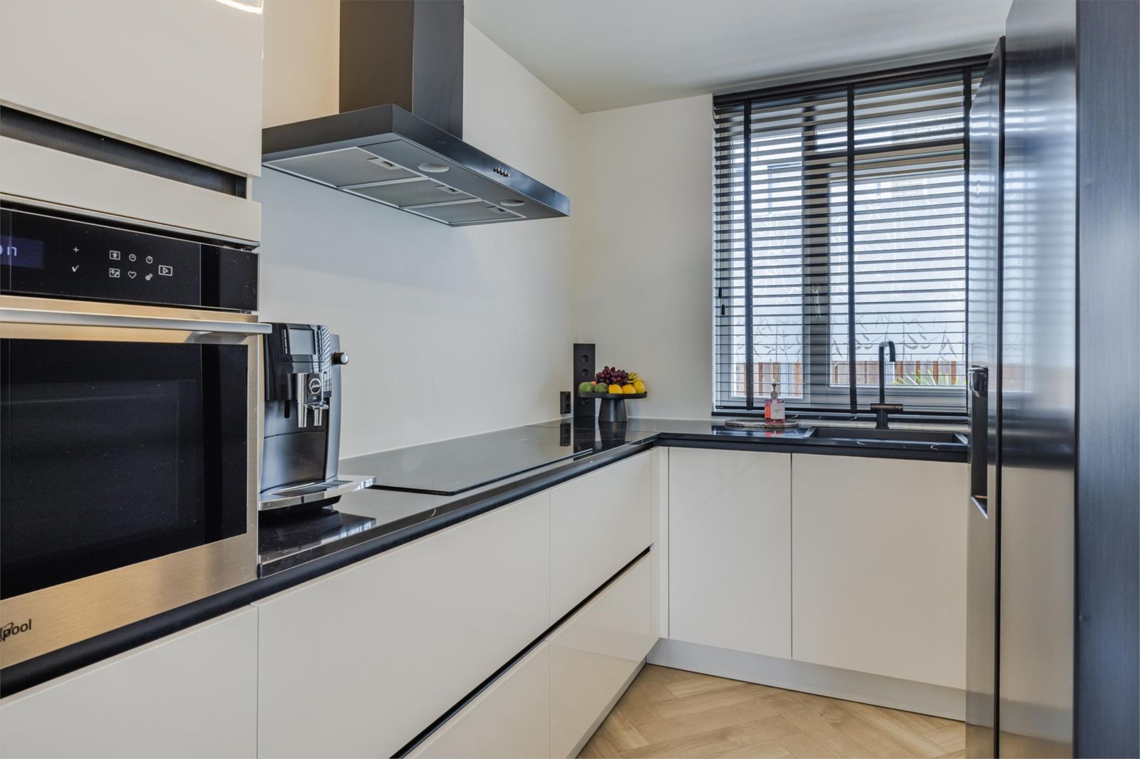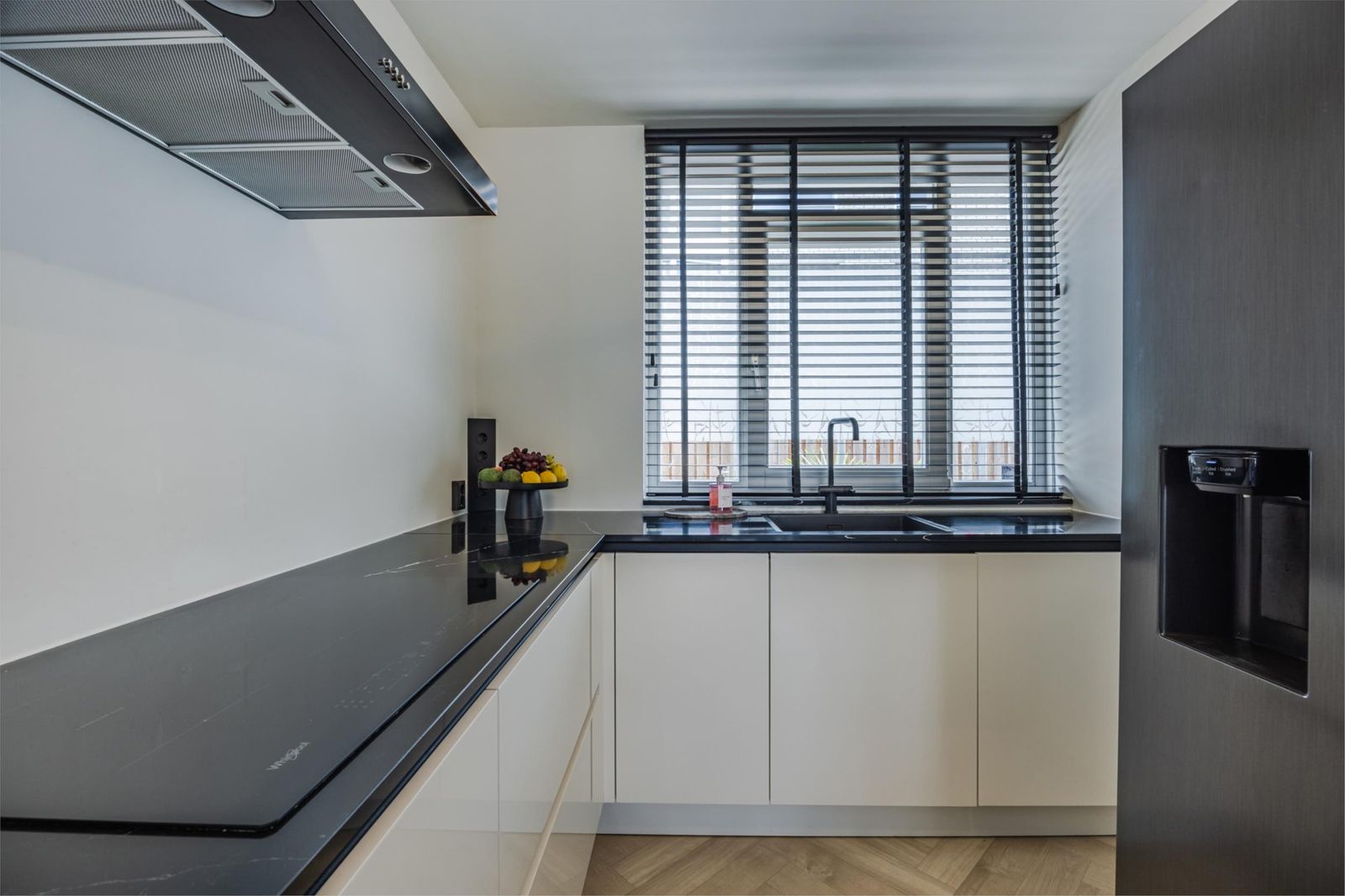 Aan de voorzijde van de woning bevindt zich de strakke, moderne keuken uitgerust met alles wat je nodig hebt: o.a. een 4-pits inductiekookplaat, afzuigkap, combi-oven, vaatwasser en een losstaande Amerikaanse koel-/vriescombinatie. Daarnaast is er genoeg kastruimte voor al je keukengerei en servies.