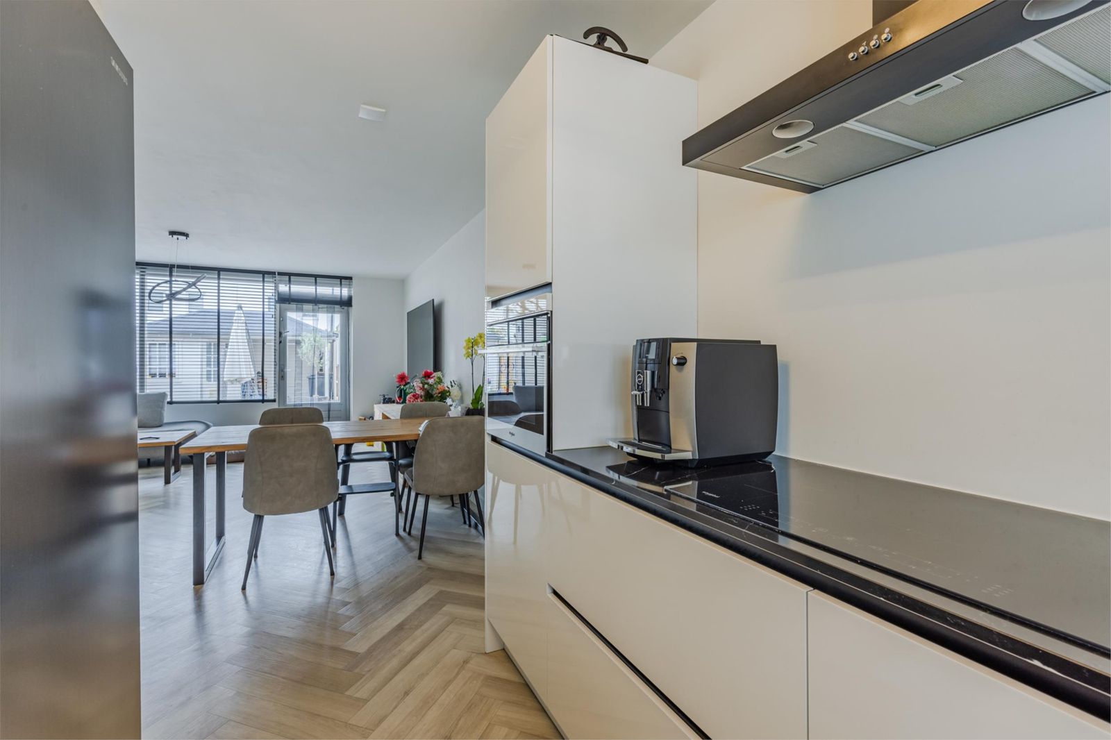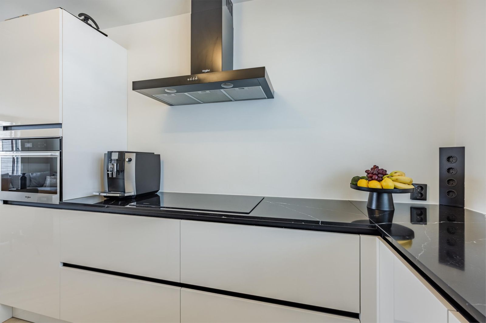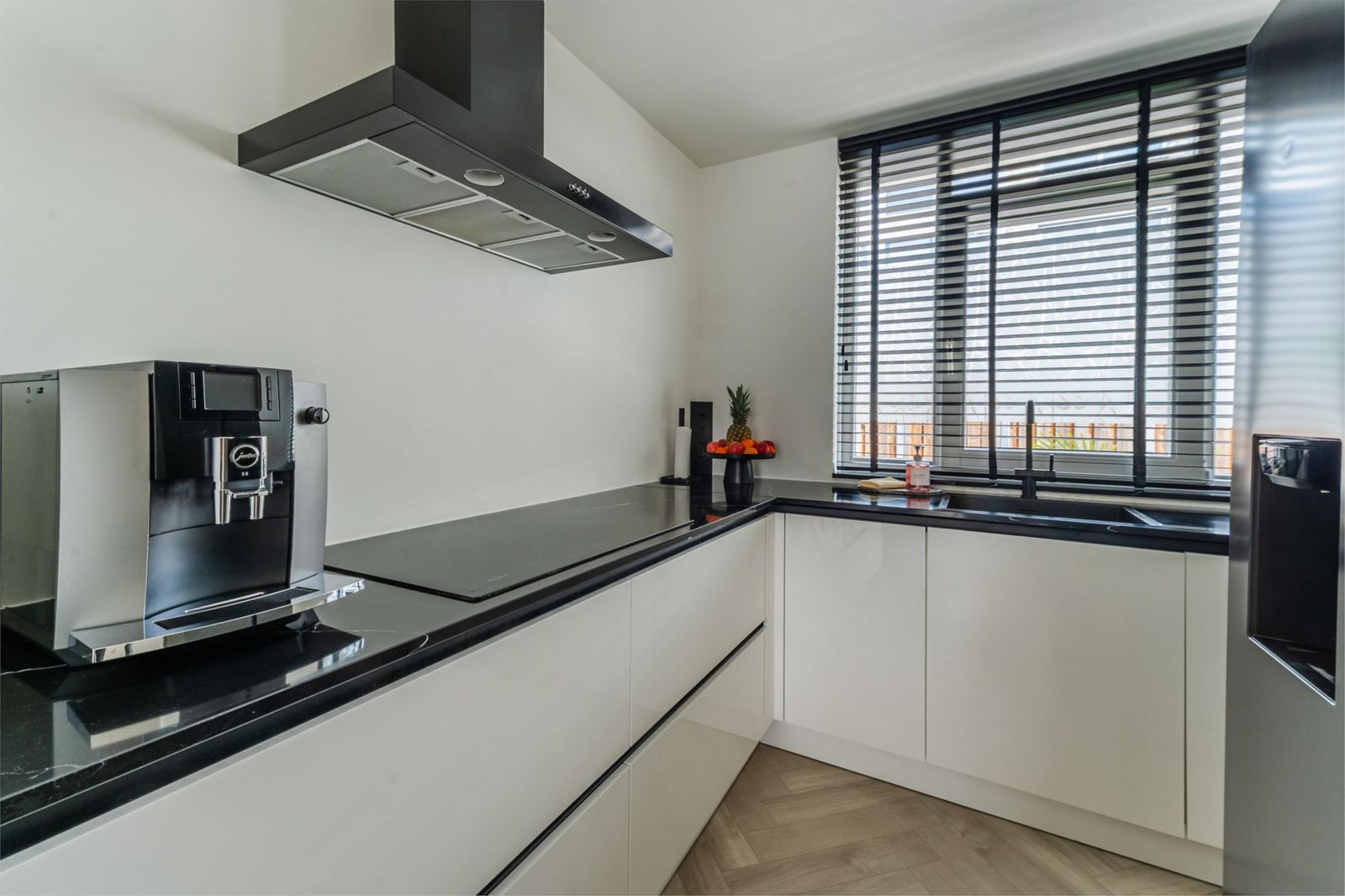 Aan de voorzijde van de woning bevindt zich de strakke, moderne keuken uitgerust met alles wat je nodig hebt: o.a. een 4-pits inductiekookplaat, afzuigkap, combi-oven, vaatwasser en een losstaande Amerikaanse koel-/vriescombinatie. Daarnaast is er genoeg kastruimte voor al je keukengerei en servies.