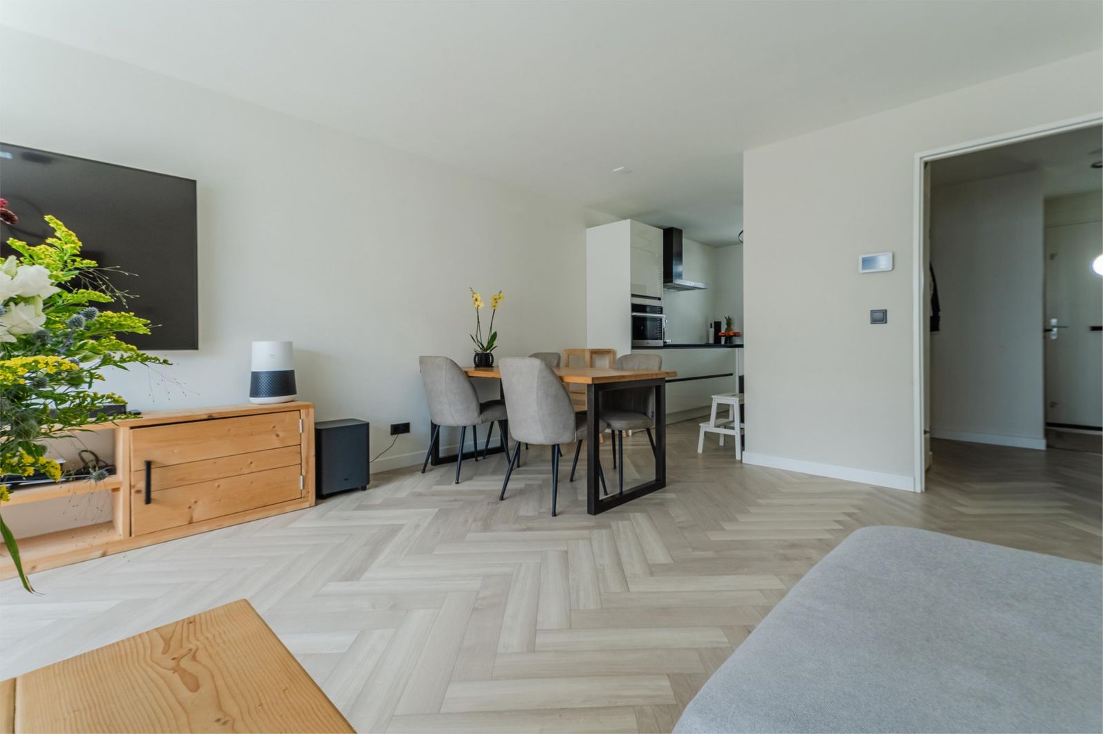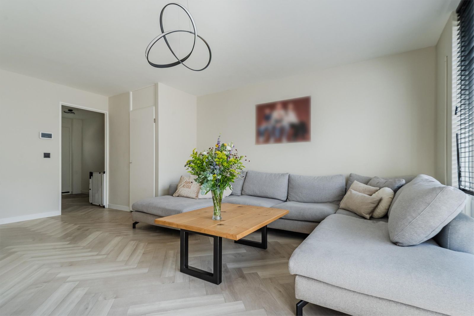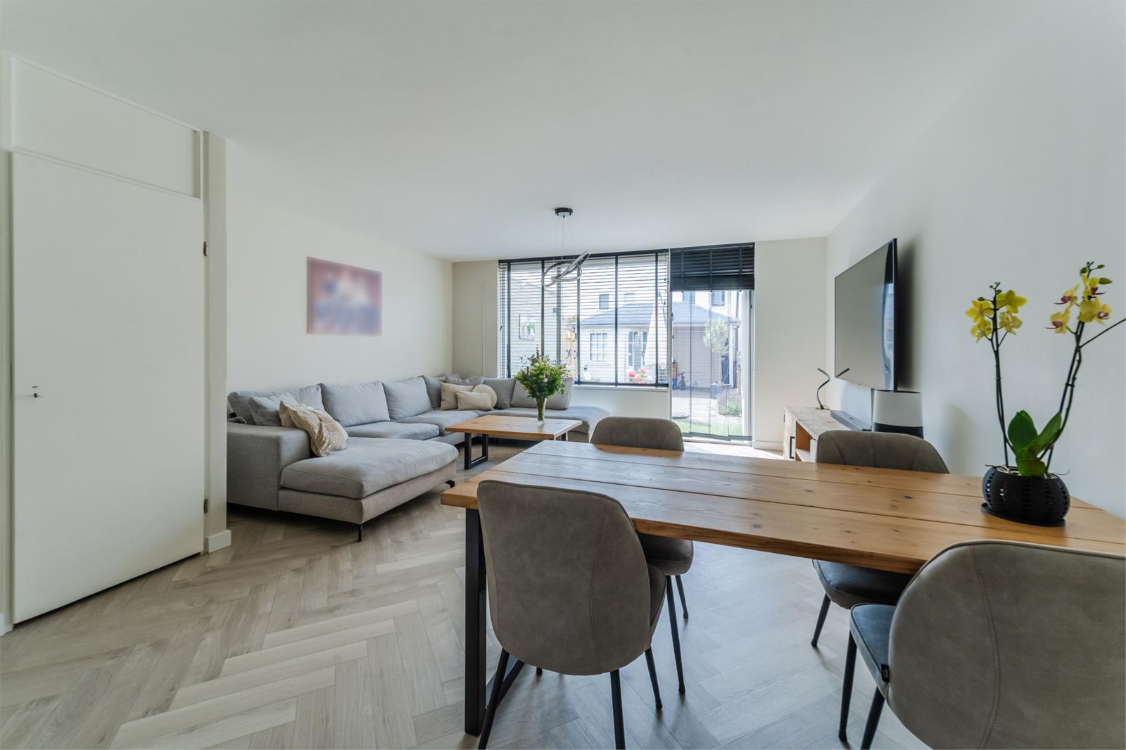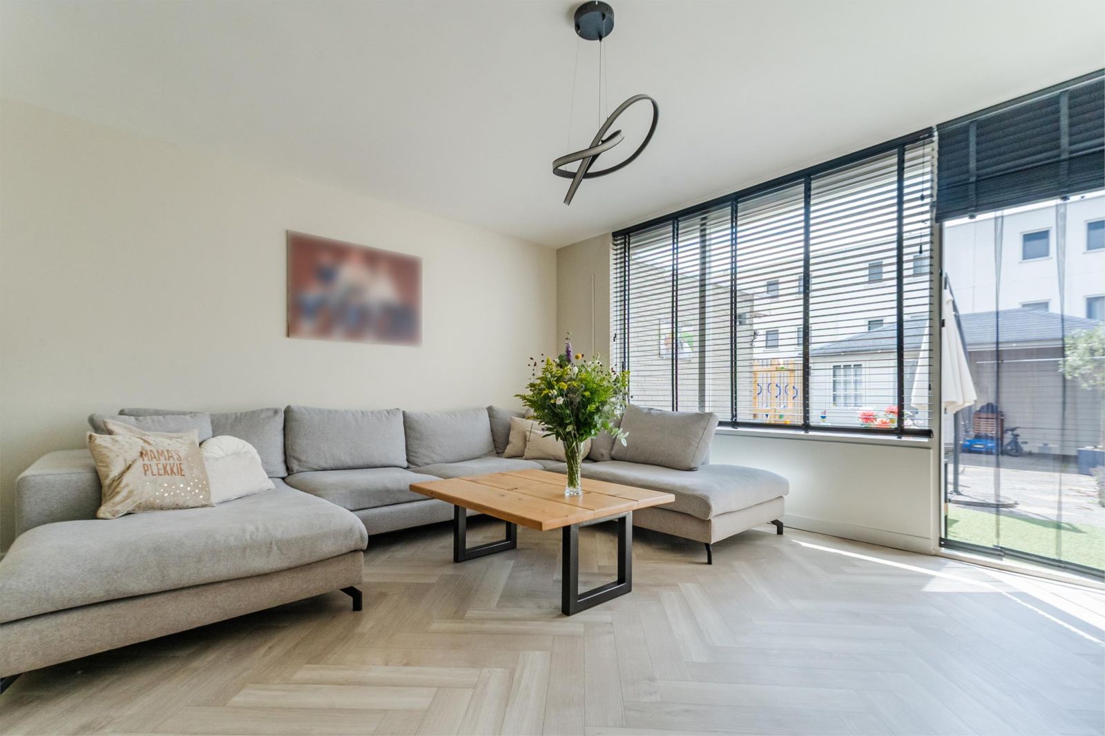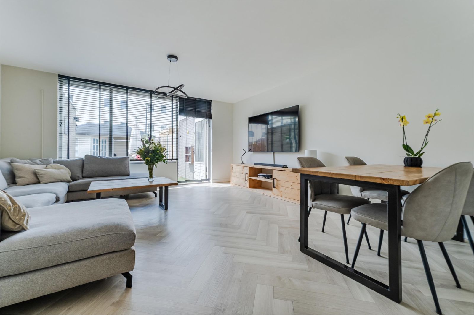 De woonkamer is praktisch en sfeervol ingedeeld, met een gezellige zithoek aan de achterzijde en een eethoek grenzend aan de open keuken. Onder de trap vind je een handige voorraadkast, ideaal voor extra opbergruimte. Dankzij de grote ramen komt het daglicht rijkelijk de woonkamer binnen, wat zorgt voor een prettige en open sfeer.