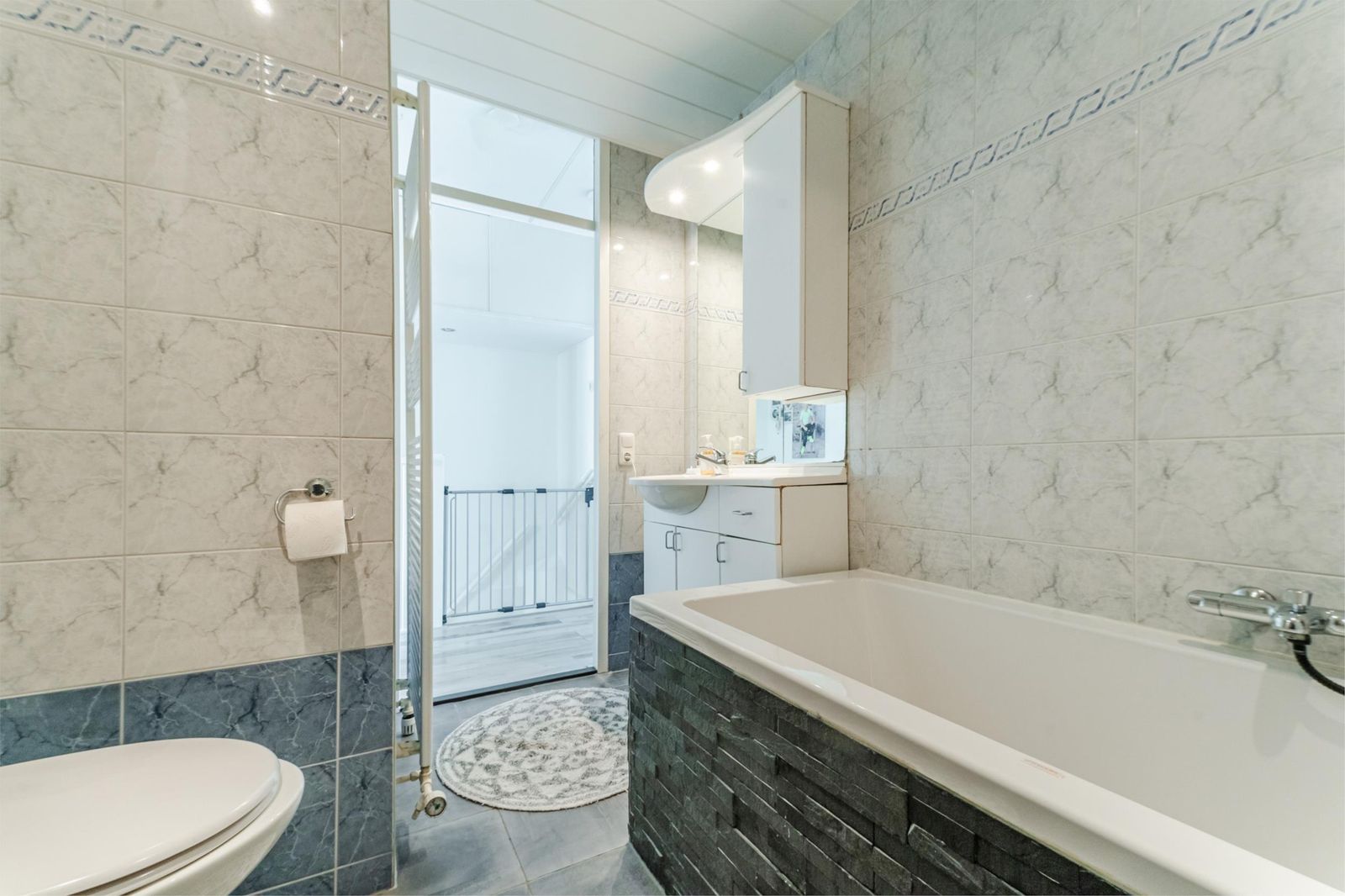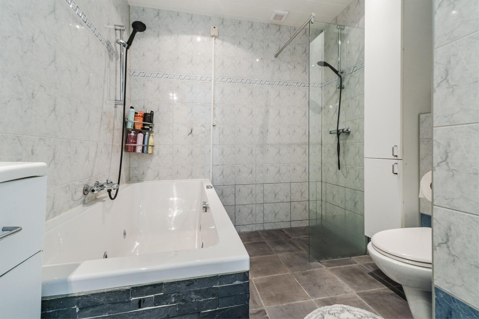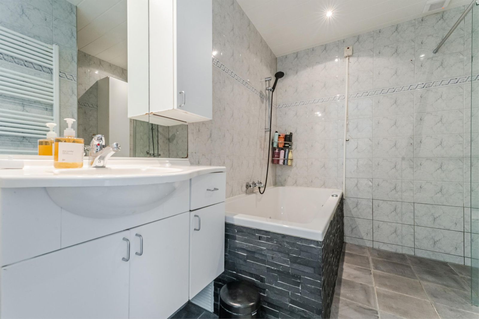 De nette, volledig betegelde badkamer is compleet uitgerust met een stijlvol wastafelmeubel, ruime inloopdouche, ligbad en een tweede zwevend toilet. Direct naast de badkamer vind je de toegang tot de stookruimte met de cv-combiketel. De overloop biedt daarnaast extra bergruimte en toegang tot de praktische wasruimte met aansluitingen voor wasmachine en droger.