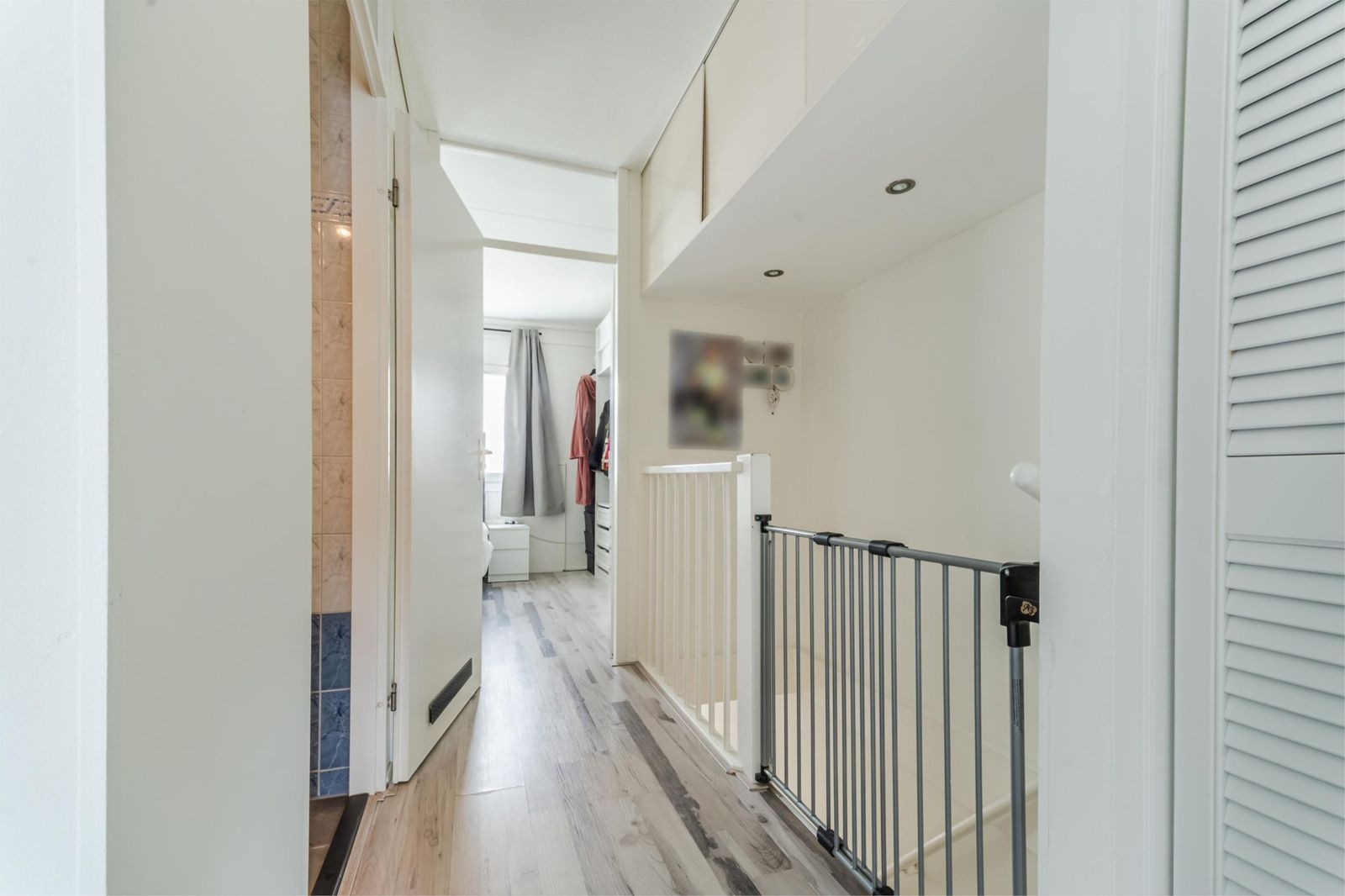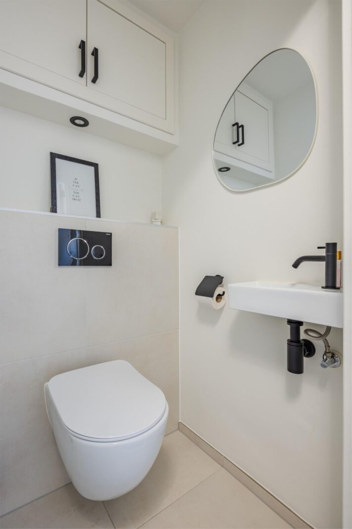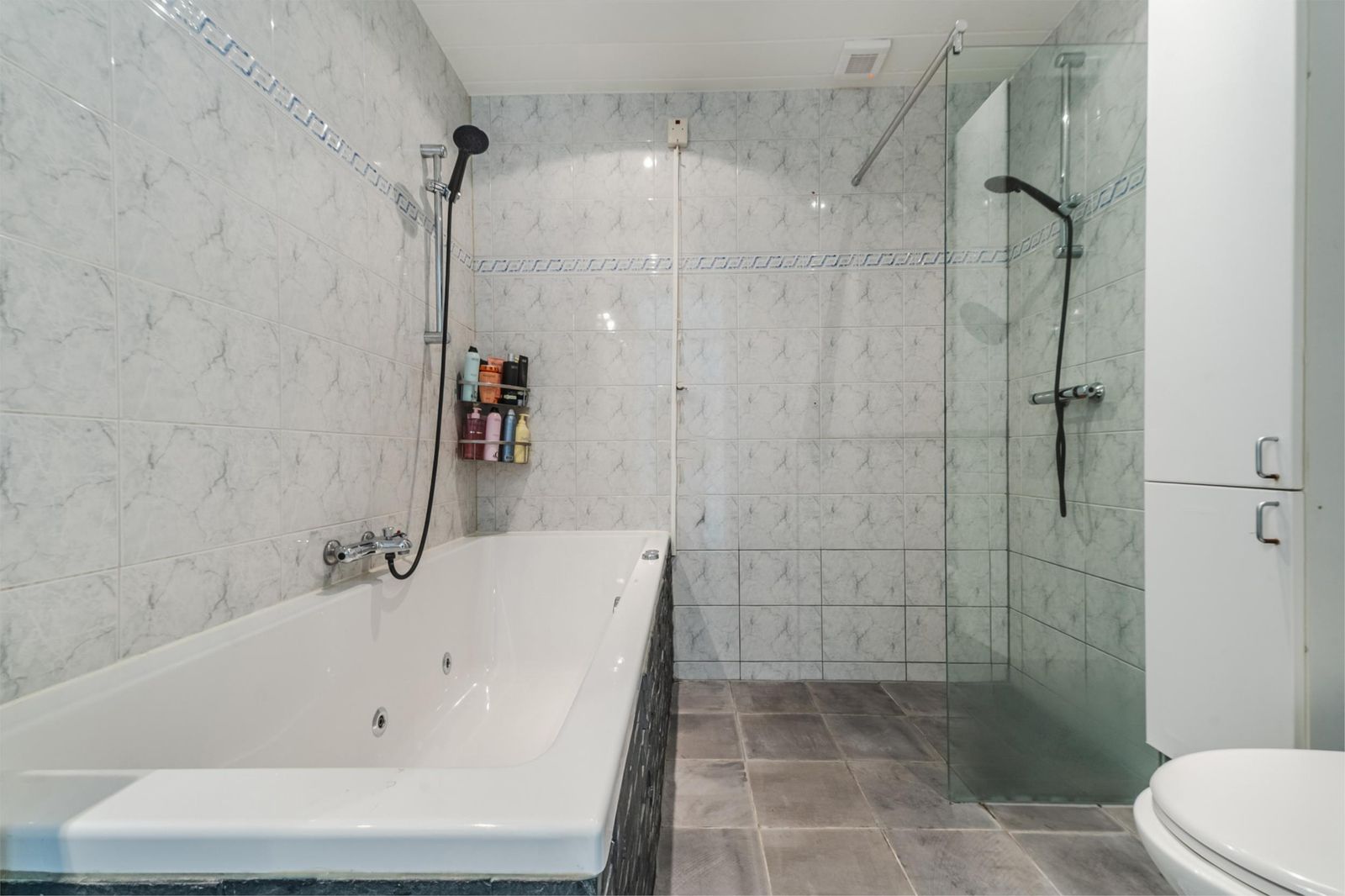 De nette, volledig betegelde badkamer is compleet uitgerust met een stijlvol wastafelmeubel, ruime inloopdouche, ligbad en een tweede zwevend toilet. Direct naast de badkamer vind je de toegang tot de stookruimte met de cv-combiketel. De overloop biedt daarnaast extra bergruimte en toegang tot de praktische wasruimte met aansluitingen voor wasmachine en droger.