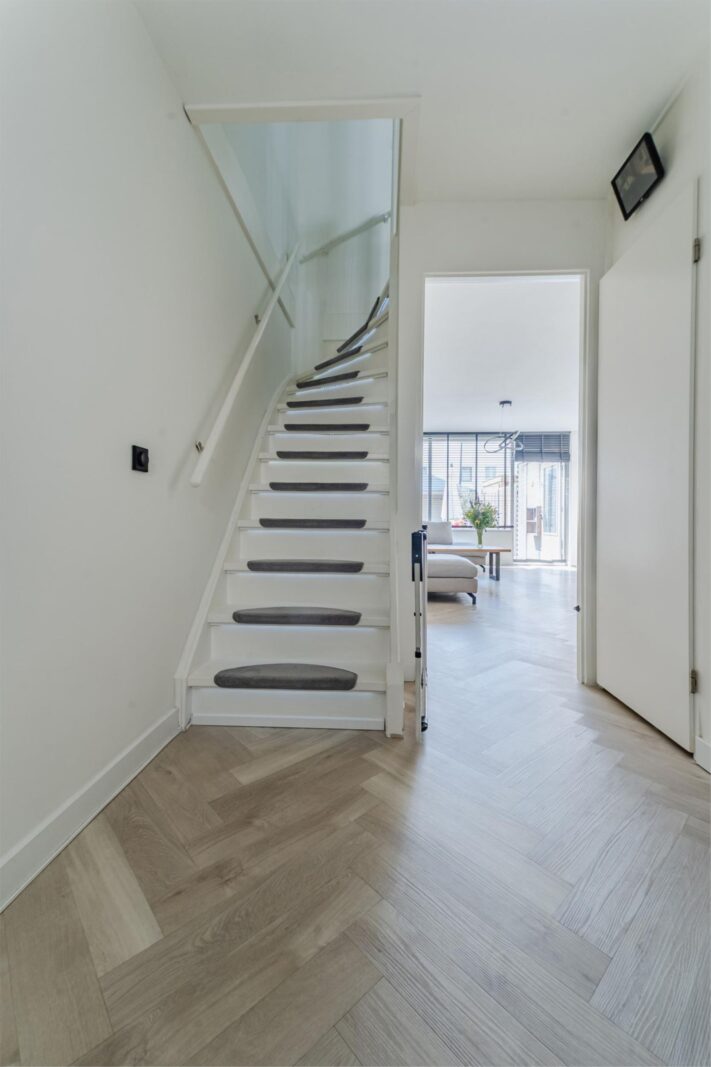 Via de entree kom je in een ruime hal met toegang tot het moderne toilet met zwevend closet en fonteintje, de meterkast en de woonkamer. Vanuit de hal leidt de trap je naar de eerste verdieping.