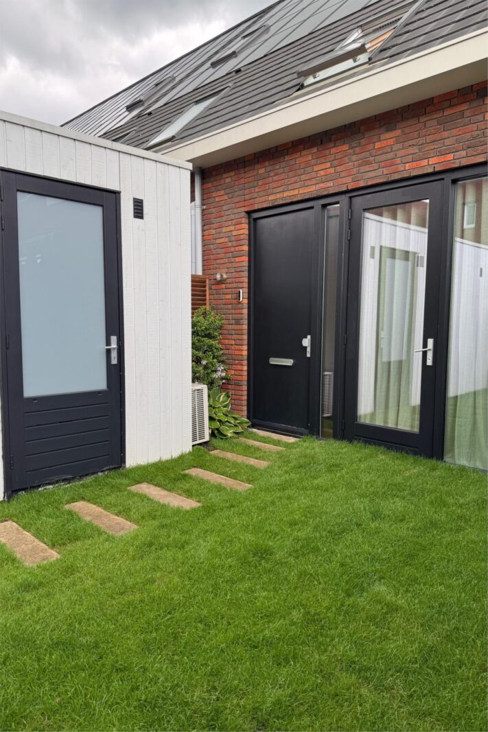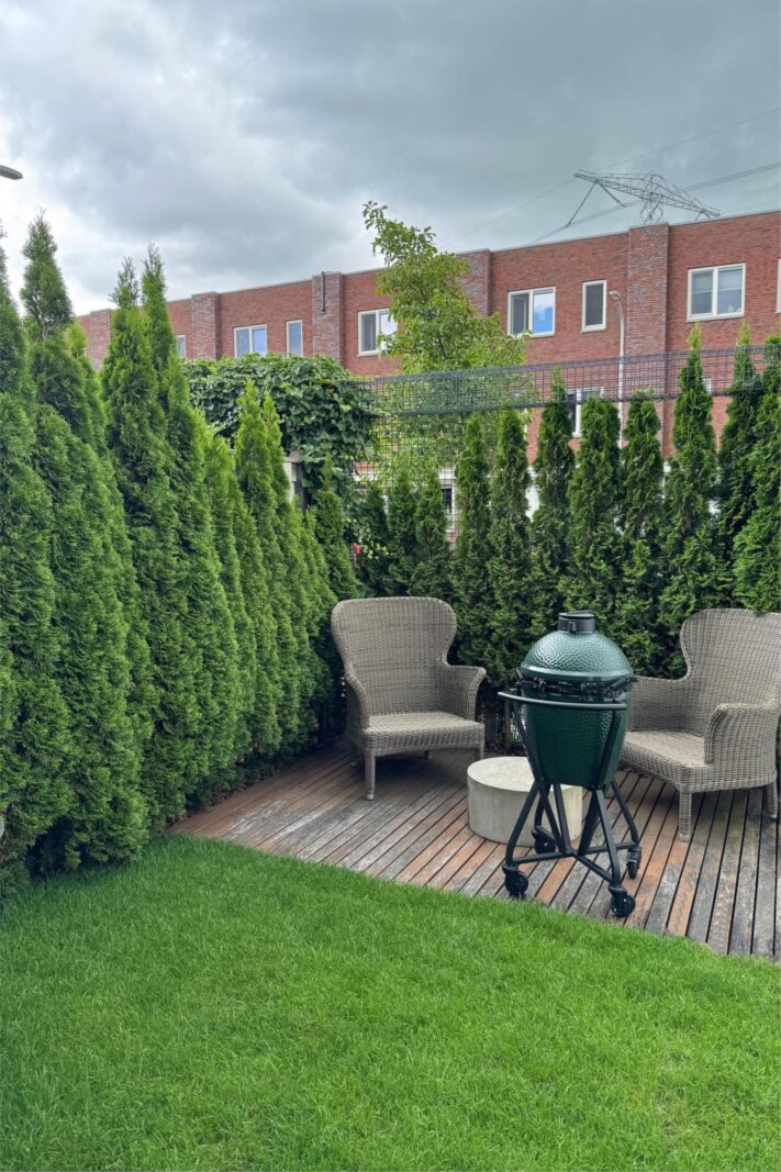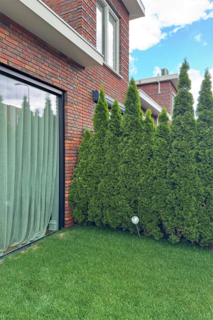 De fraai aangelegde tuin op het zuiden is een groene oase van rust. Een ruime grasmat met looppad vormt het hart van de tuin, die wordt omringd door volgroeide Thuja-bomen die zorgen voor privacy, geluidsdemping en een gevoel van geborgenheid. In de hoek van de tuin bevindt zich een verzonken terras van houten balken, subtiel geïntegreerd in het gazon – perfect voor buitenverlichting, tuinmeubilair of de barbecue. Dankzij de ingebouwde sfeerverlichting geniet u hier ook ’s avonds van een luxe en ontspannen ambiance. Daarnaast beschikt de tuin over een ruime berging, ideaal voor het opbergen van tuinbenodigdheden en gereedschap.