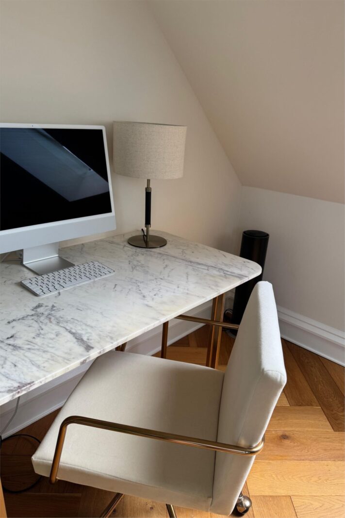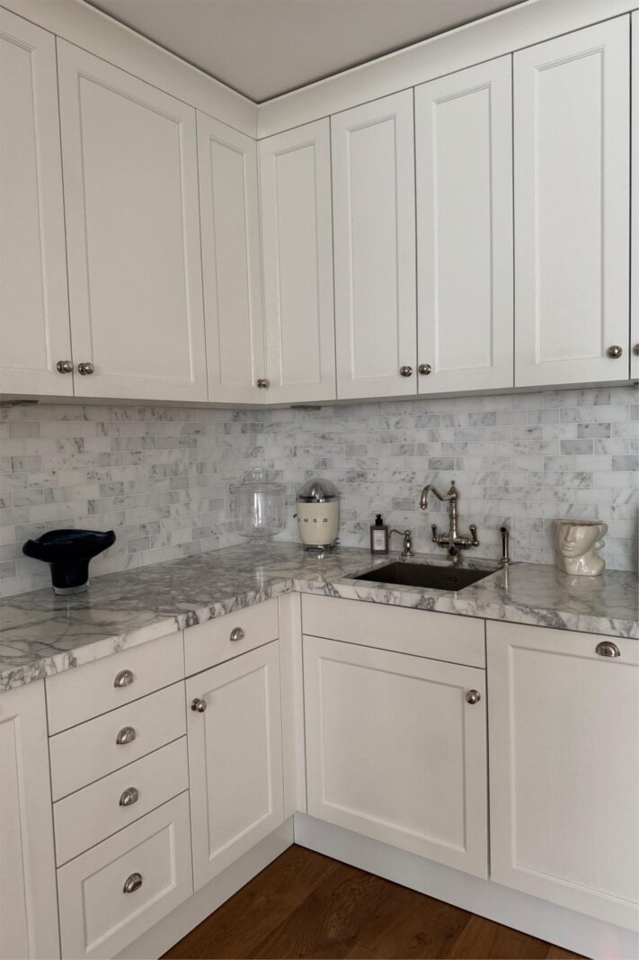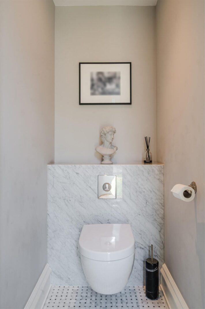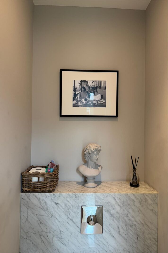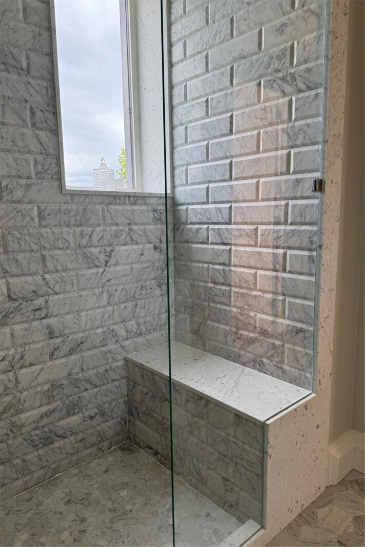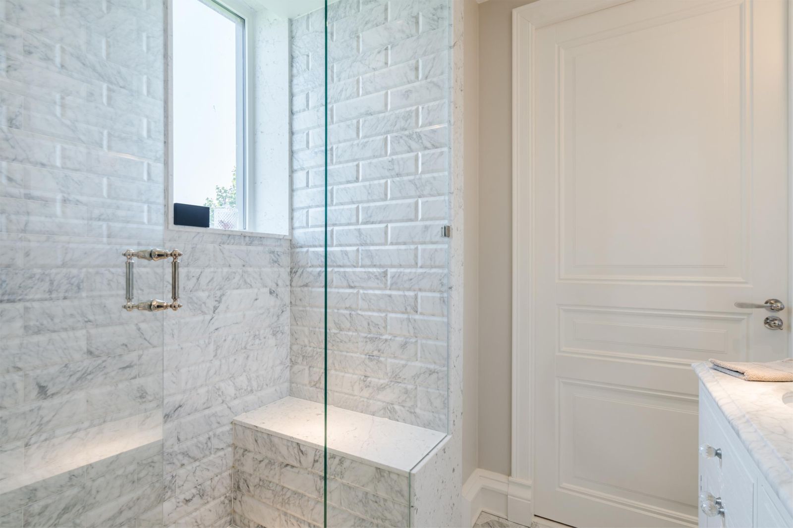 De aangrenzende badkamer is een oase van rust en verfijning, waar luxe materialen en vakmanschap samenkomen. De inloopdouche is vormgegeven met een mix van marmeren soorten: een mozaïekvloer in bloemmotief, Italiaanse marmeren tegels in subway-patroon op de wanden en een zitbankje en omlijsting van Statuario-marmer. De grote glazen wand met deur zorgt voor een open, ruimtelijk gevoel, terwijl geïntegreerde spotlights het marmer subtiel laten oplichten.