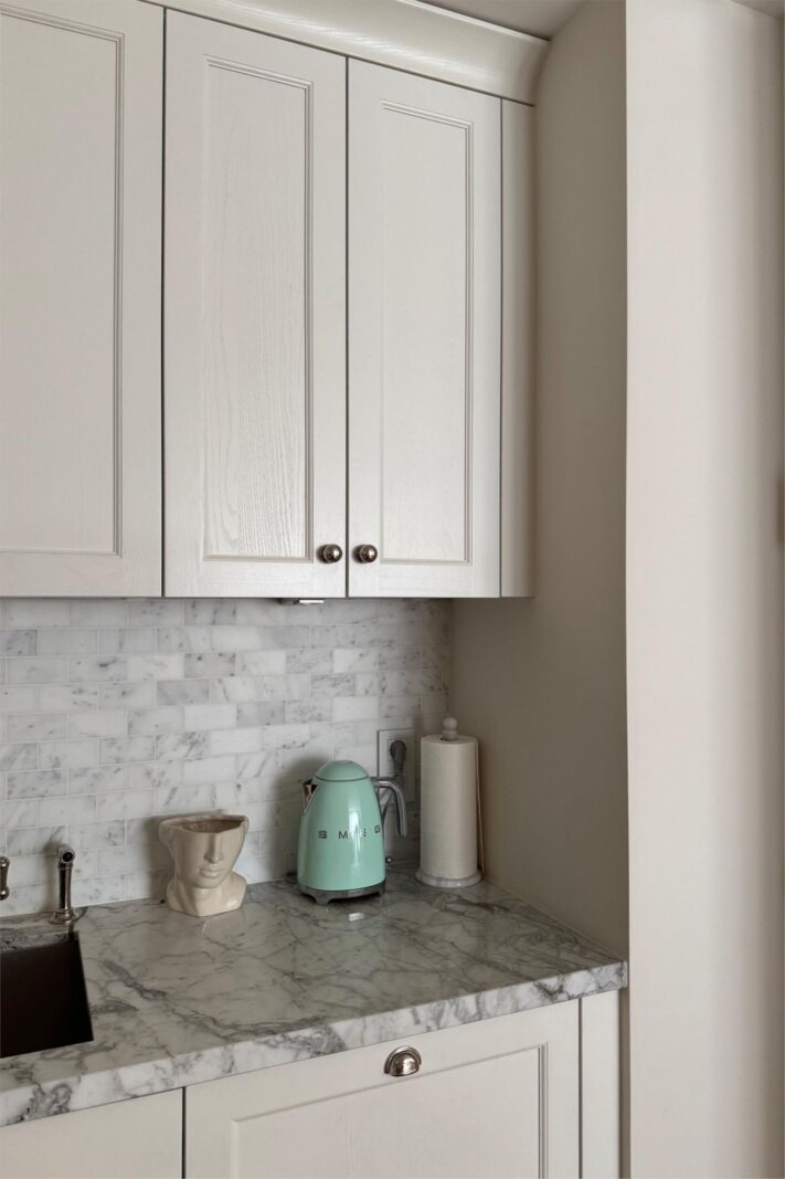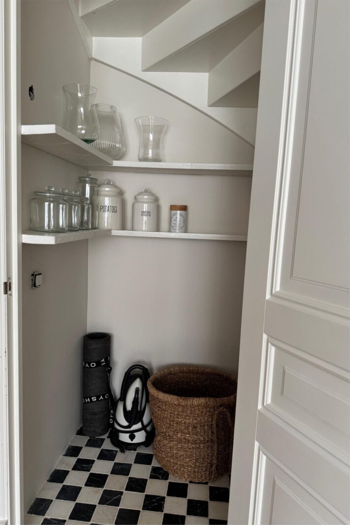 De aangrenzende proviandkast biedt extra opbergruimte dankzij de praktische wandplanken en een geïntegreerde Miele was-droogcombinatie, fraai ingebouwd met extra bergruimte rondom. De vloer is uitgevoerd in een klassiek zwart-wit marmeren tegelpatroon, wat de ruimte een tijdloze uitstraling geeft.