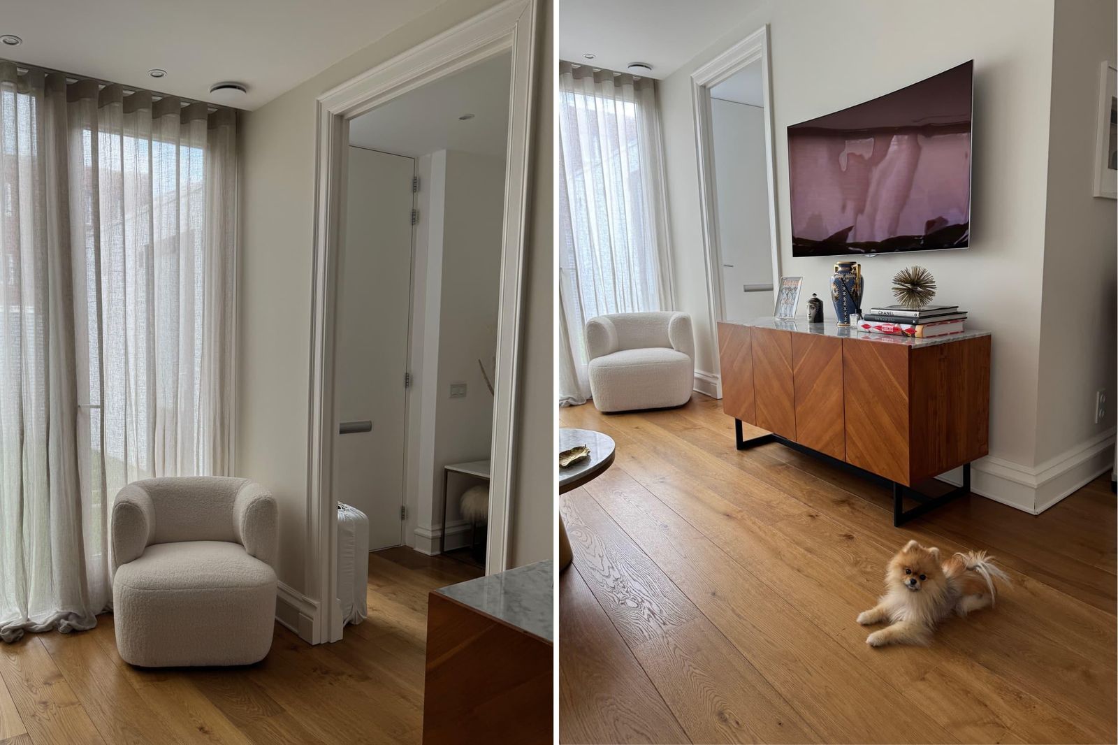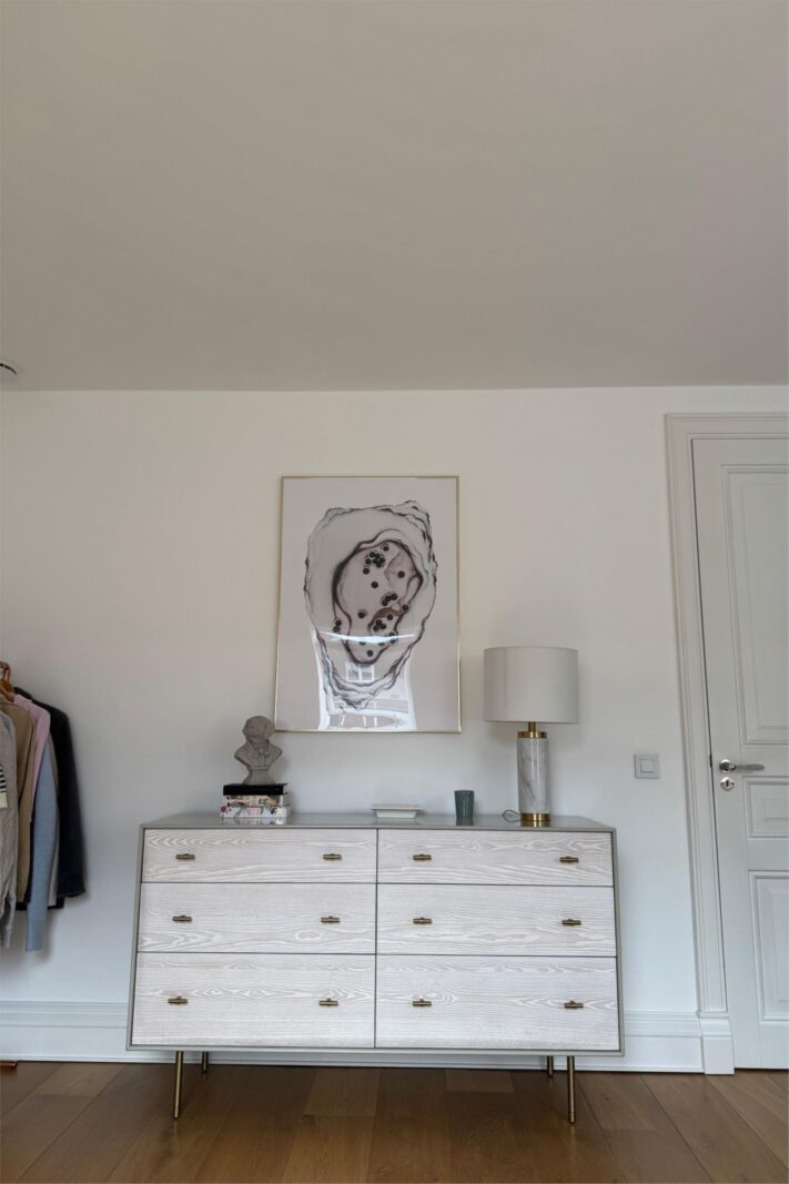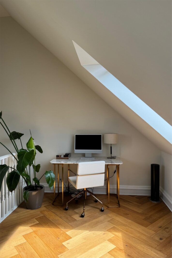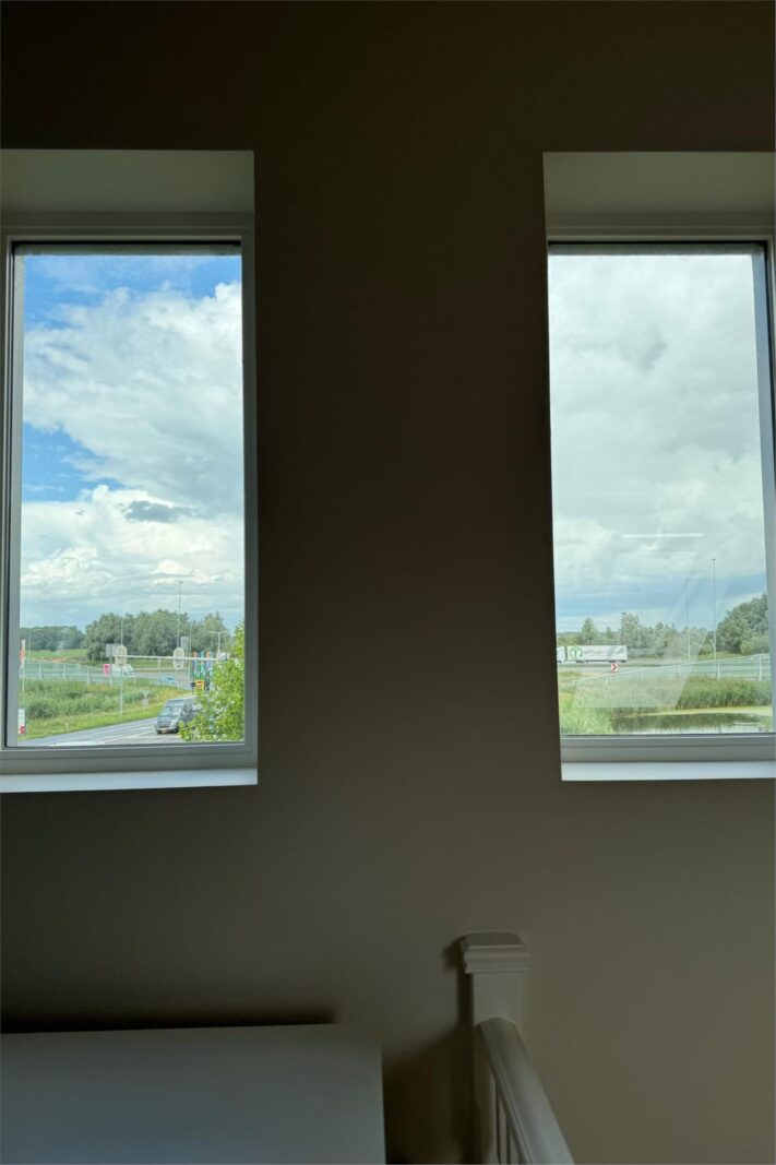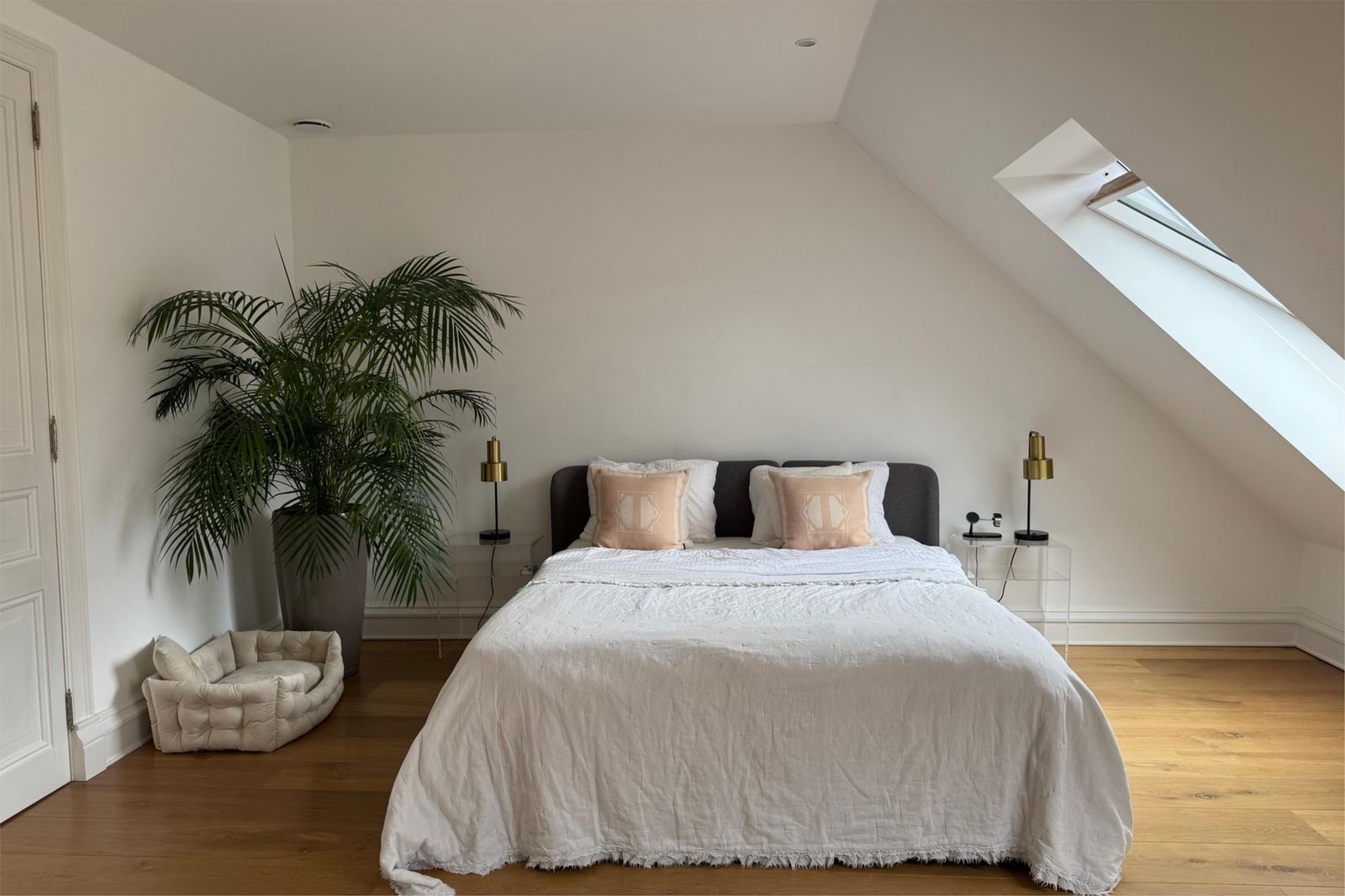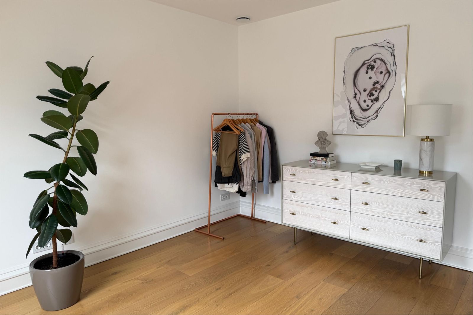 Op de eerste verdieping bevindt zich de exclusieve en ruime slaapkamer, ingericht met een queen-size bed met geïntegreerde opbergruimte, een houten dressoir met zes lades en een doorlopende parketvloer die warmte en rust uitstraalt. Twee grote ramen zorgen voor een overvloed aan natuurlijk licht, waardoor de kamer een serene en uitnodigende sfeer krijgt. Zowel de hal, slaapkamer als badkamer zijn voorzien van Philips Hue-spotverlichting, waarmee een zorgvuldig lichtplan met indirecte lichtbronnen is gecreëerd voor een sfeervolle ambiance op elk moment van de dag.
