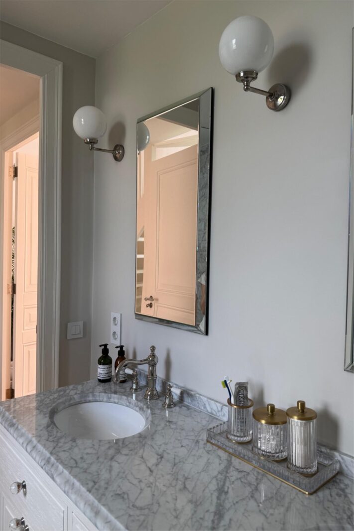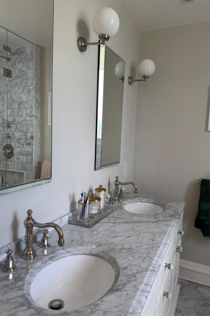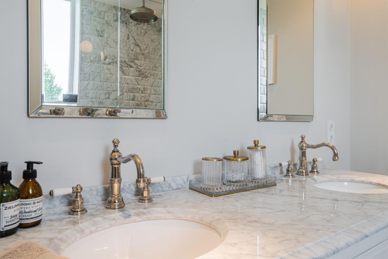 Het wastafelmeubel in Franse stijl, vervaardigd uit massief natuurhout met een marmeren blad, biedt royale opbergruimte en is voorzien van twee Perrin & Rowe Edwardian-kranen met sierlijke column spout en metalen hendelgrepen in gepolijst nikkel. Boven het meubel hangen twee grote spiegels die de ruimte extra diepte en licht geven. Deze combinatie van ambachtelijke materialen, Engelse elegantie en hoogwaardige marmeren afwerking creëert een serene, bijna spa-achtige sfeer.