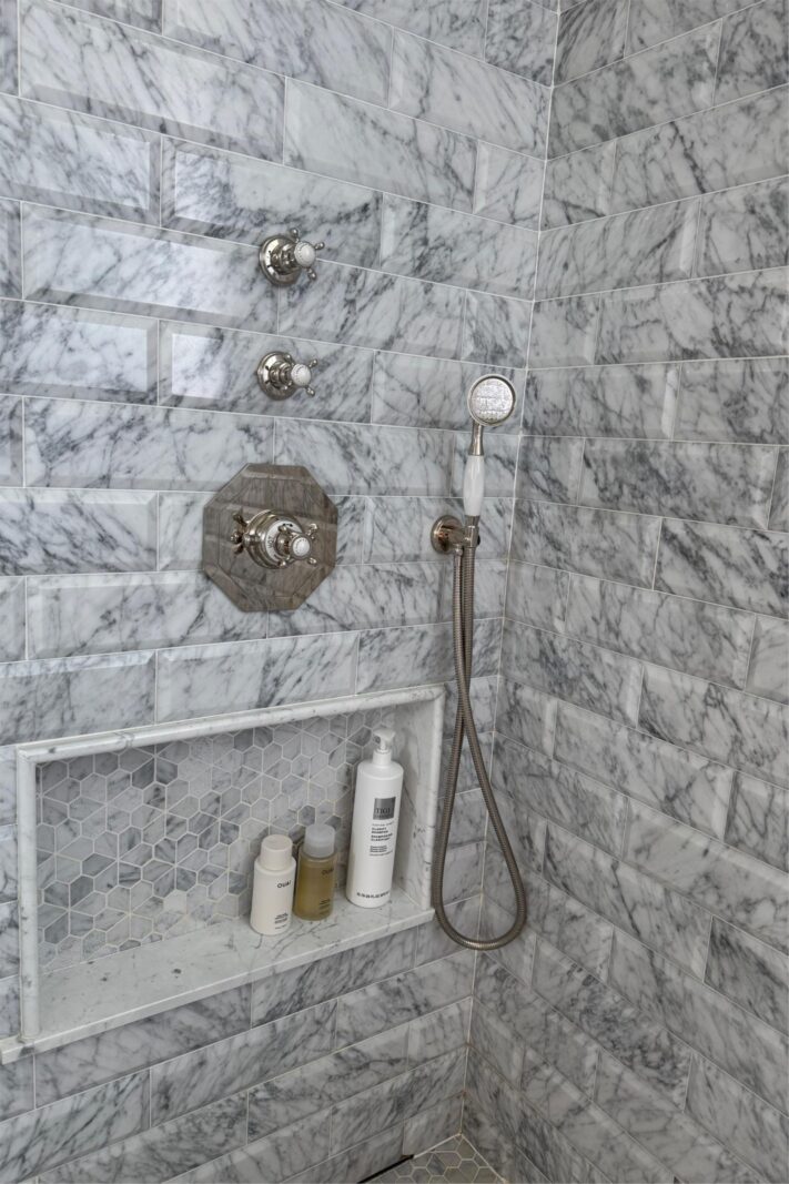 De drie-delige douche van Perrin & Rowe – met hand-, muur- en regendouche – wordt aangevuld met accessoires van THG, Lefroy Brooks en Perrin & Rowe, allen uitgevoerd in gepolijst nikkel voor een perfect afgestemd geheel. De douche beschikt over een niche voor verzorgingsproducten, en de gehele badkamer is voorzien van vloerverwarming voor extra comfort. Een groot raam zorgt bovendien voor overvloedig daglicht, wat de serene sfeer van deze ruimte versterkt.