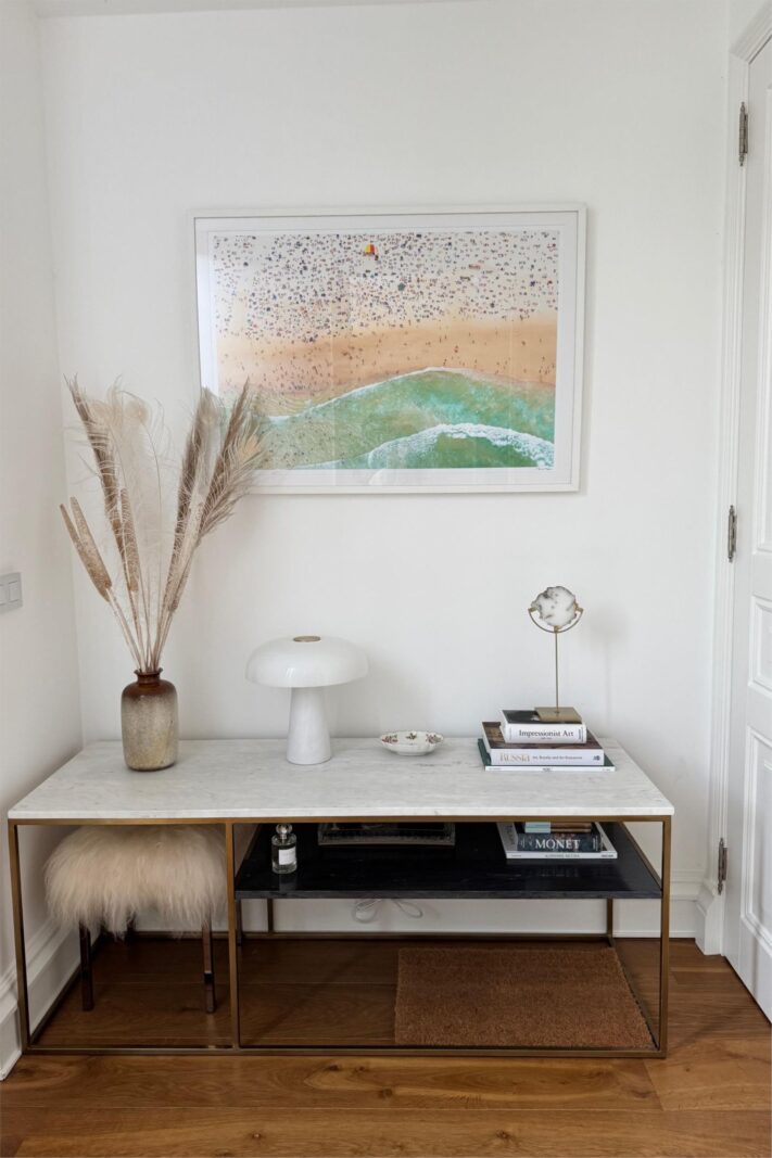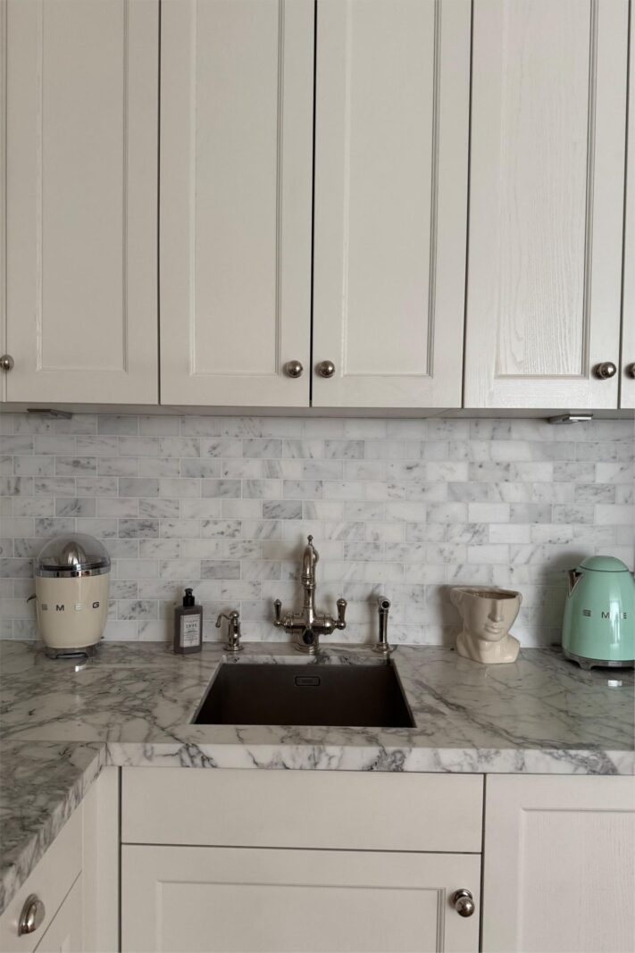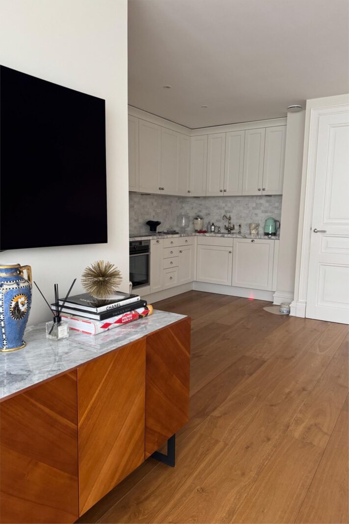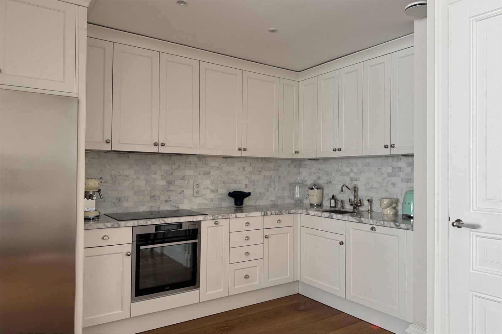 De open farmhouse-style woonkeuken is een waar culinair paradijs, uitgevoerd in een hoogwaardige hoekopstelling met een exclusief Statuario marmeren werkblad en een achterwand van marmeren mozaïektegels in subway-patroon. De keuken biedt uitzonderlijk veel bergruimte en is uitgerust met premium inbouwapparatuur uit de AEG Mastery Collection. De op maat ontworpen keuken is vervaardigd uit natuur eikenhout en voorzien van exclusieve handgrepen van Armac Martin (Cotswold-collectie) in gepolijst nikkel. Centraal in de keuken staat de Perrin & Rowe Provence 3-in-1 heetwaterkraan, geïnspireerd op klassieke Franse landhuisstijl. De combinatie van gepolijst nikkel, geïntegreerde handkraan en zeeppomp maakt dit ontwerp even praktisch als verfijnd – perfect voor het bereiden van warme dranken of het vullen van pannen met kokend water. Samen met de royale spoelbak van Franke vormt dit het stijlvolle middelpunt van de keuken.