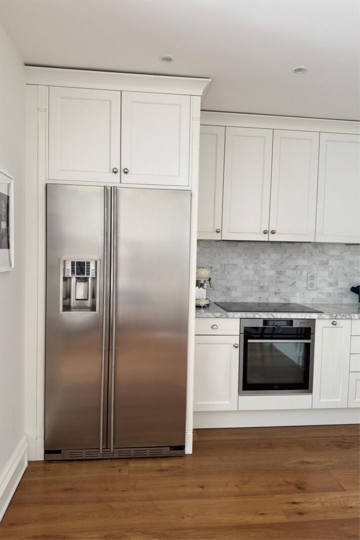 De keuken wordt vervolmaakt door een GE Side-by-Side Amerikaanse koelkast in roestvrij staal, uitgerust met een geïntegreerde ijs- en watervoorziening, in hoogte verstelbare glazen legplanken, heldere LED-verlichting en specifieke vershoudzones voor groenten, fruit en vlees. Een combinatie van omvang, comfort en design die naadloos aansluit bij het hoogwaardige karakter van deze keuken.