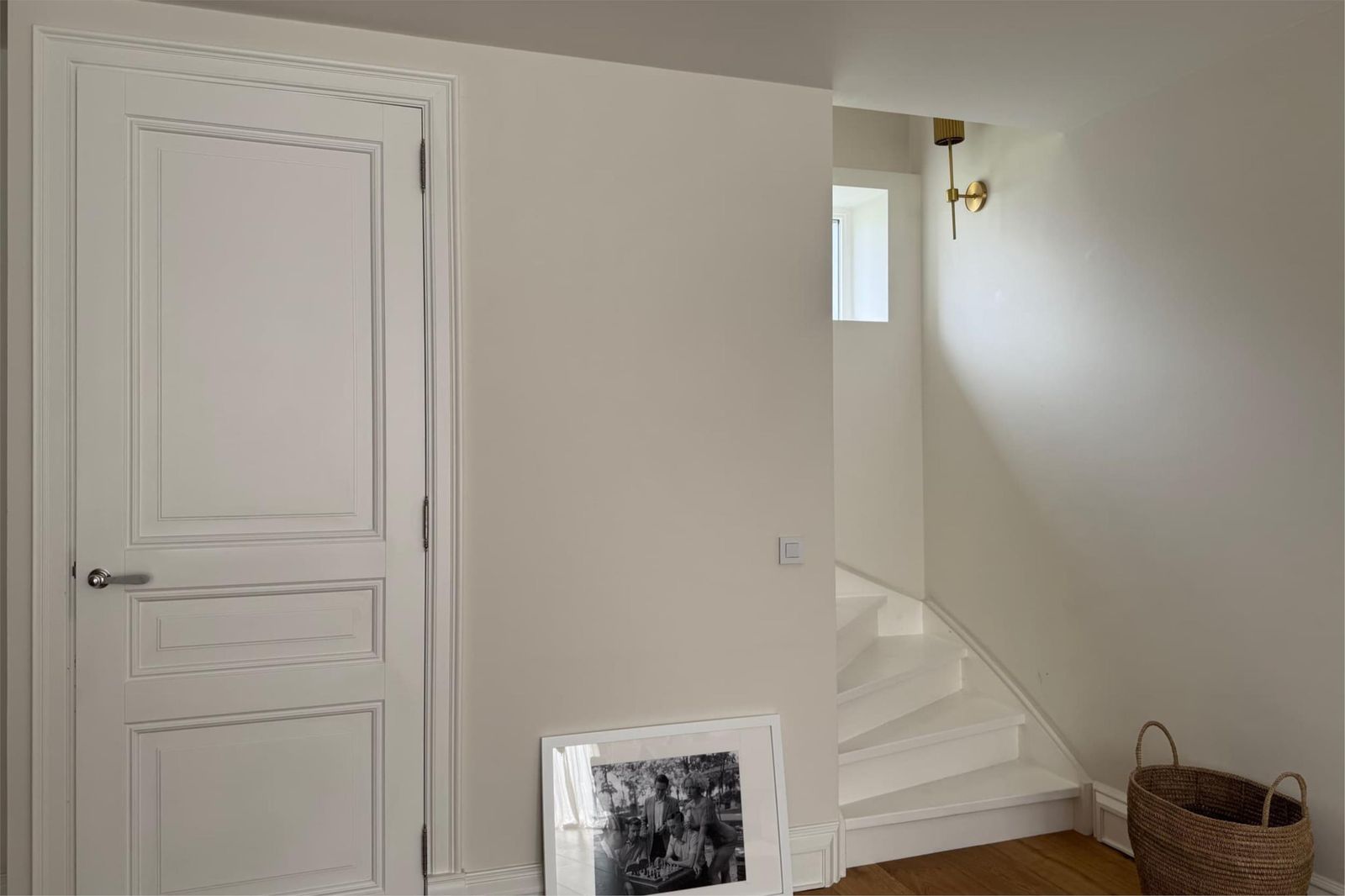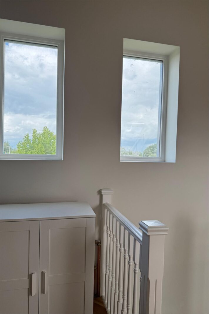 De vaste trap leidt naar de ruime tweede verdieping, waar zich een kantoorruimte en een indrukwekkende hoeveelheid opbergruimte bevinden. De verdieping is afgewerkt met een visgraat parketvloer en inbouwspotverlichting, die samen zorgen voor een warme en verfijnde sfeer. Drie grote ramen brengen overvloedig daglicht binnen en benadrukken het gevoel van rust en ruimte. De verdieping wordt omlijst door klassieke traphekken in traditionele country-stijl, waarmee de luxe landelijke uitstraling van de woning op harmonieuze wijze wordt voortgezet.