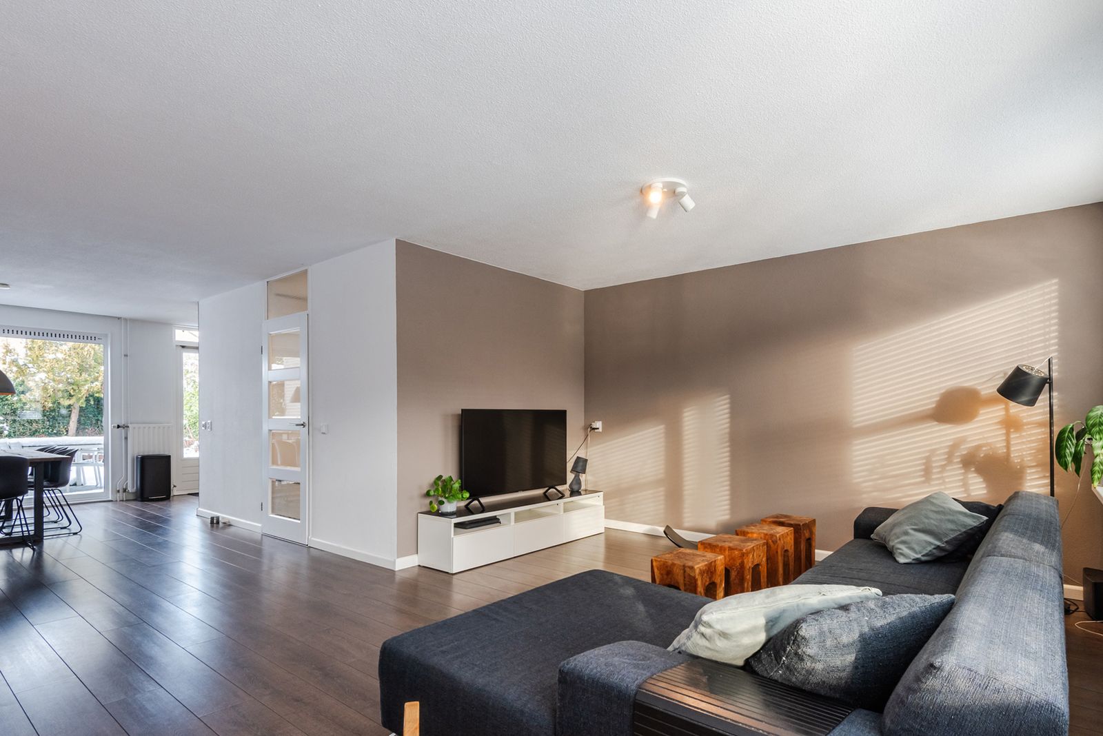 De gehele woonkamer is voorzien van een laminaatvloer met v-groef en comfortabele vloerverwarming. Wanden en plafonds zijn netjes afgewerkt. De raampartijen aan de voorzijde kijken uit op de voortuin, die is aangelegd met verschillend groen om privacy te bieden zonder het daglicht weg te vangen. Aan de achterzijde bevindt zich de open keuken met een deur en een schuifpui die beide toegang bieden tot de zeer ruime achtertuin.
