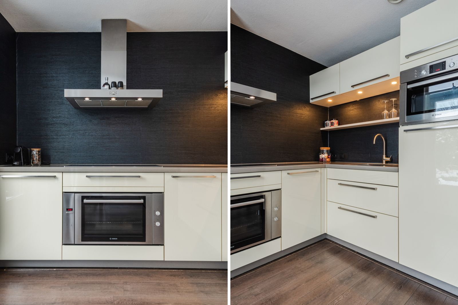 De moderne keuken met composiet werkblad is volledig uitgerust met BOSCH inbouwapparatuur om heerlijk te kunnen koken: een combi-oven met magnetronfunctie, een tweede extra brede oven, koelkast met vriesvak, vaatwasser, inductiekookplaat en afzuigkap.
