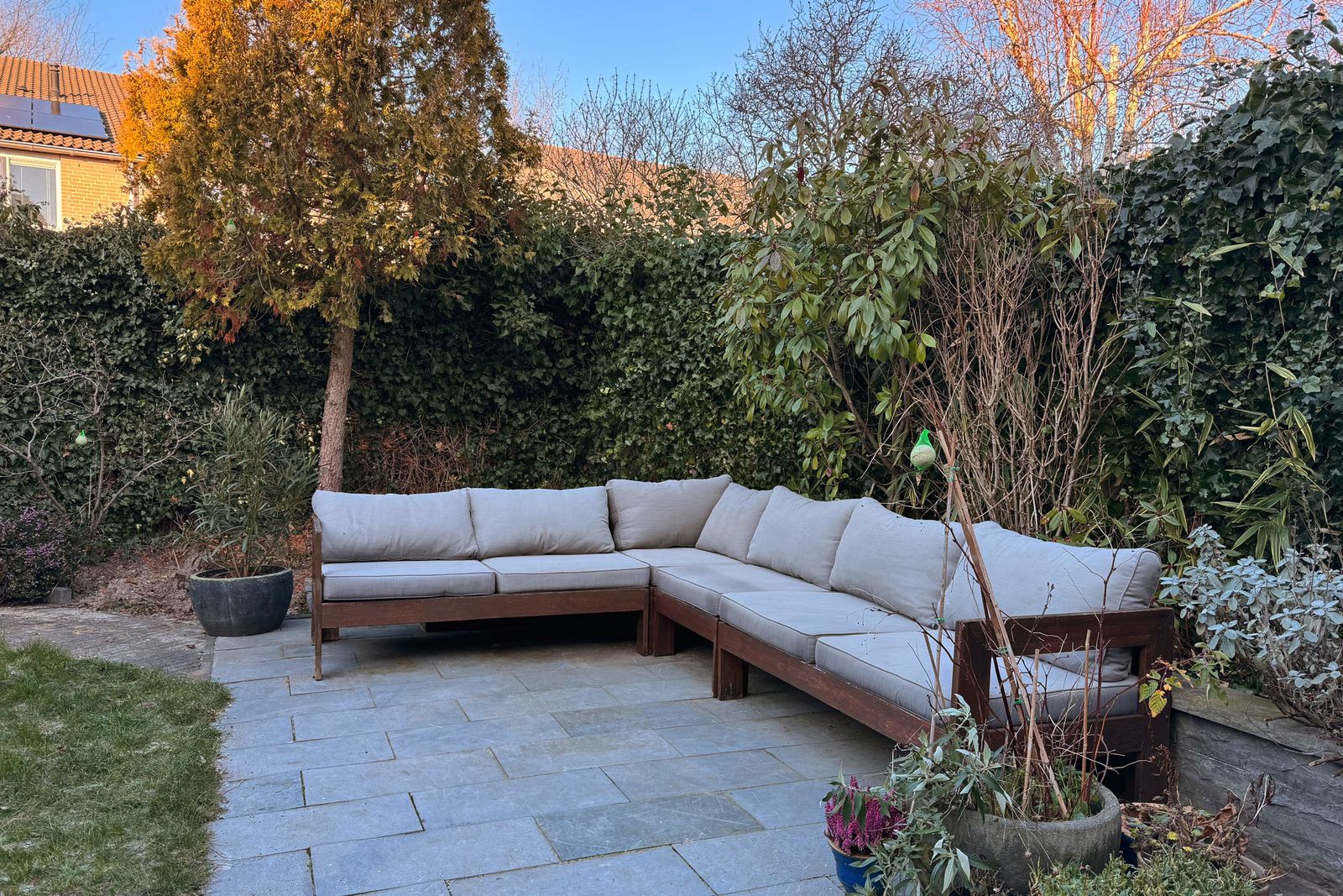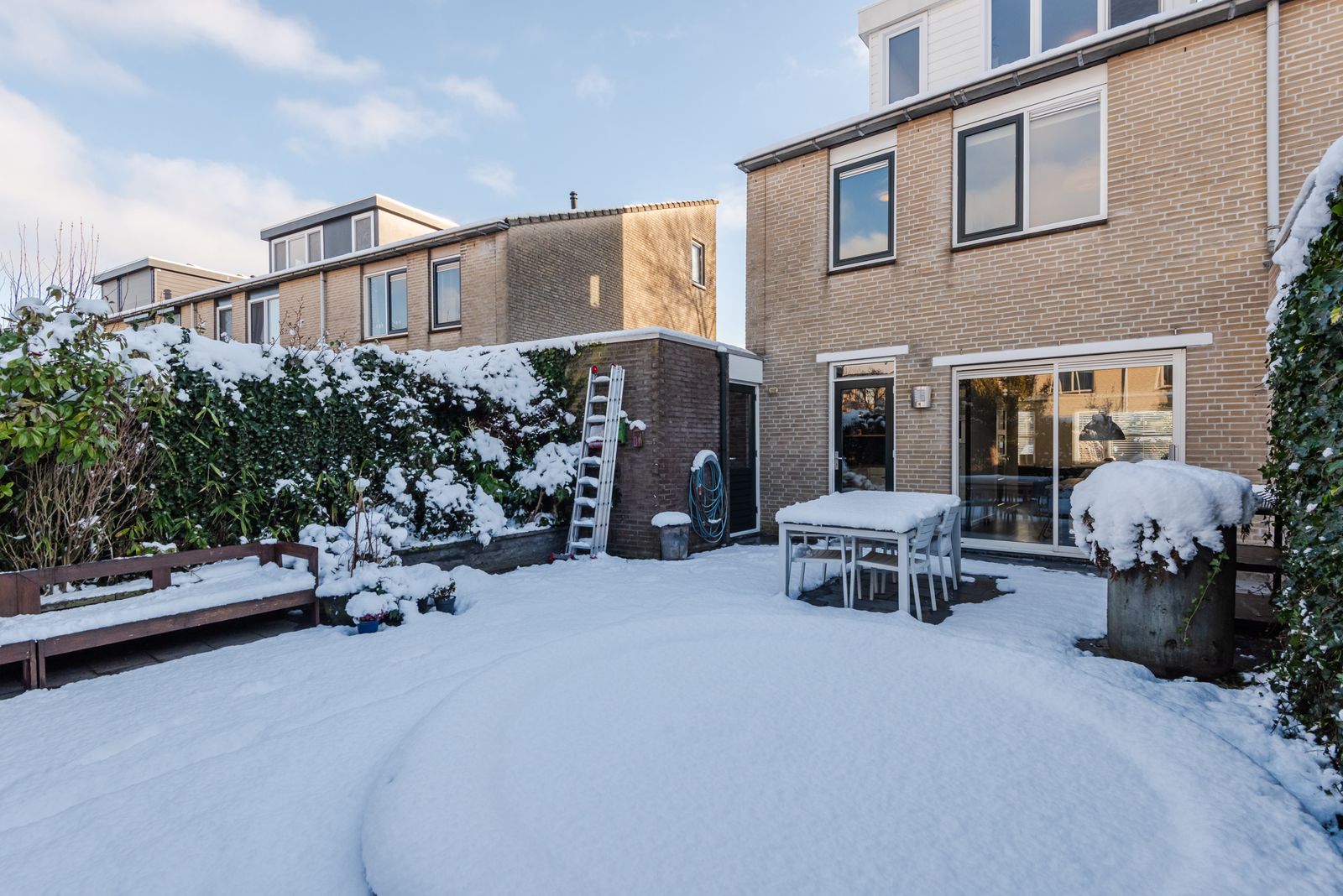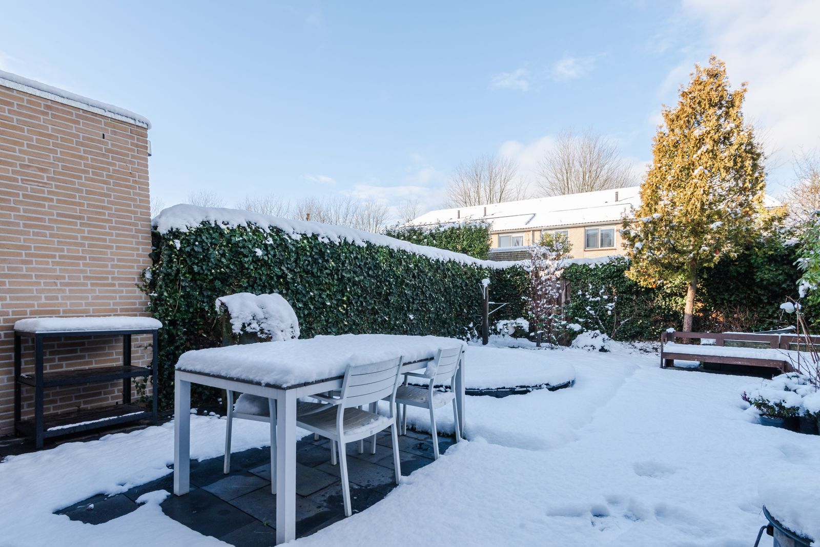 De achtertuin is speels ingericht met verschillende bloemrijke planten en struiken, een gazon en is deels betegeld met Vietnamees hardsteen. Met klimop begroeid hekwerk scheidt de tuin van het achterpad en van de tuinen van aangrenzende buren, zodat privacy wordt gewaarborgd met natuurlijk groen. Dankzij de diepte van 12 meter, ligging op het noordwesten en vrij van hoge bebouwing aan beide zijden, kunt u in deze tuin de hele dag van zon genieten. Een heerlijke tuin, zowel voor spelende kinderen als voor liefhebbers van zon en tuinieren.