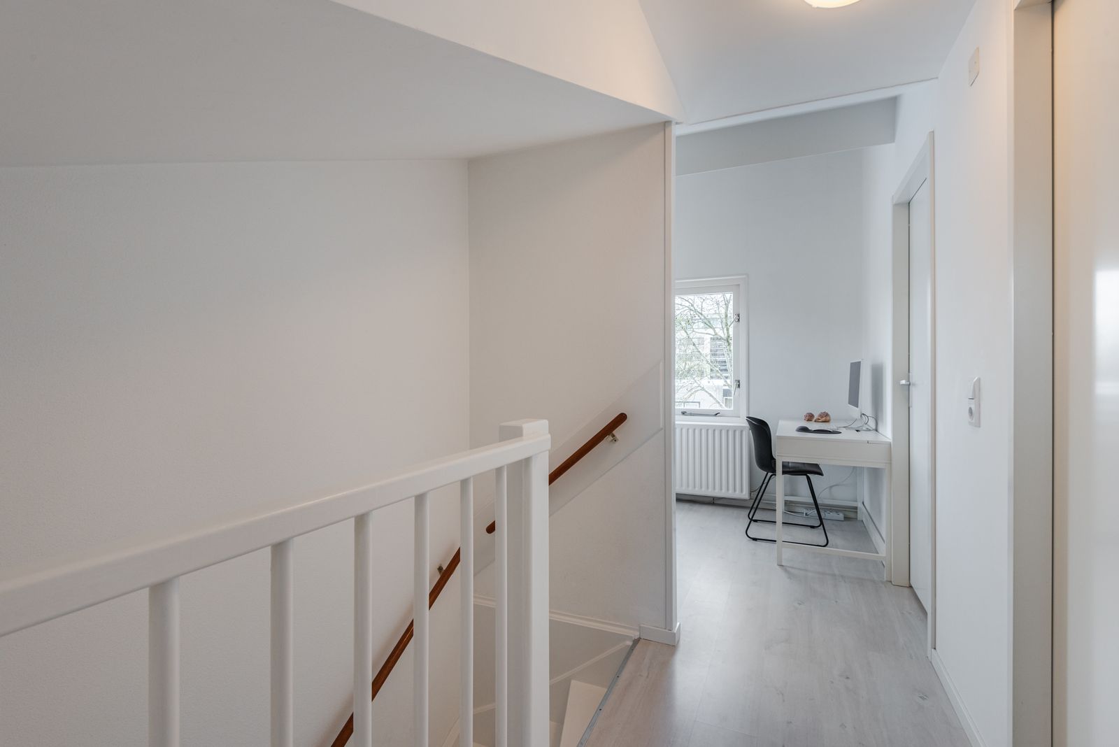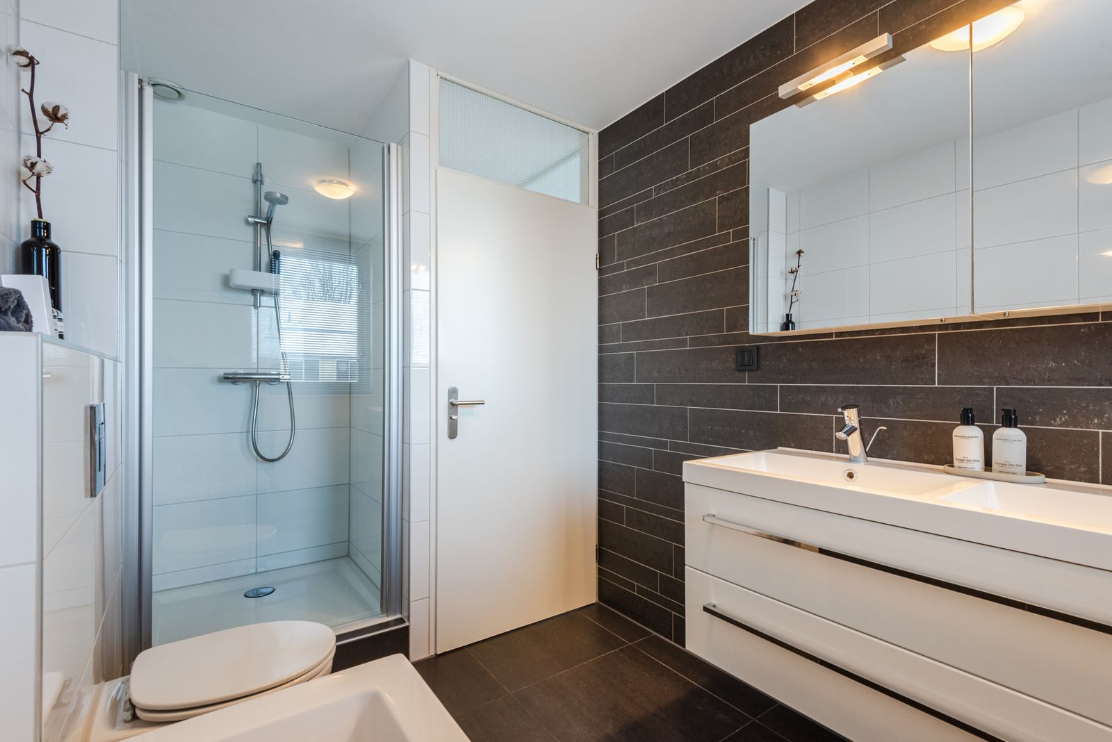 Aan de achterzijde van de woning vindt u een tweede slaapkamer, die eveneens ruim is en uitkijkt op de achtertuin. Daarnaast ligt de moderne badkamer, die voorzien is van een douche, ligbad met handdouche, dubbele wastafel met meubel en een hangend wandcloset. De wanden van de badkamer zijn tot het plafond betegeld. Op de badkamervloer liggen moderne, donkere vloertegels en de rest van de eerste verdieping is voorzien van een doorgelegde laminaatvloer in lichte kleurstelling.