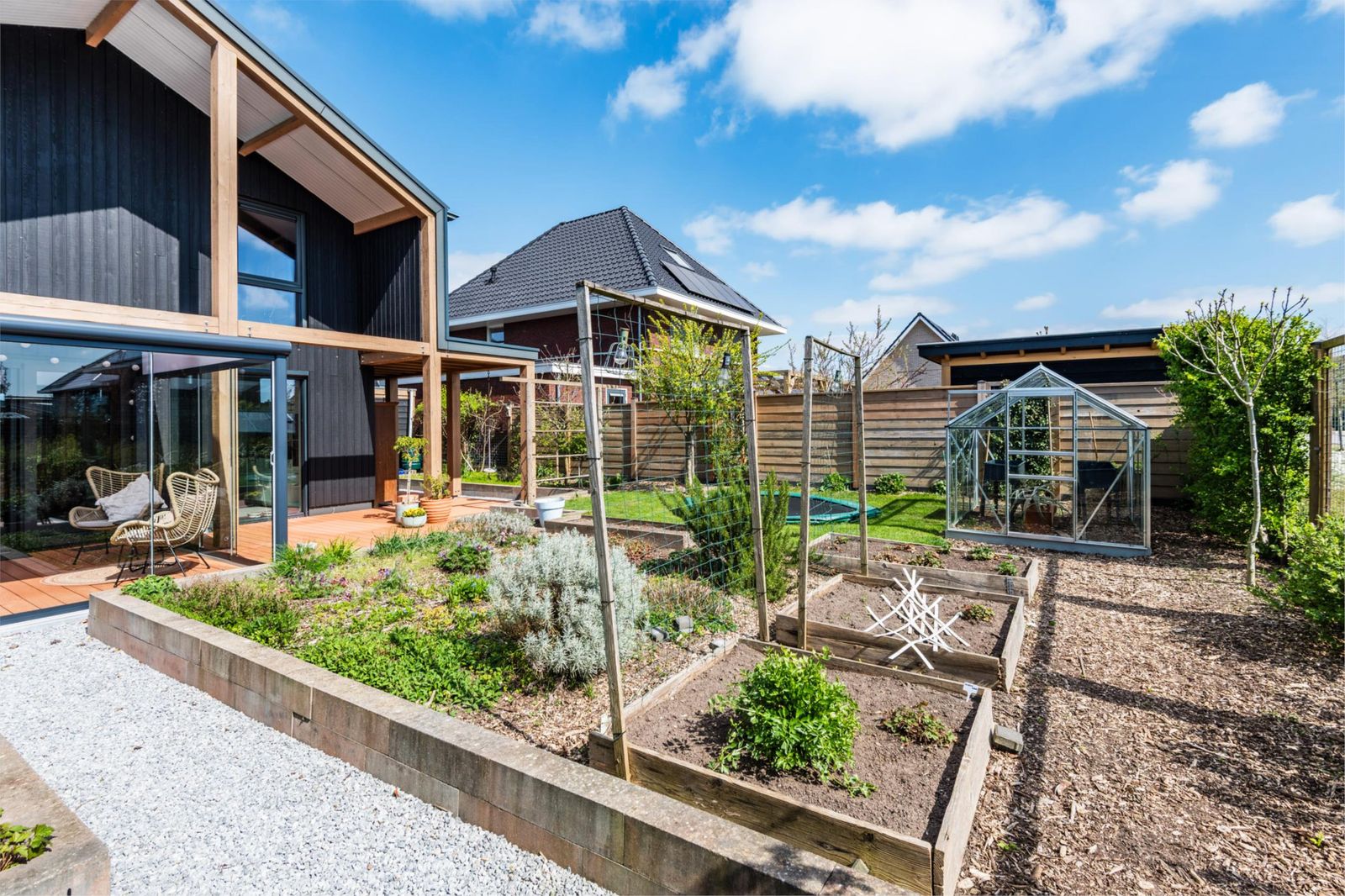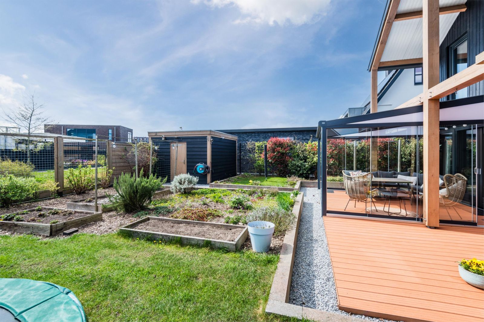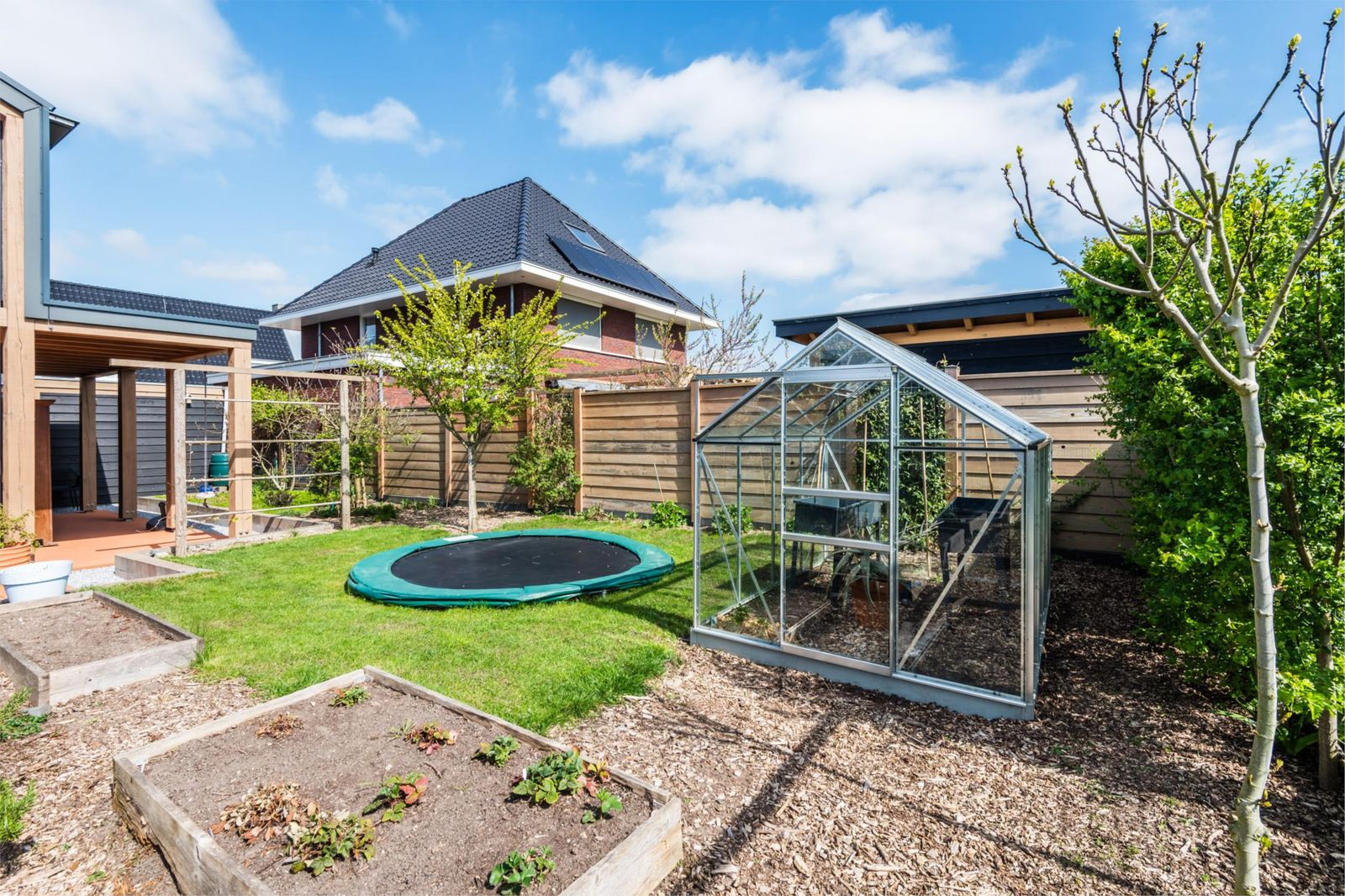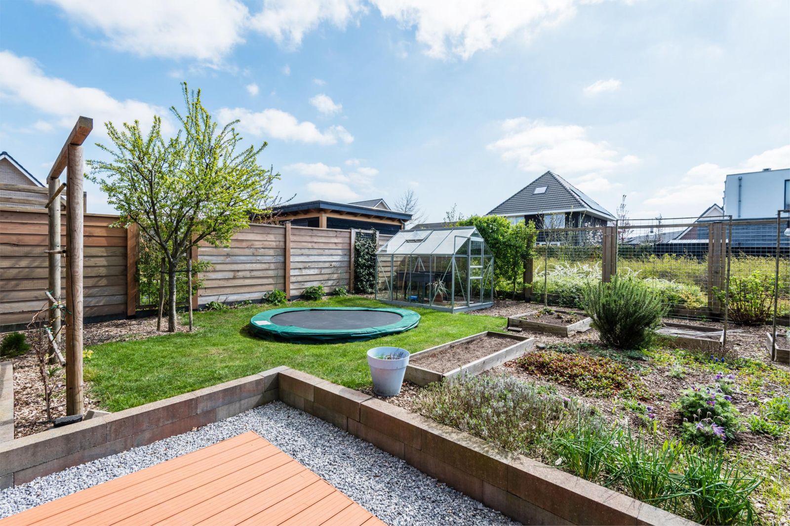 De tuin is een absolute eyecatcher. De op het zuiden gelegen achtertuin is aangelegd als een bloemrijke tuin met veel groen, een trampoline, een kas en een fijne overkapping aan de zijkant. Aan de achterzijde zorgt een doorlopend dak voor een natuurlijke overgang tussen woning en tuin.