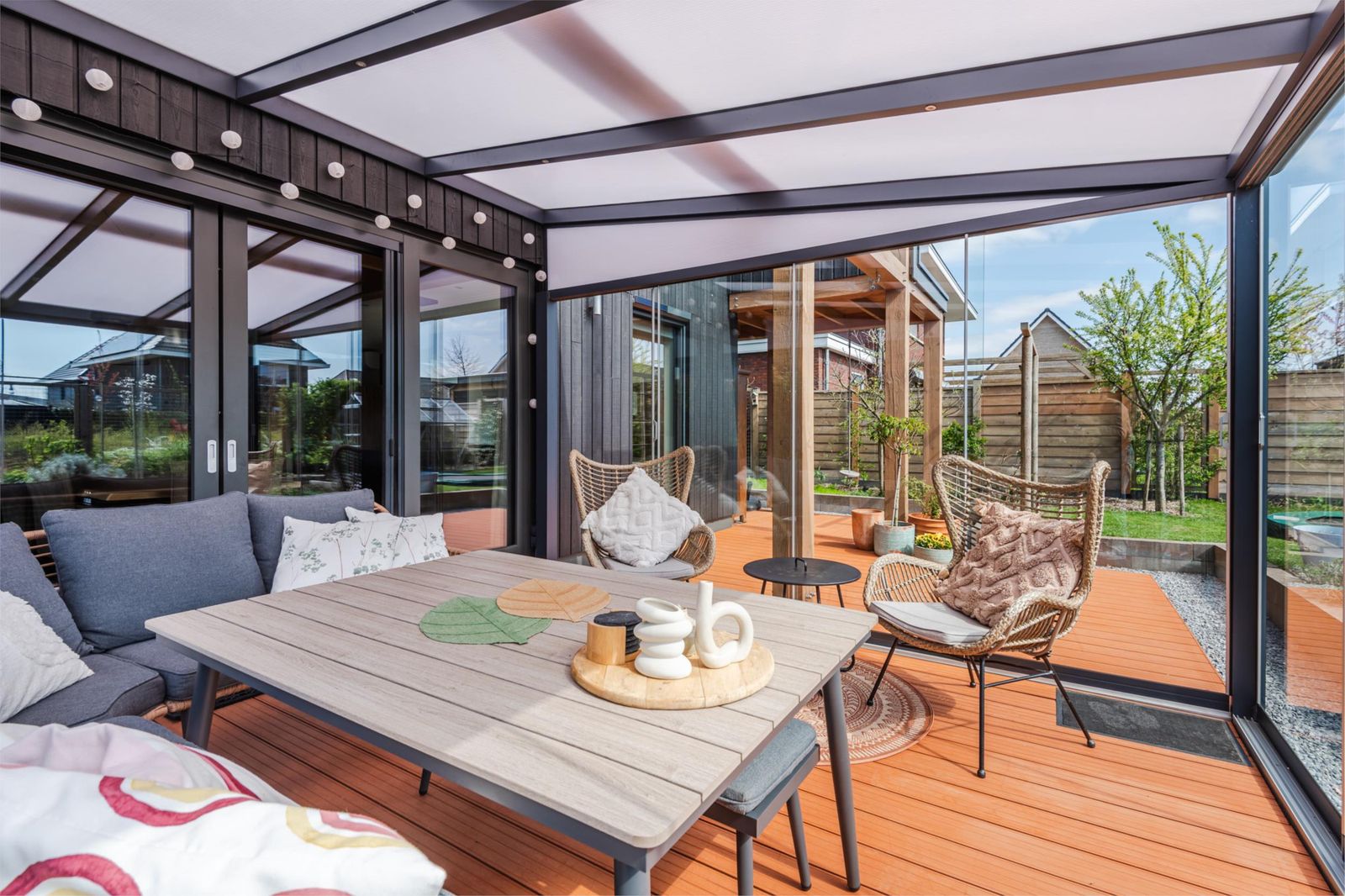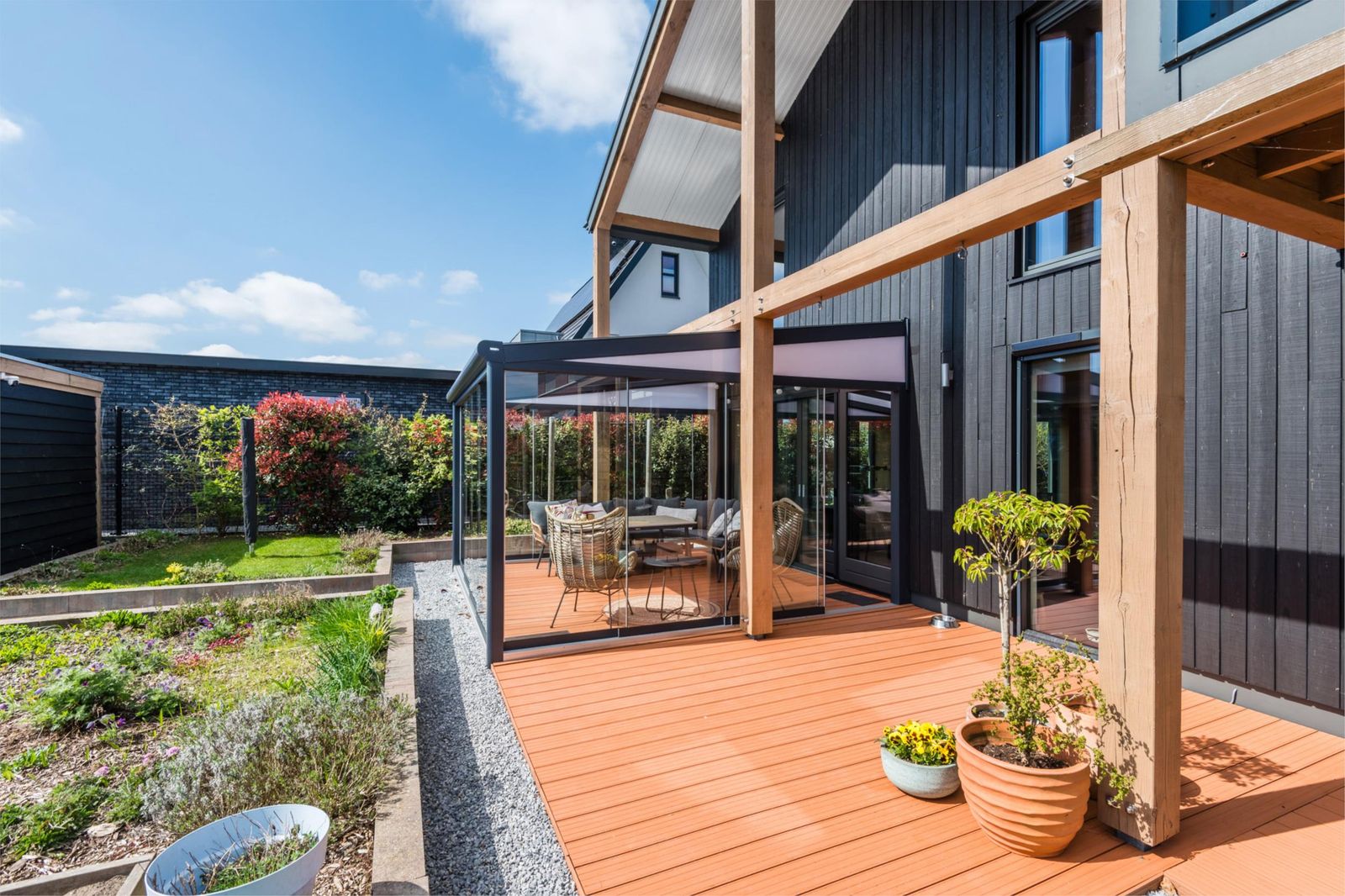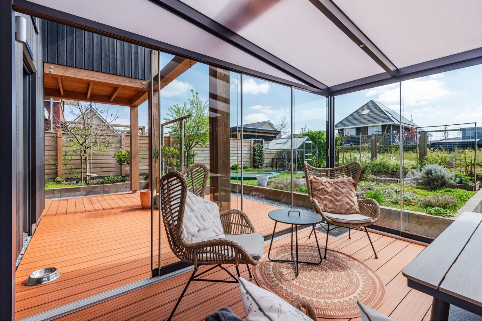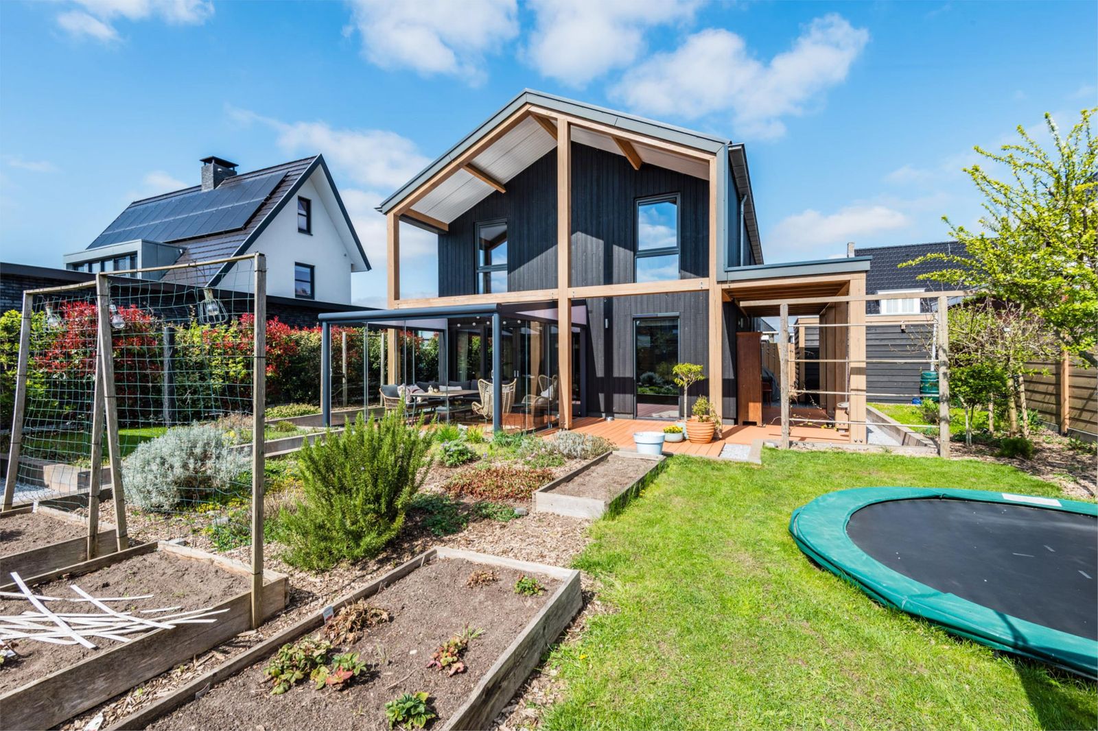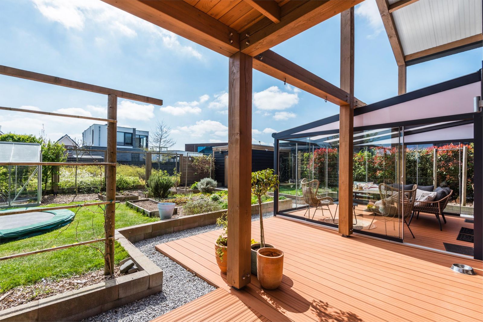 De tuin is een absolute eyecatcher. De op het zuiden gelegen achtertuin is aangelegd als een bloemrijke tuin met veel groen, een trampoline, een kas en een fijne overkapping aan de zijkant. Aan de achterzijde zorgt een doorlopend dak voor een natuurlijke overgang tussen woning en tuin.