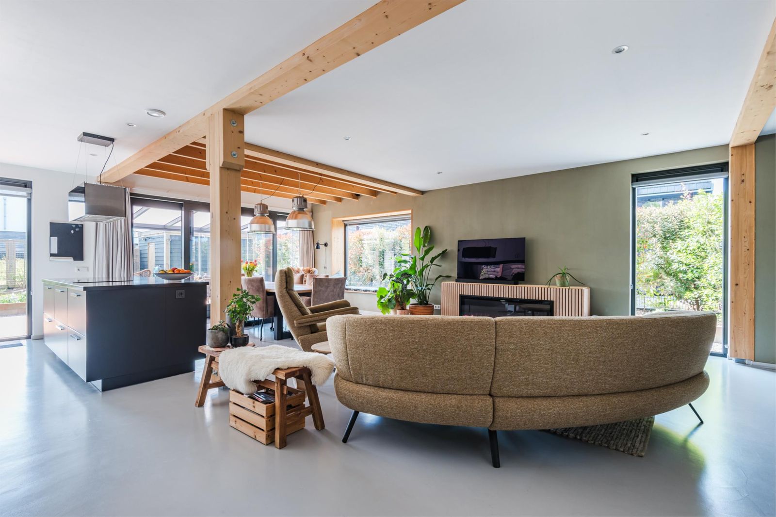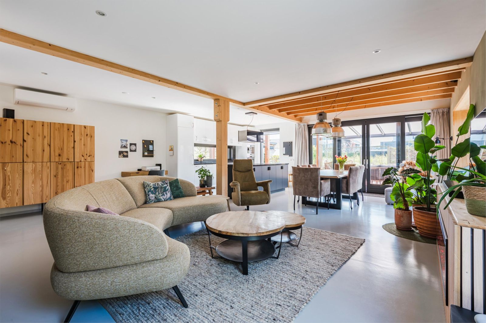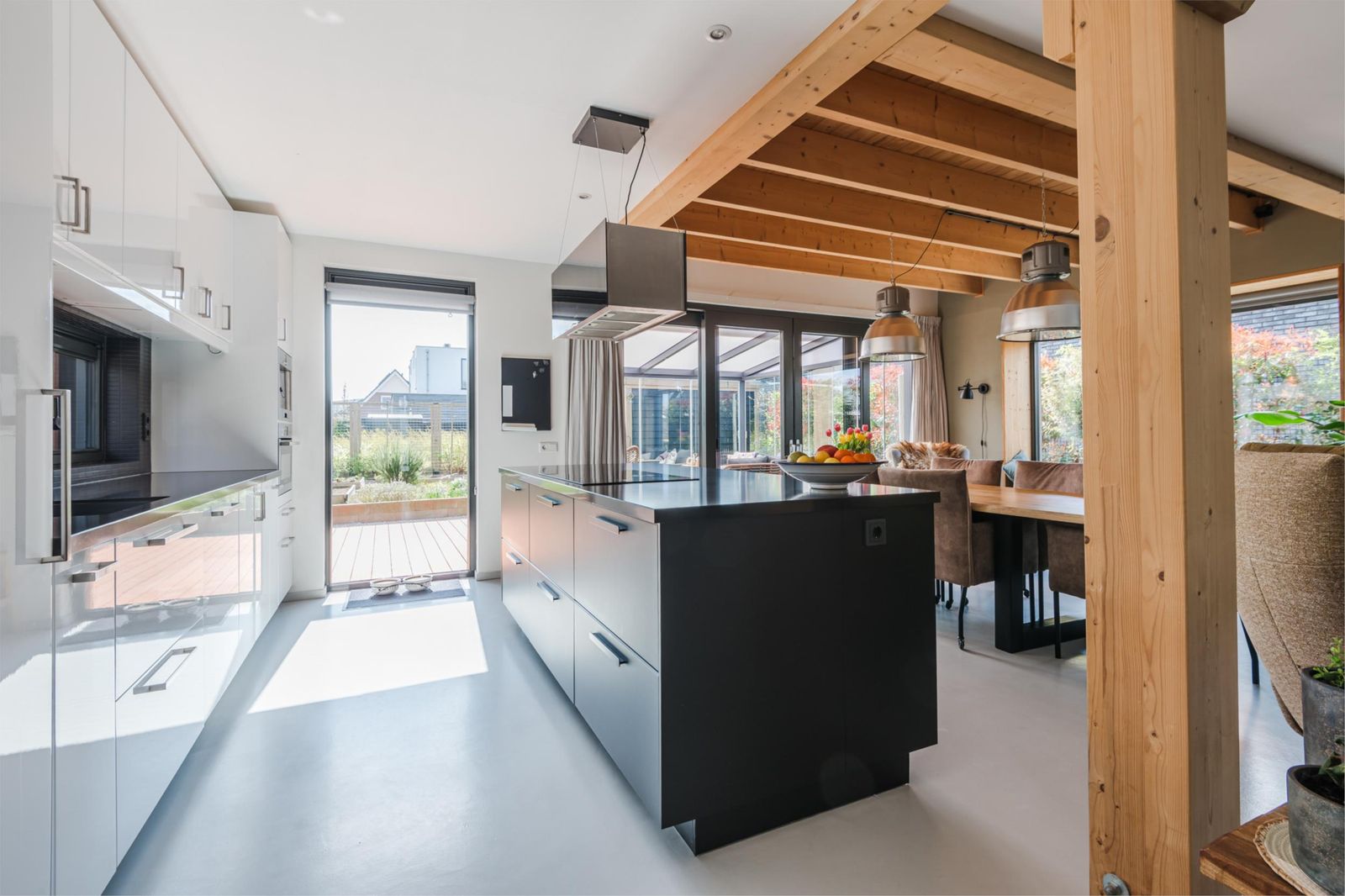 Bij binnenkomst valt direct de gietvloer en het licht op. De ruime woonkamer is voorzien van vloerverwarming, airconditioning en loopt naadloos over in de luxe, open keuken met kookeiland en veel bergruimte. Hier vind je hoogwaardige inbouwapparatuur van Bosch: een grote koelkast, vaatwasser, combimagnetron, inbouw koffiemachine en een inductiekookplaat. Via een dubbele schuifpui heb je direct toegang tot de prachtige serre (4x4m), met schuifdeuren aan drie zijden, waardoor binnen en buiten naadloos in elkaar overlopen.