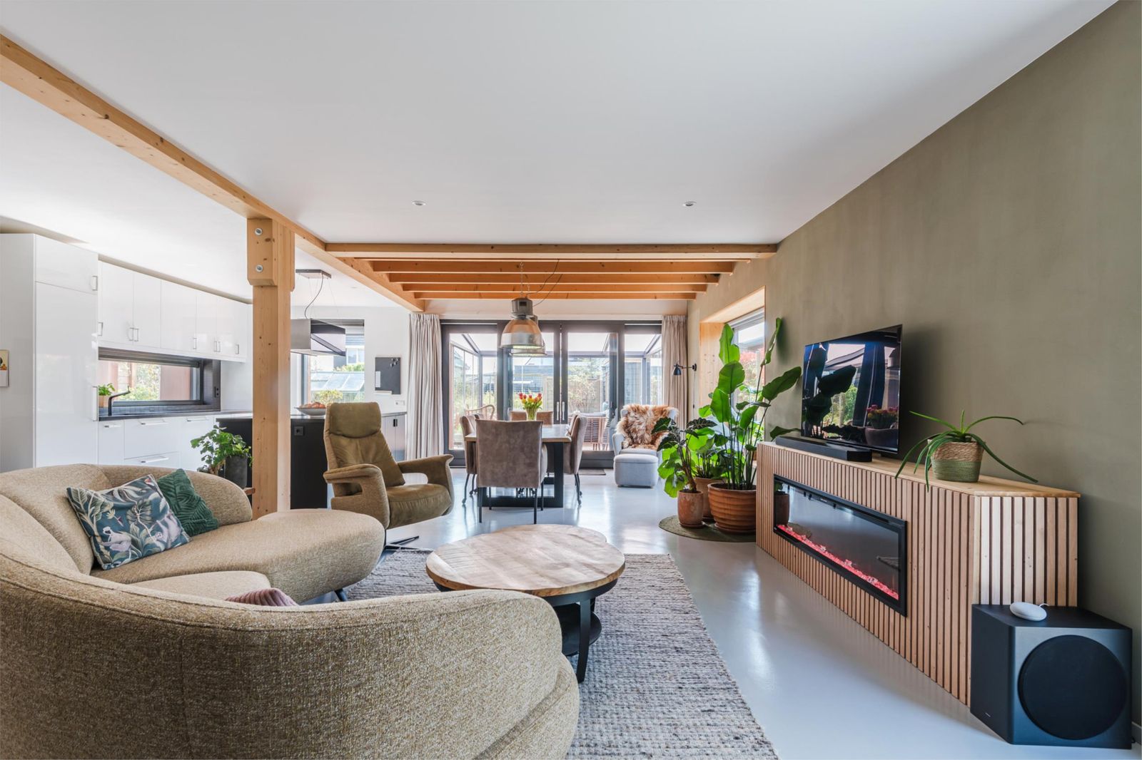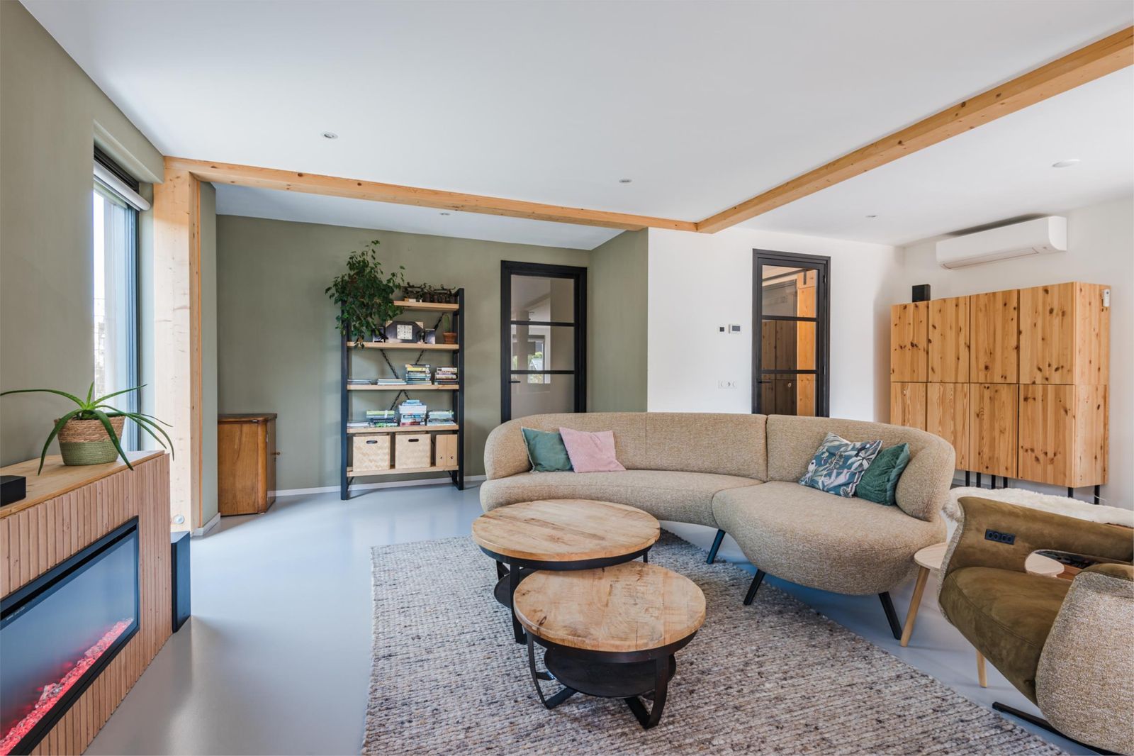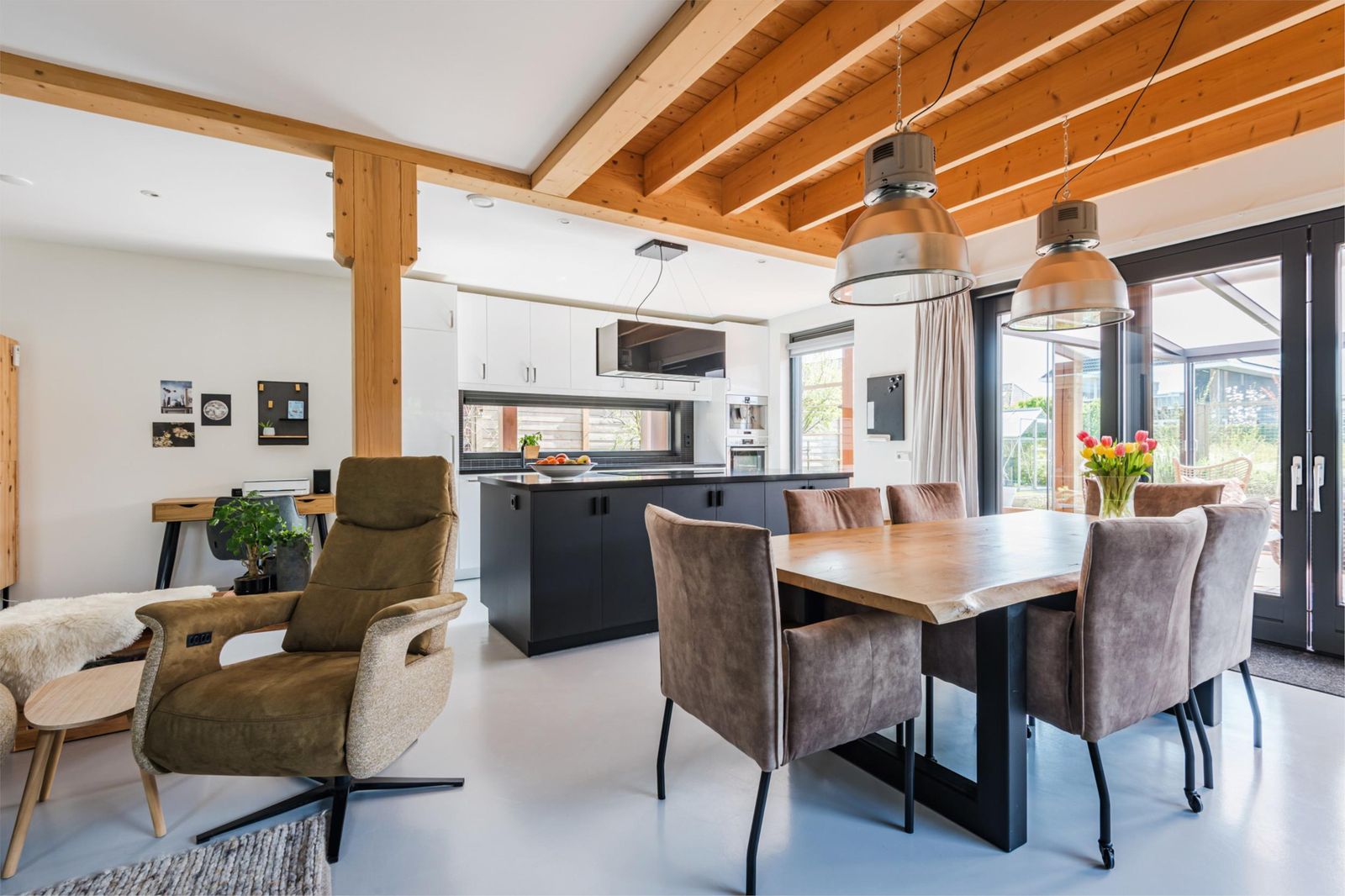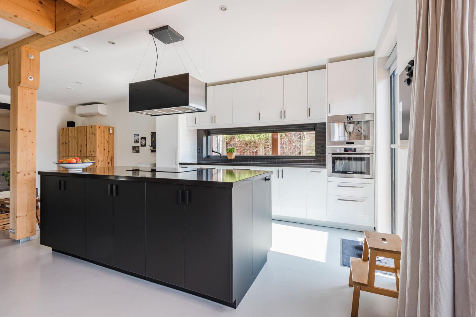 Bij binnenkomst valt direct de gietvloer en het licht op. De ruime woonkamer is voorzien van vloerverwarming, airconditioning en loopt naadloos over in de luxe, open keuken met kookeiland en veel bergruimte. Hier vind je hoogwaardige inbouwapparatuur van Bosch: een grote koelkast, vaatwasser, combimagnetron, inbouw koffiemachine en een inductiekookplaat. Via een dubbele schuifpui heb je direct toegang tot de prachtige serre (4x4m), met schuifdeuren aan drie zijden, waardoor binnen en buiten naadloos in elkaar overlopen.