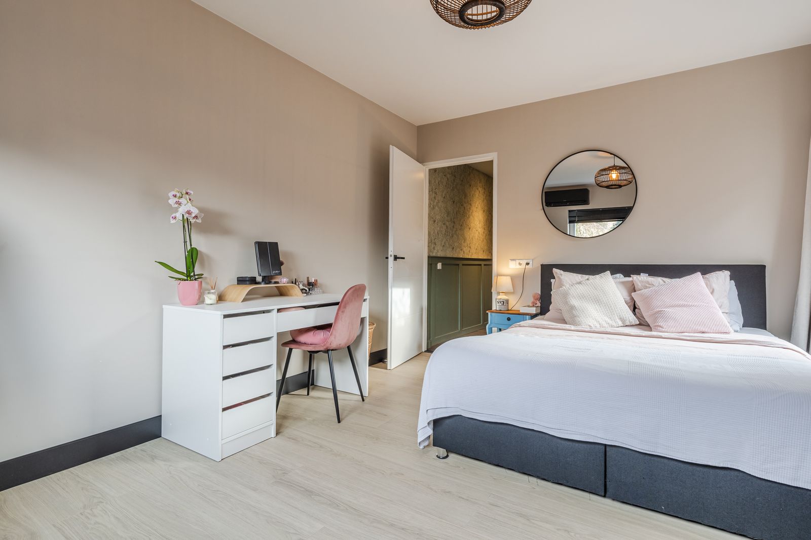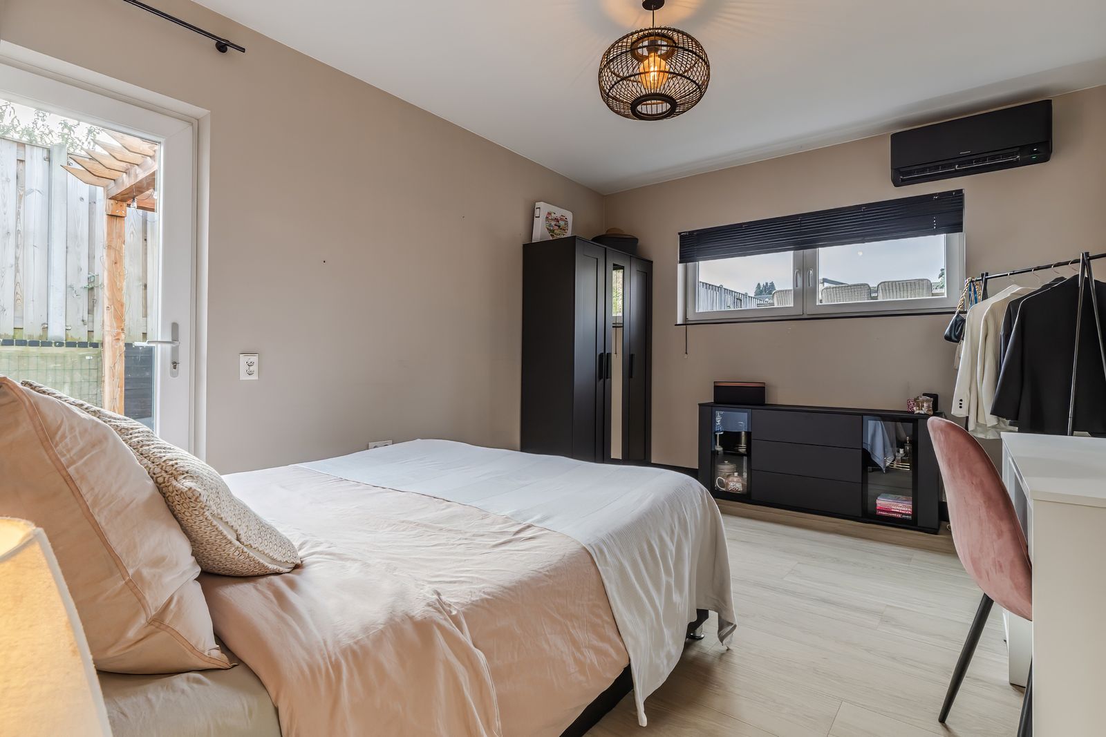 Slaapkamer voorzien van airco en deur naar de tuin. Tevens is deze ruimte te gebruiken als kantoor/werkruimte, bedrijf aan huis of mantelzorgwoning etc.