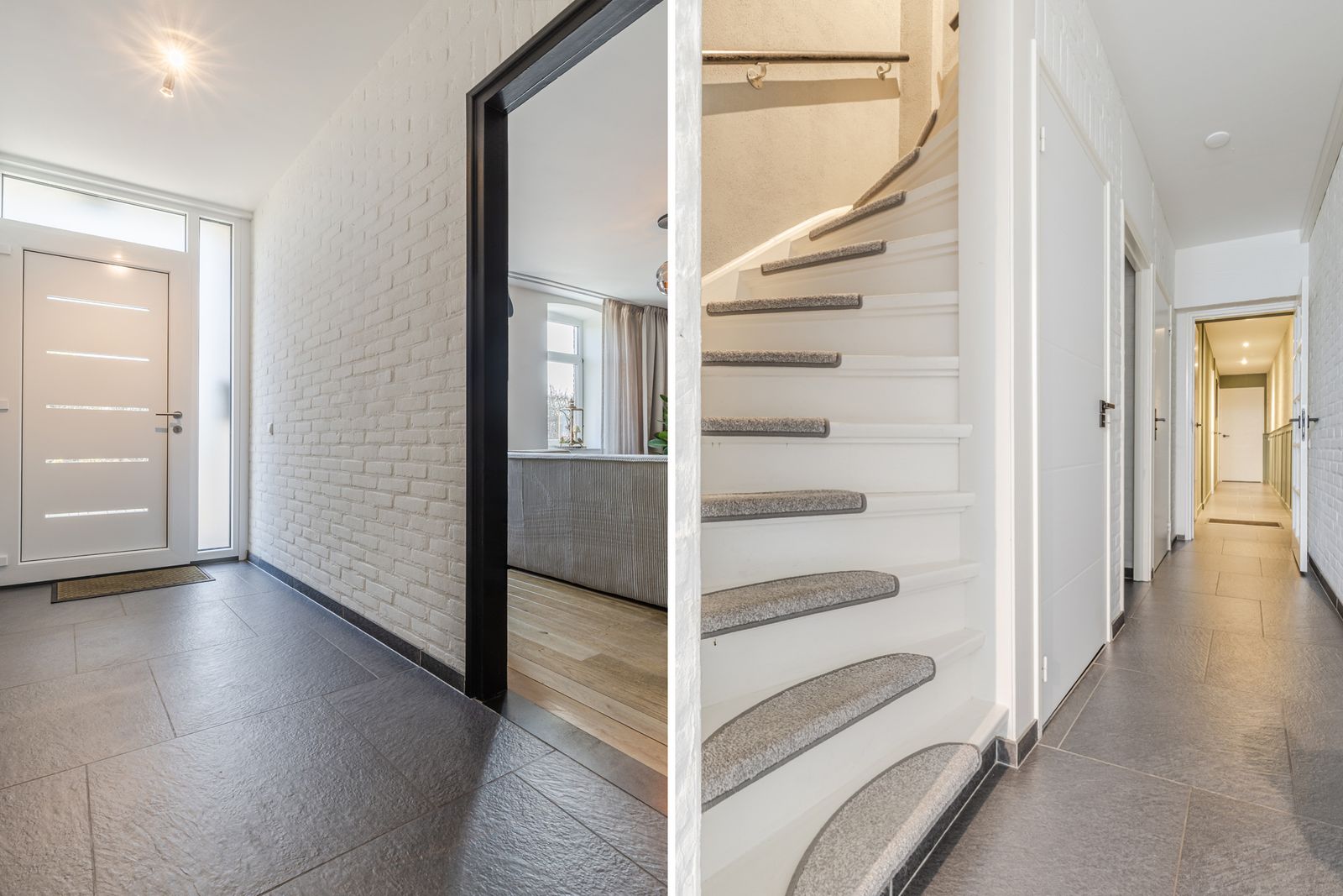 Entree met houtlook voordeur met triple beglazing.