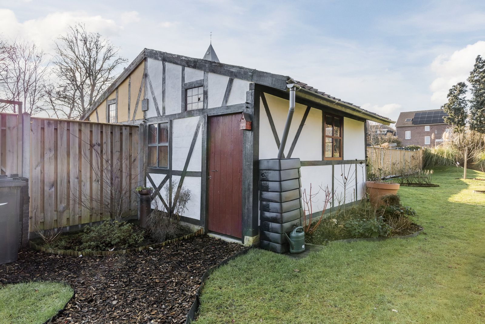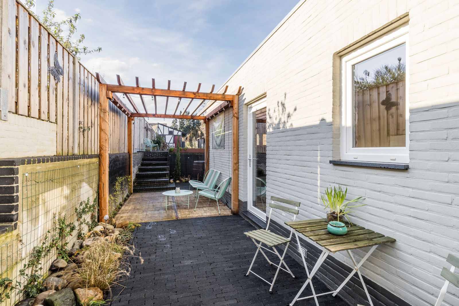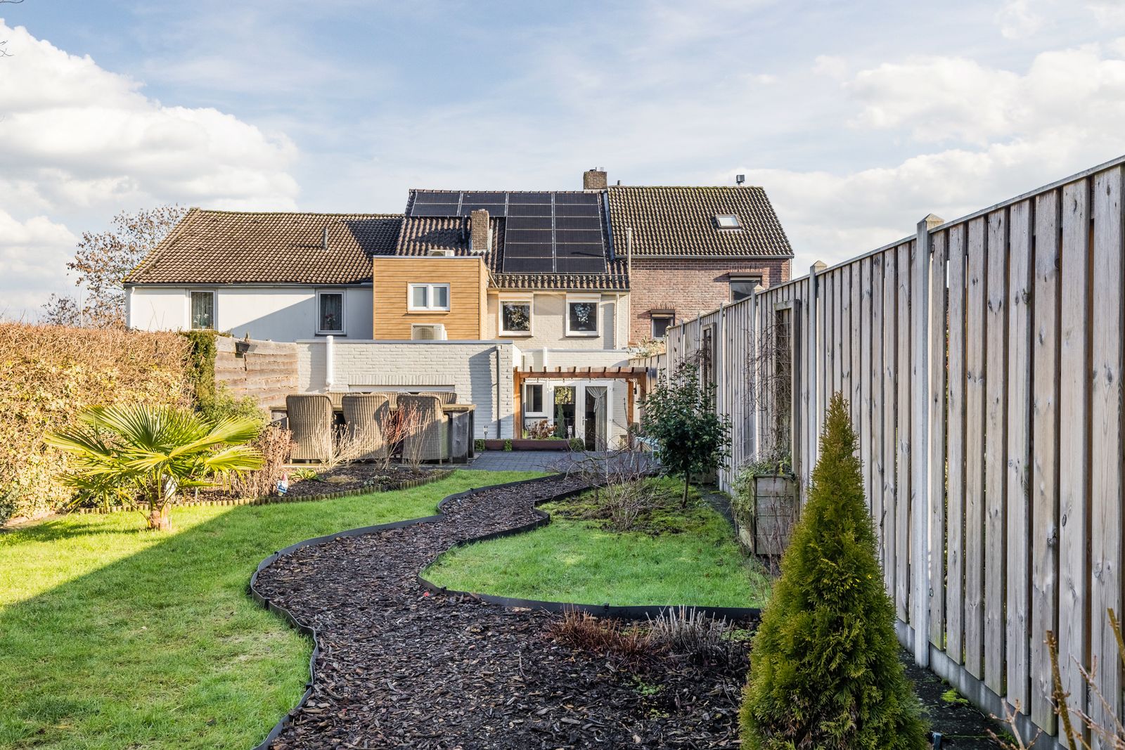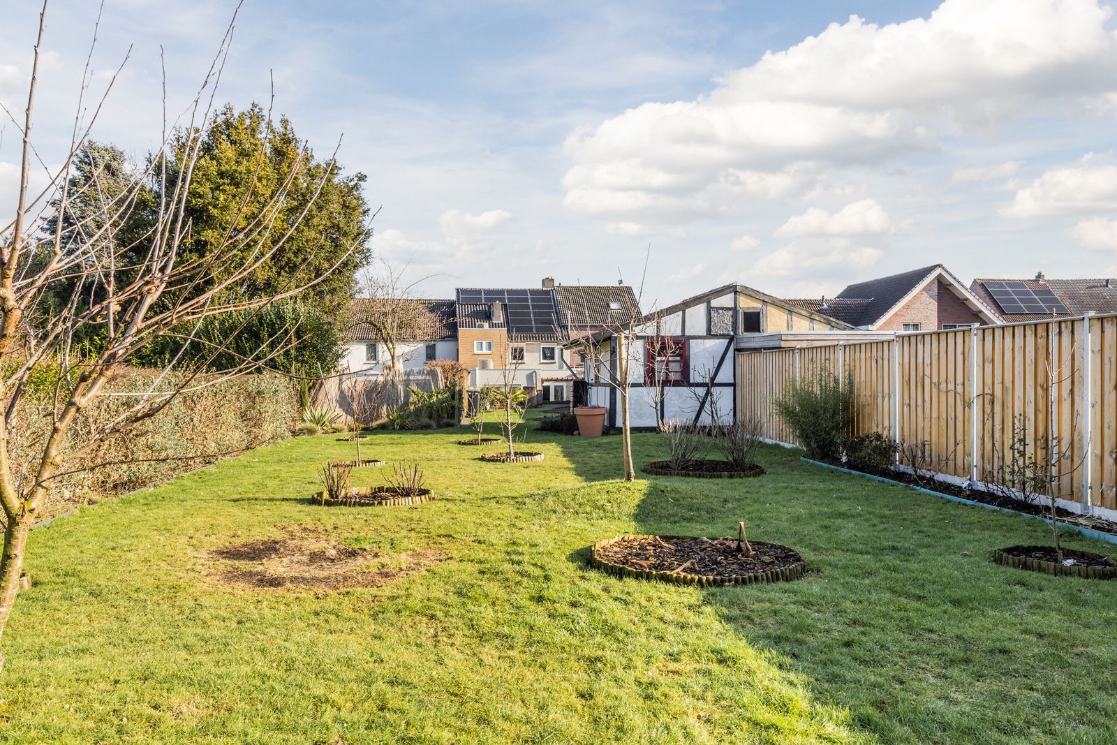 De omsloten achtertuin van ca. 50 meter diep en ca. 10 meter breed ligt op het zuidwesten. Aan de ene zijde is de tuin omsloten door heggen, aan de andere zijde door schuttingen (2025).