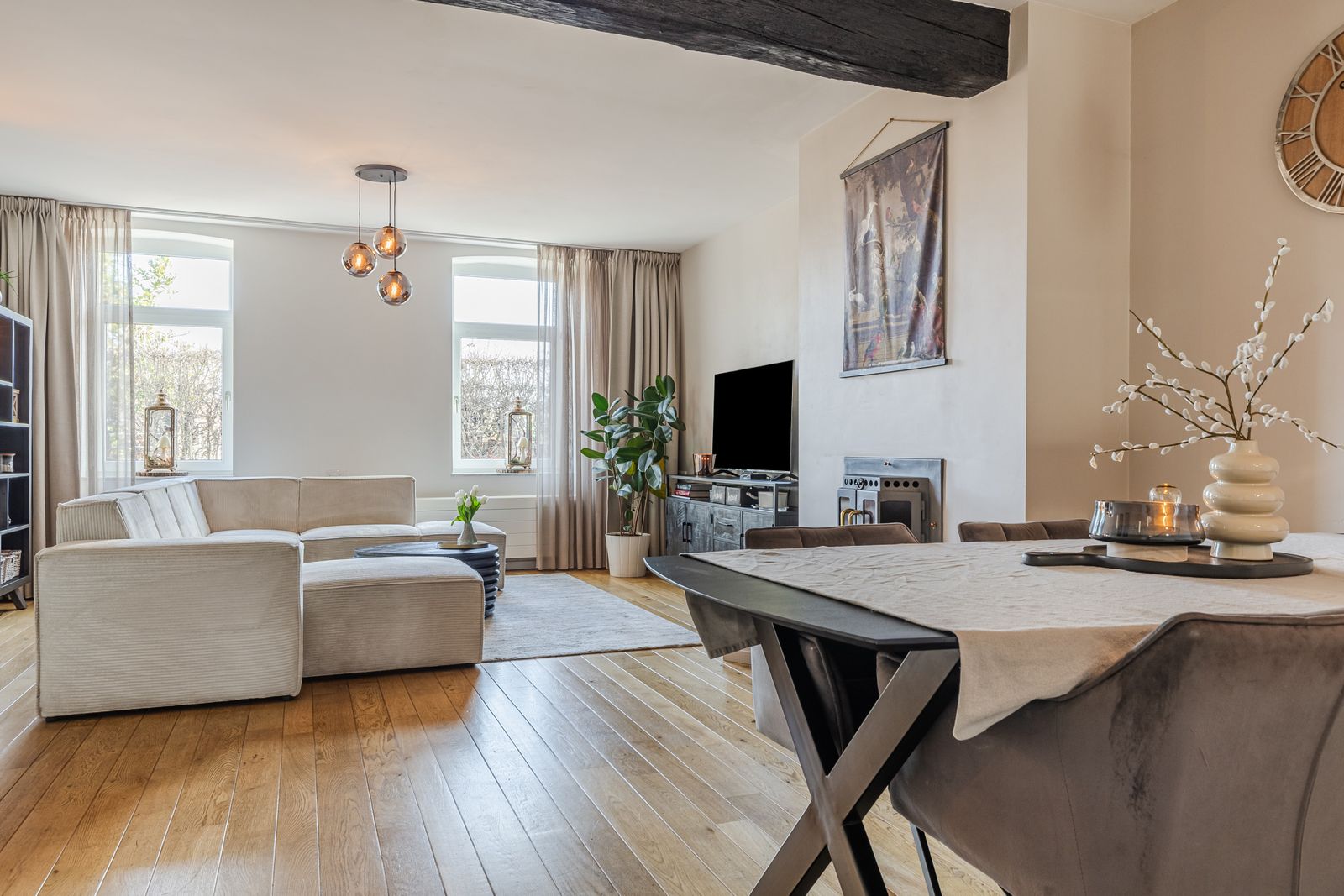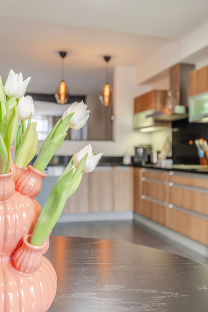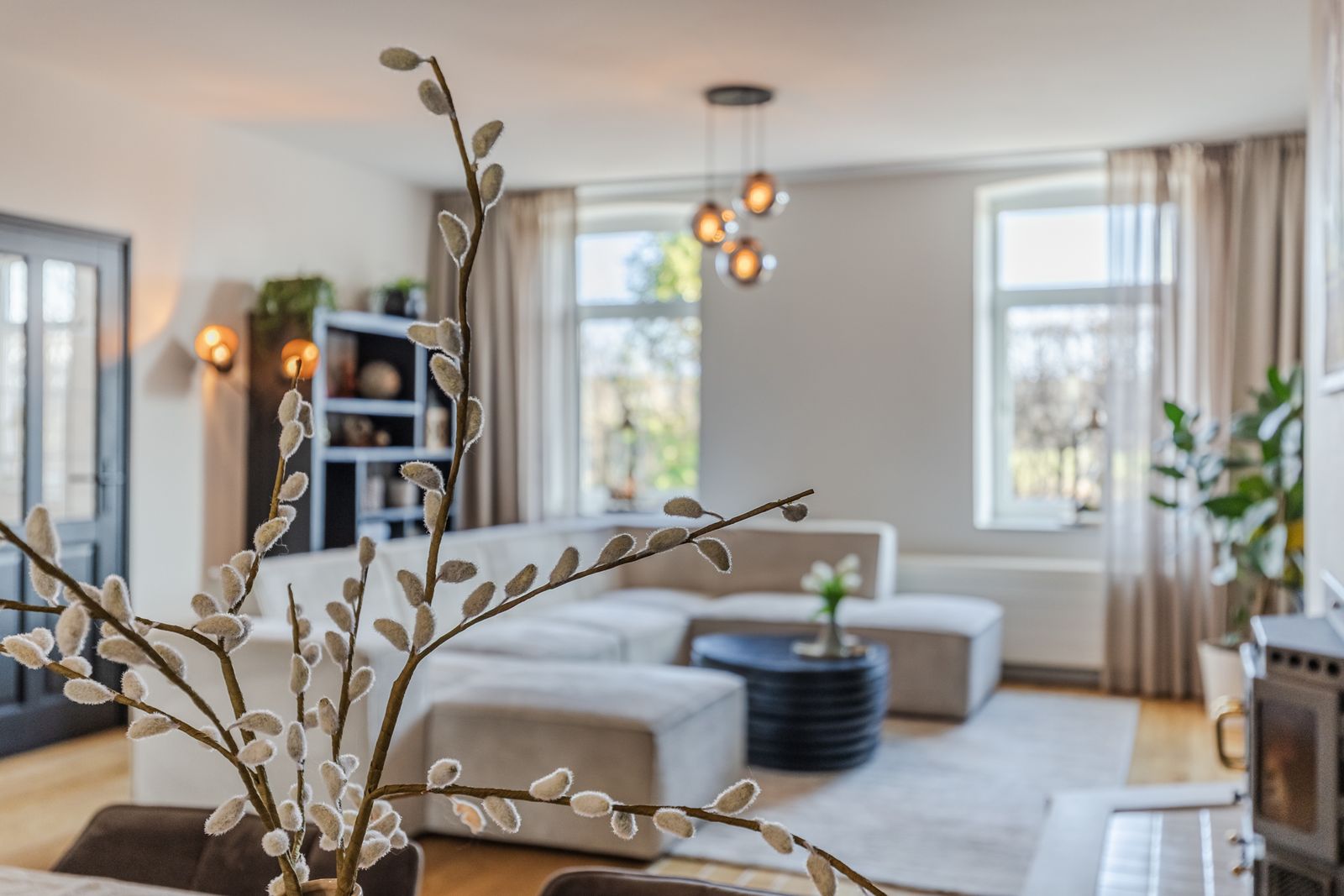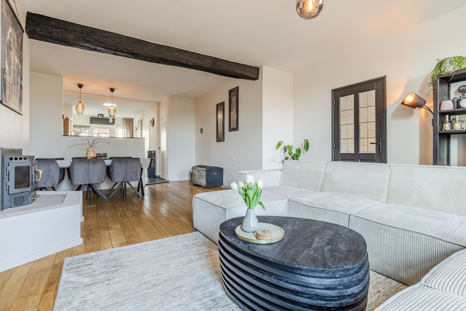 De royale woonkamer is voorzien van een eikenhouten parketvloer, houtkachel en een lage temperatuurradiator. De woonkamer is opgedeeld in een ruim zit- en eetgedeelte en staat in verbinding met de keuken. Deze is voorzien van inbouwapparatuur (oven, keramische kookplaat, koelkast, vaatwasmachine) een granieten aanrechtblad en een ruime provisiekast.