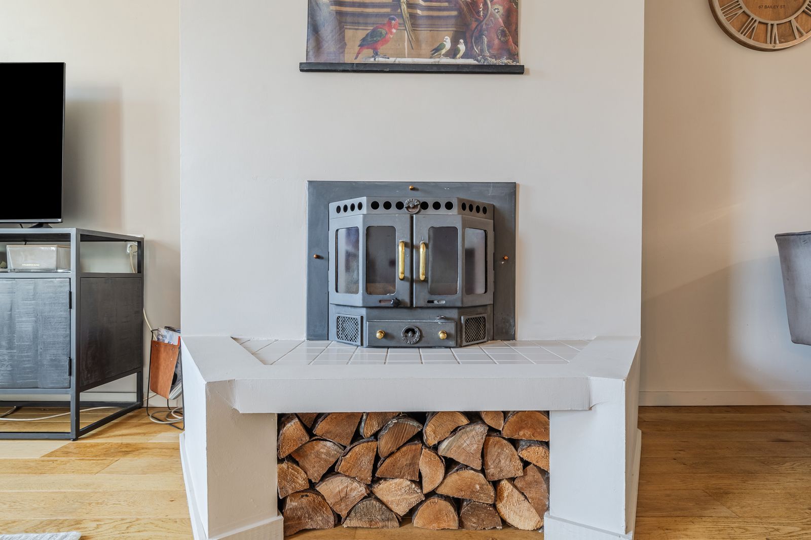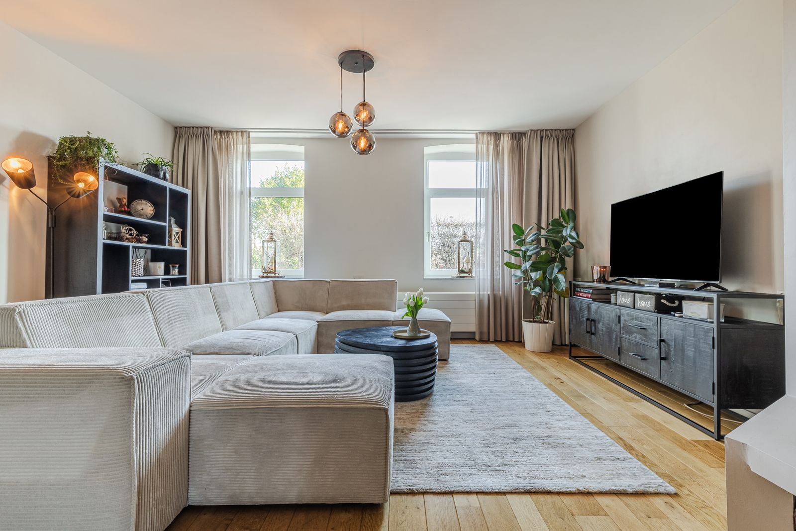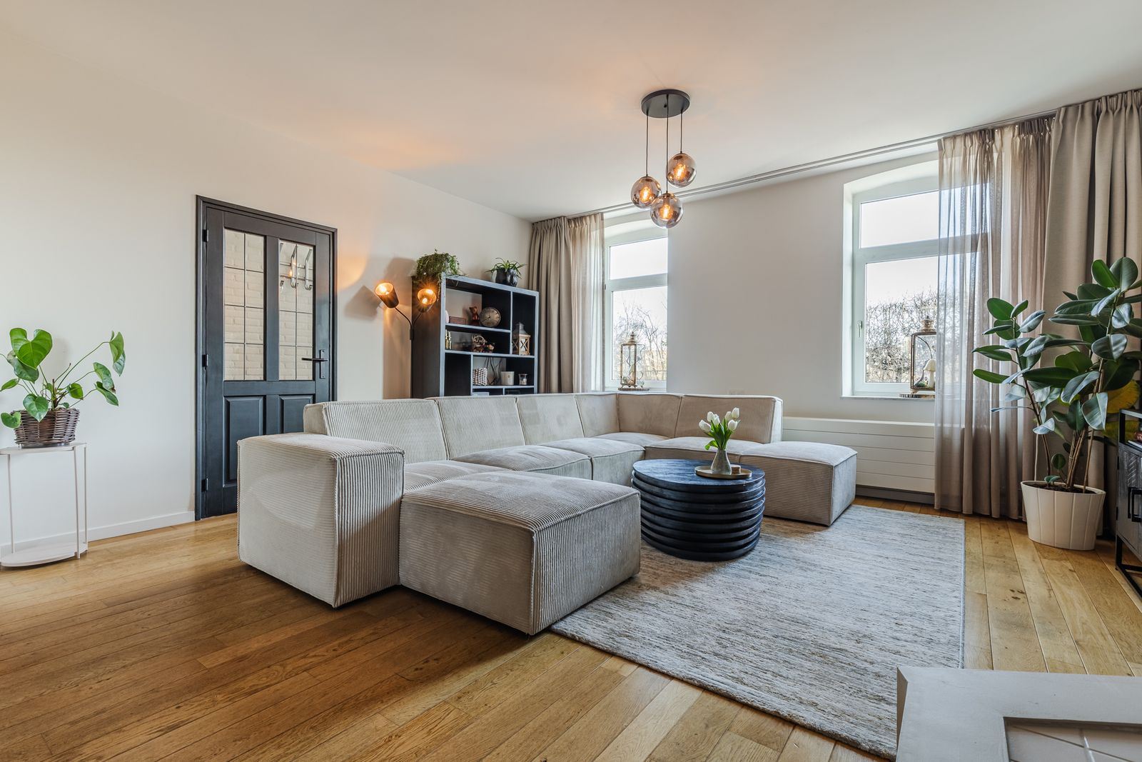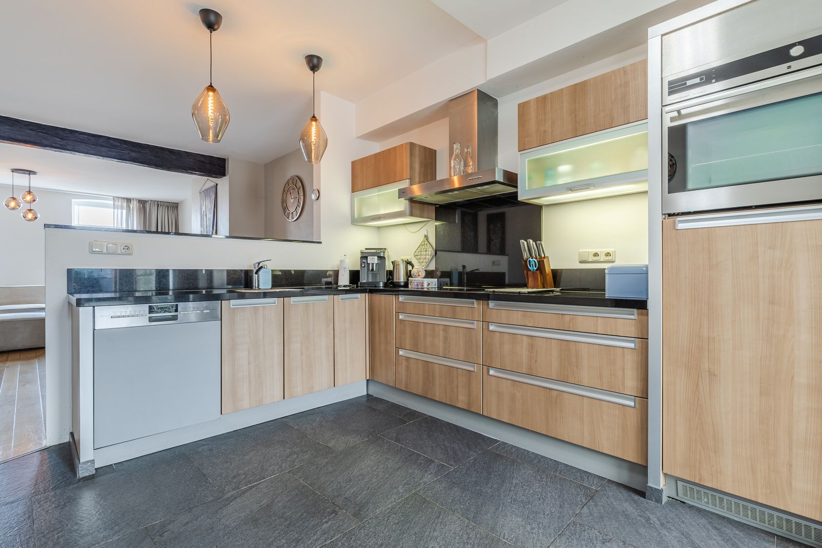 De royale woonkamer is voorzien van een eikenhouten parketvloer, houtkachel en een lage temperatuurradiator. De woonkamer is opgedeeld in een ruim zit- en eetgedeelte en staat in verbinding met de keuken. Deze is voorzien van inbouwapparatuur (oven, keramische kookplaat, koelkast, vaatwasmachine) een granieten aanrechtblad en een ruime provisiekast.
