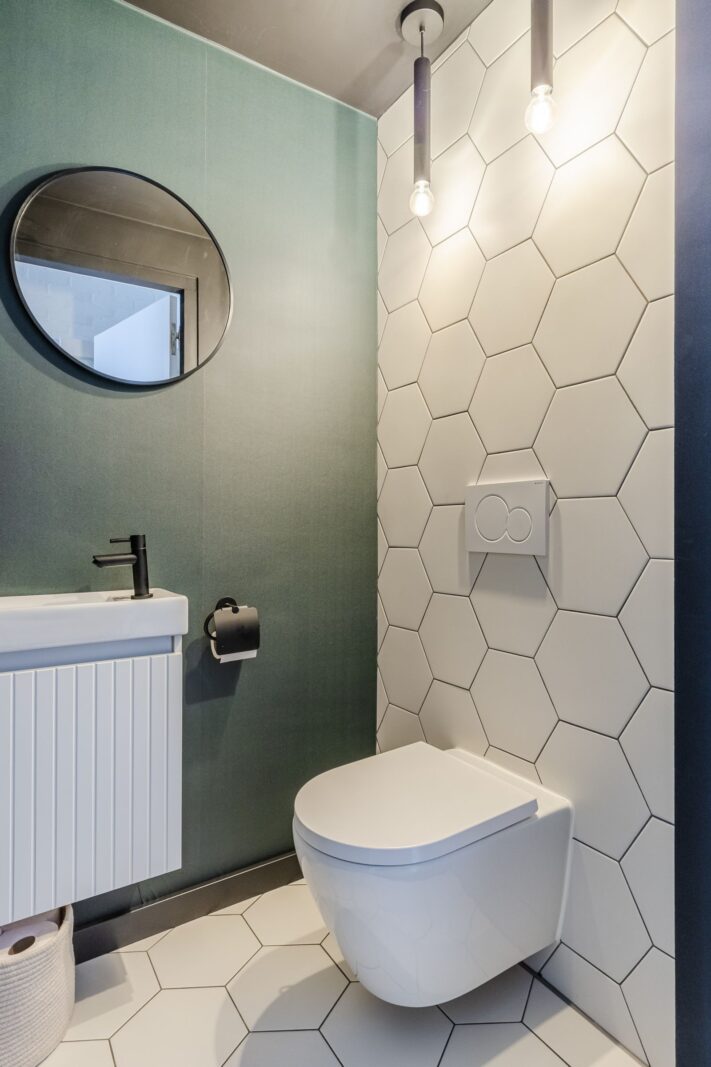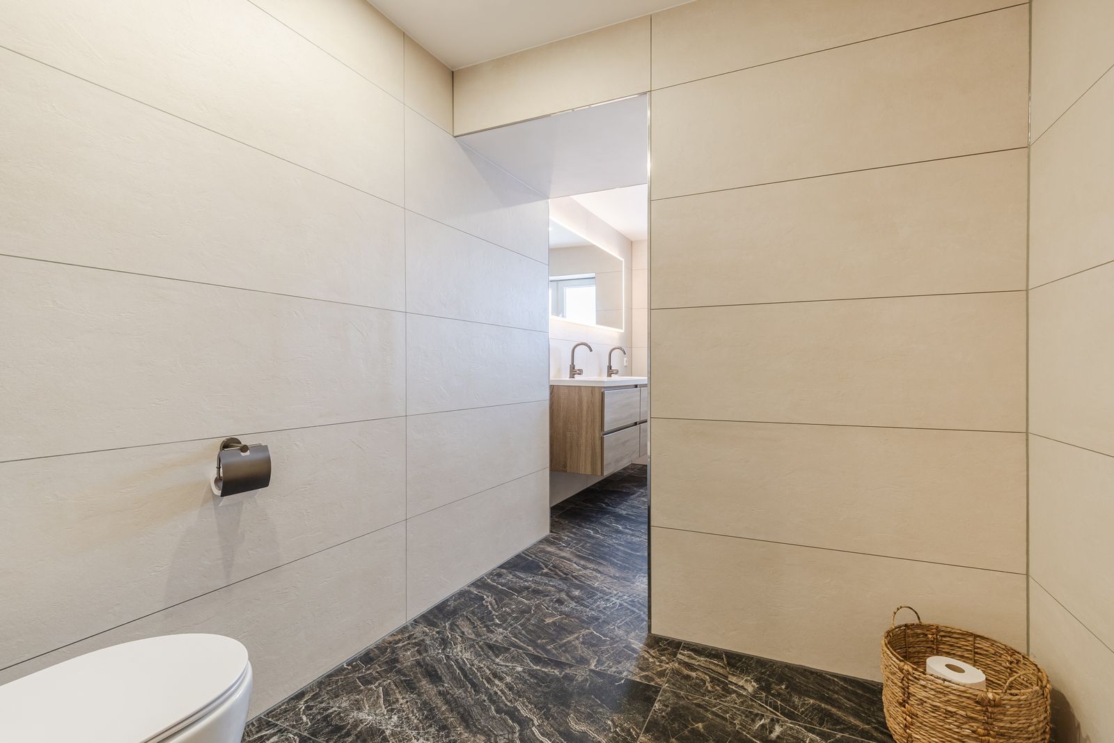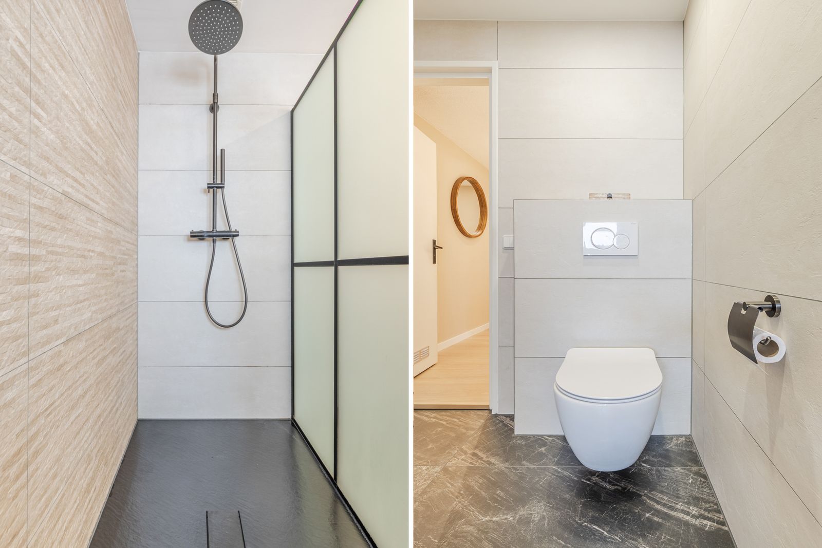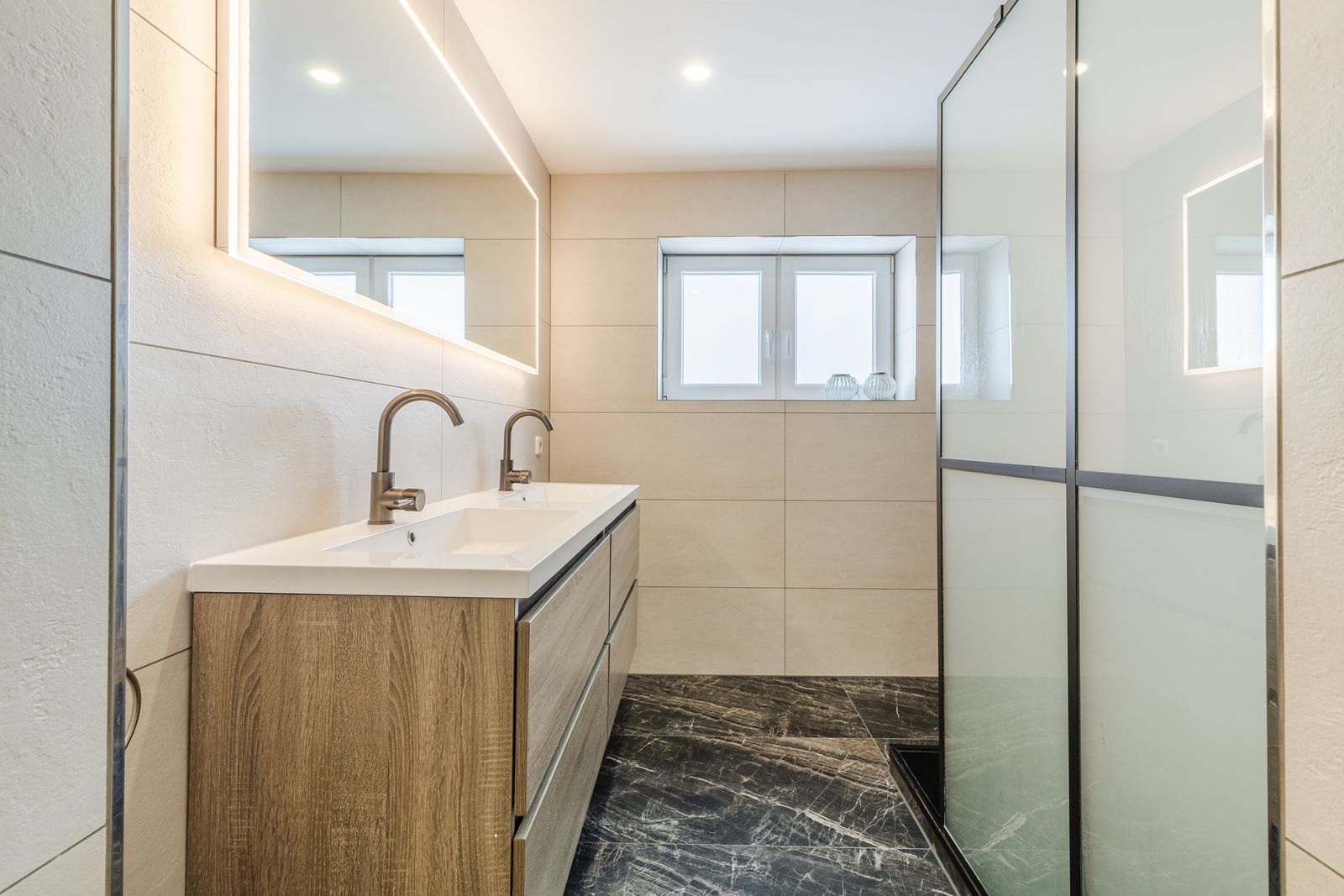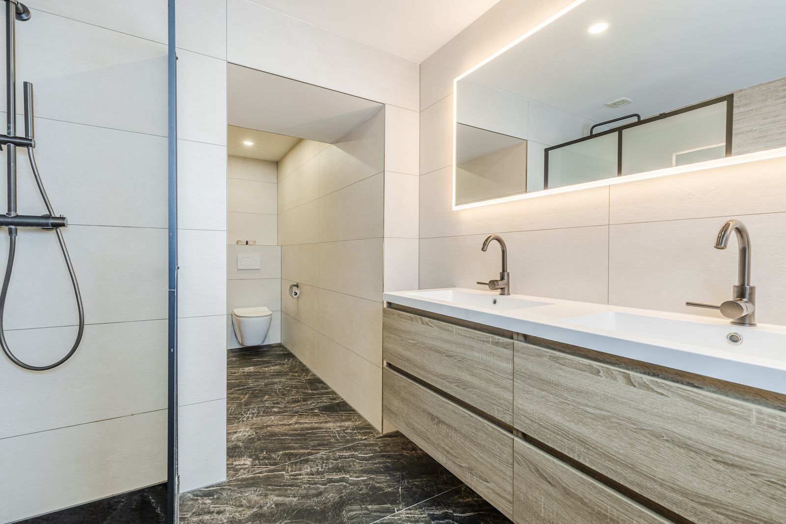 De badkamer (2023) bestaat uit een inloopdouche, dubbele wastafel, verwarmde spiegel met LED verlichting, designradiator en een toilet.