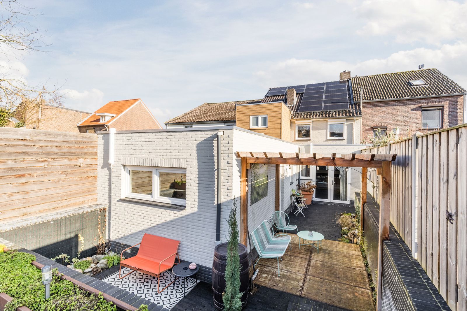 Aan de achterzijde van de tuin bevind zich een boomgaard, voorzien van diverse fruitbomen en bloemperken. Tevens is er een vakwerk tuinhuis, royaal gazon en zijn er diverse terrassen te vinden. Via het woonhuis heeft u toegang tot de patio, aangelegd in 2025, voorzien van een pergola en toegang tot de hoger gelegen tuin.
