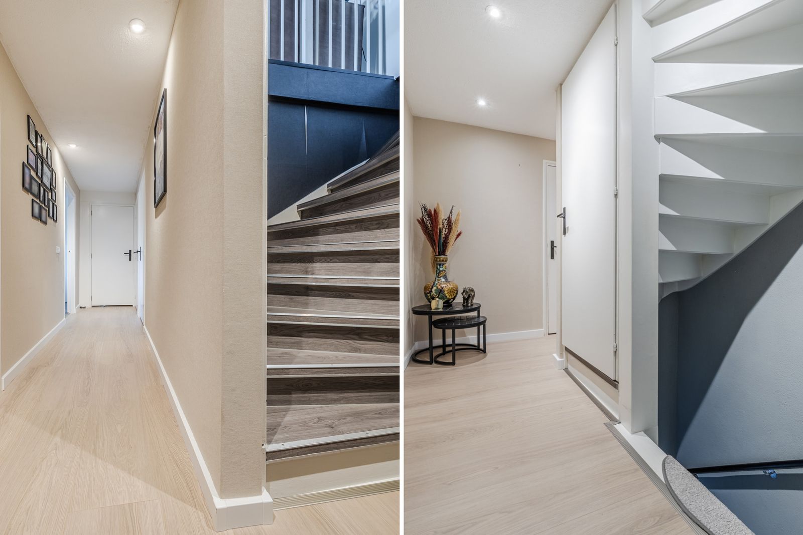 Lange ontvangsthal met vernieuwde meterkast (2025) voorzien van 17 groepen. Toegang tot het toilet (2024) en deur naar de woonkamer.Trap naar de eerste verdieping, garderobe en deur naar de kelder.