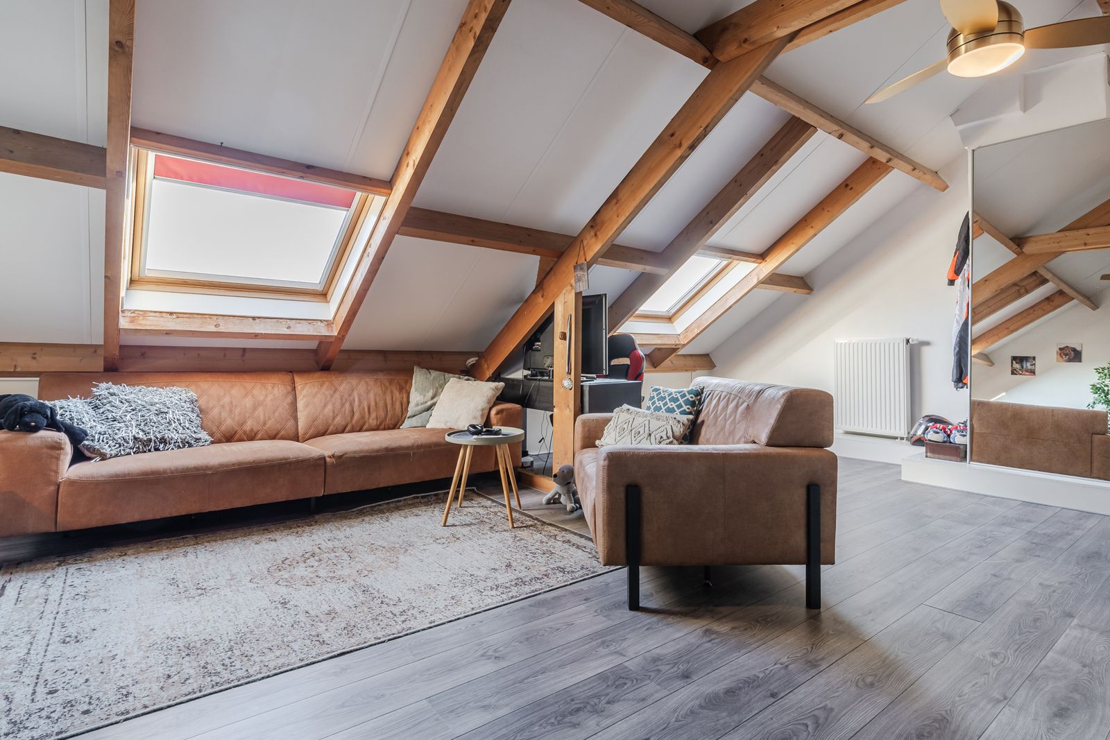Middels vaste trap vanaf de eerste verdieping toegang tot een riante geïsoleerde zolderverdieping (slaapkamer 6) met veel opbergruimte, technische ruimte, twee Velux dakramen en verwarmt door radiatoren en een airco.