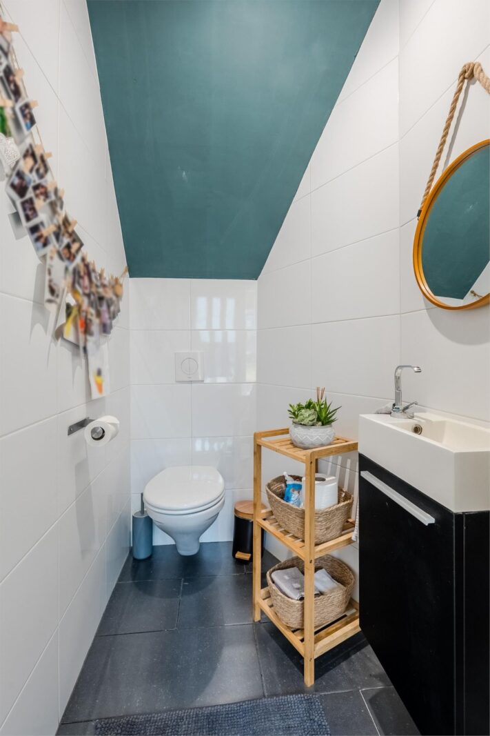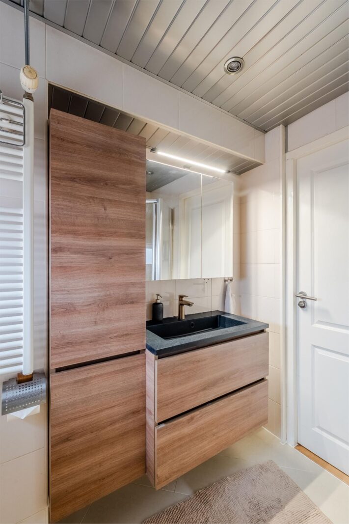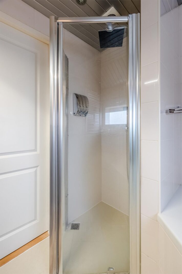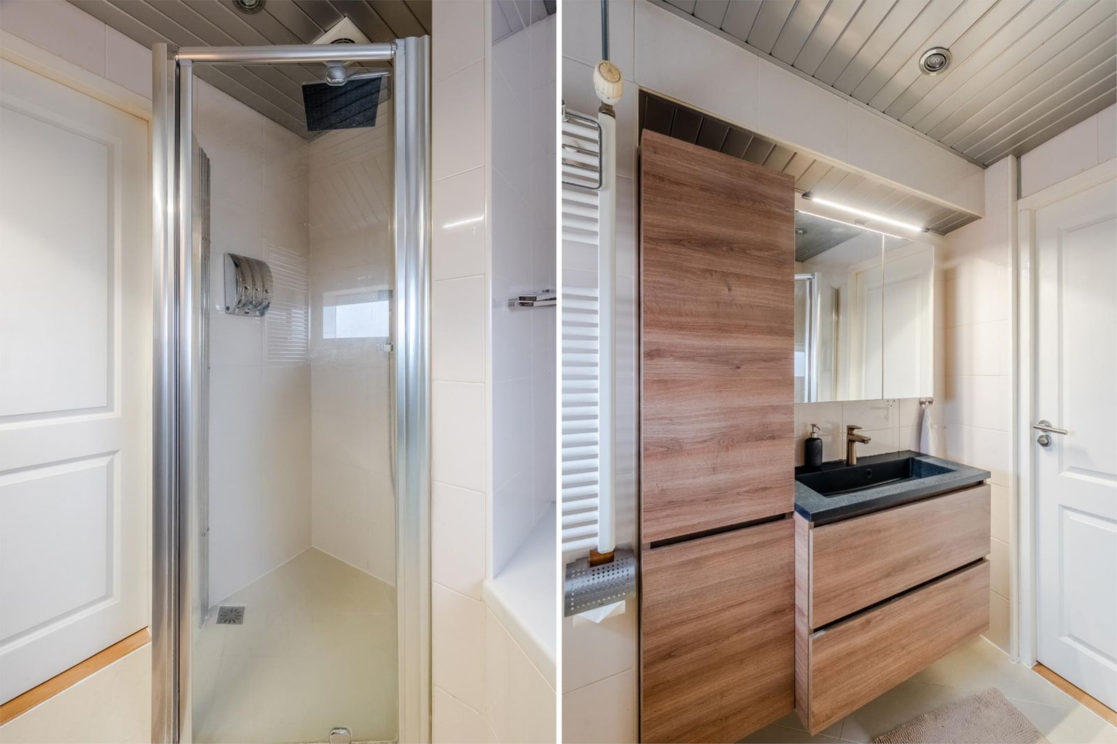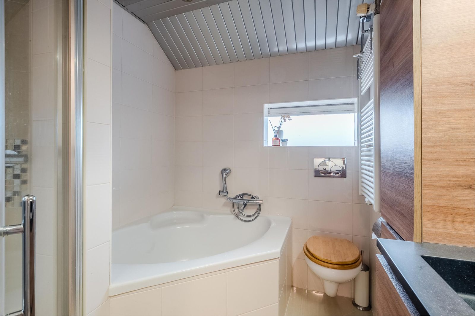 De badkamer ligt aan de achterzijde en is uitgerust met douche, ligbad, toilet en wastafel.