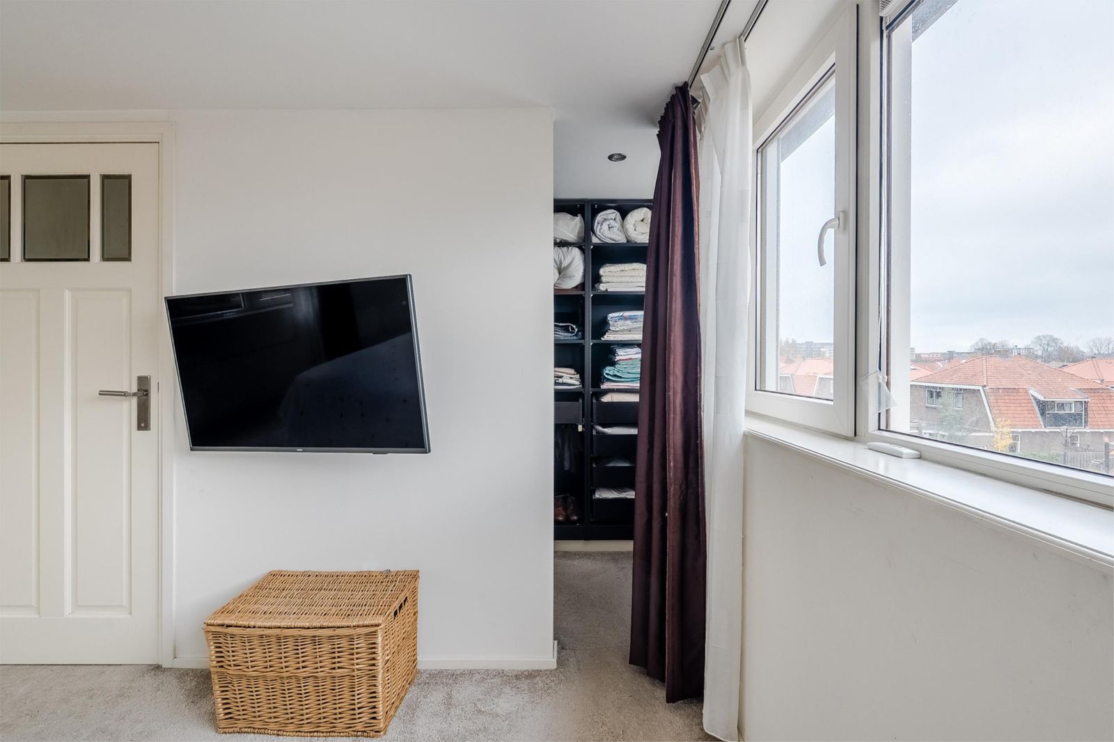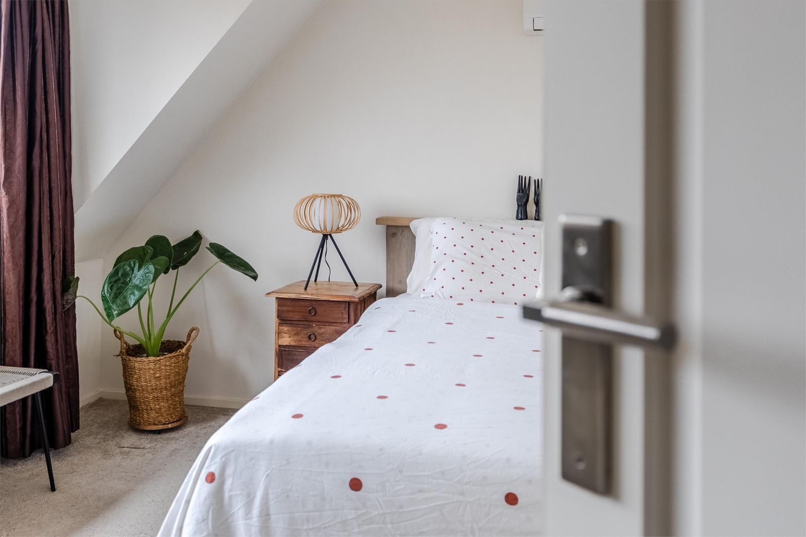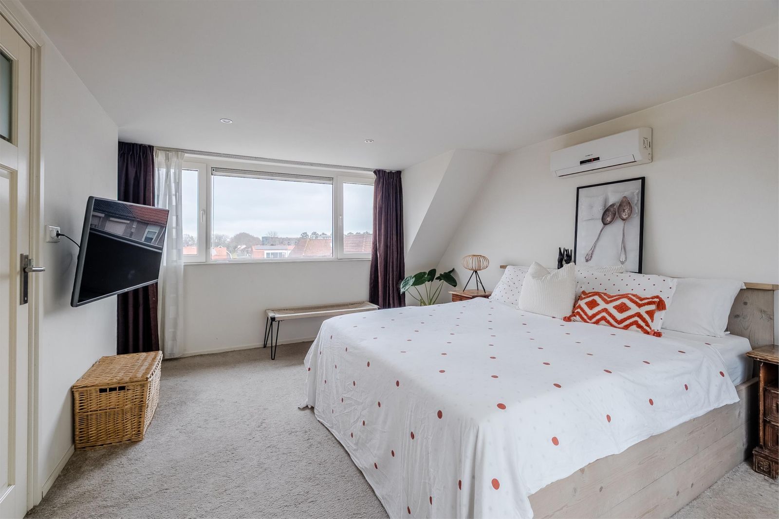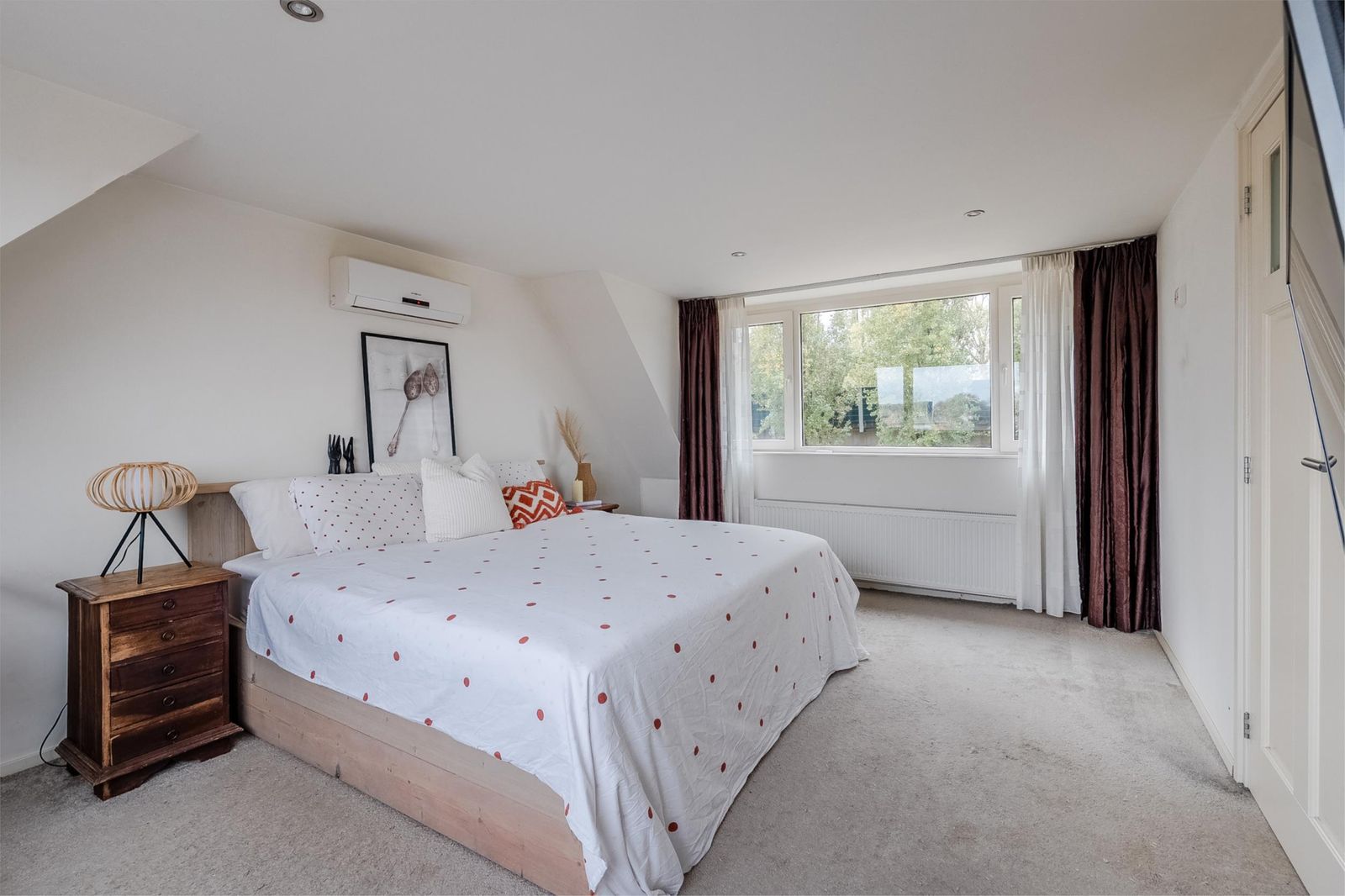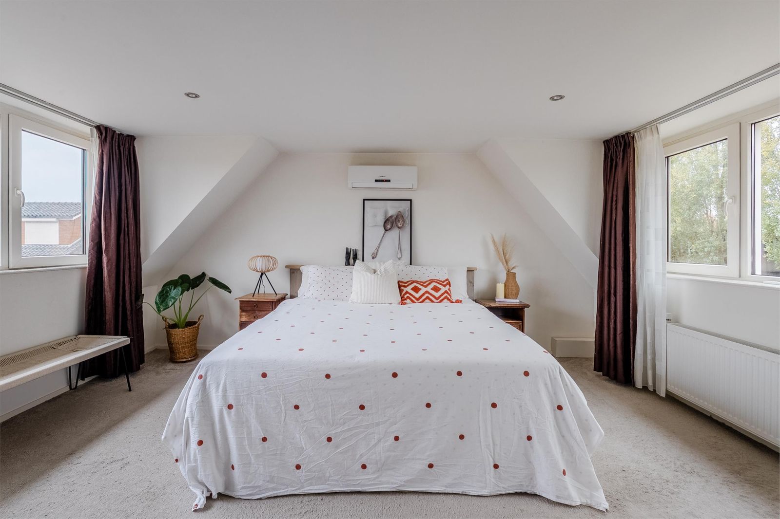 Een ruime master bedroom over de gehele lengte van de woning, met twee grote dakkapellen en een inloopkast.