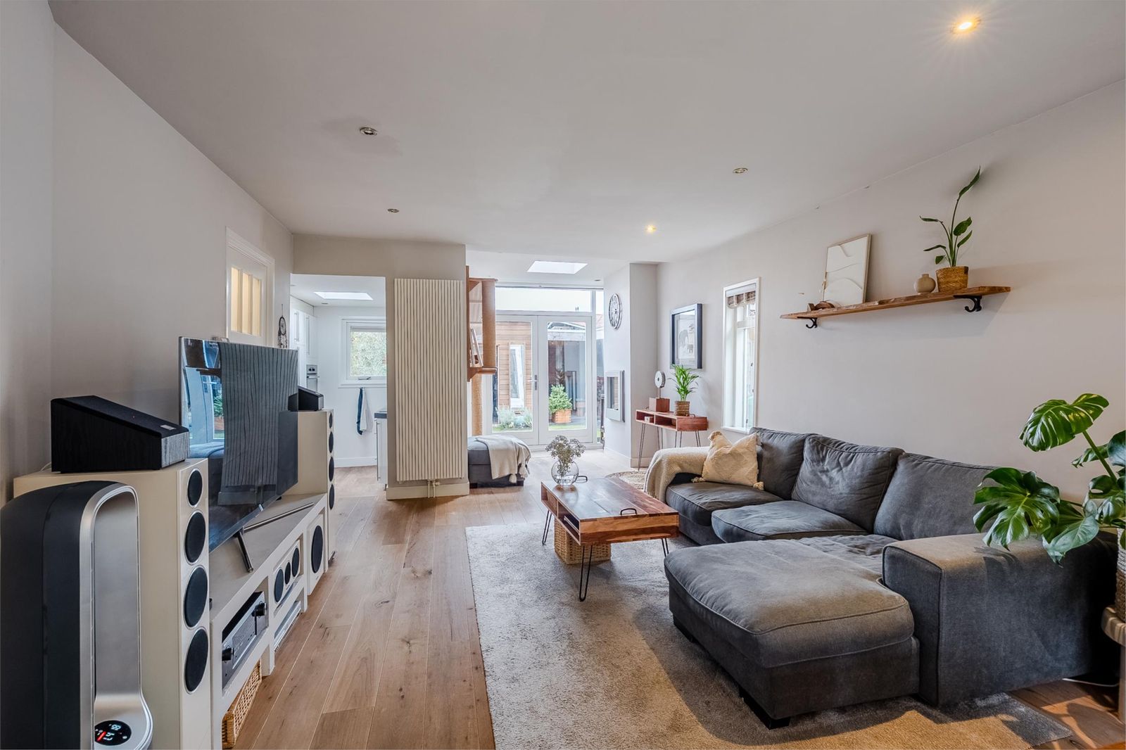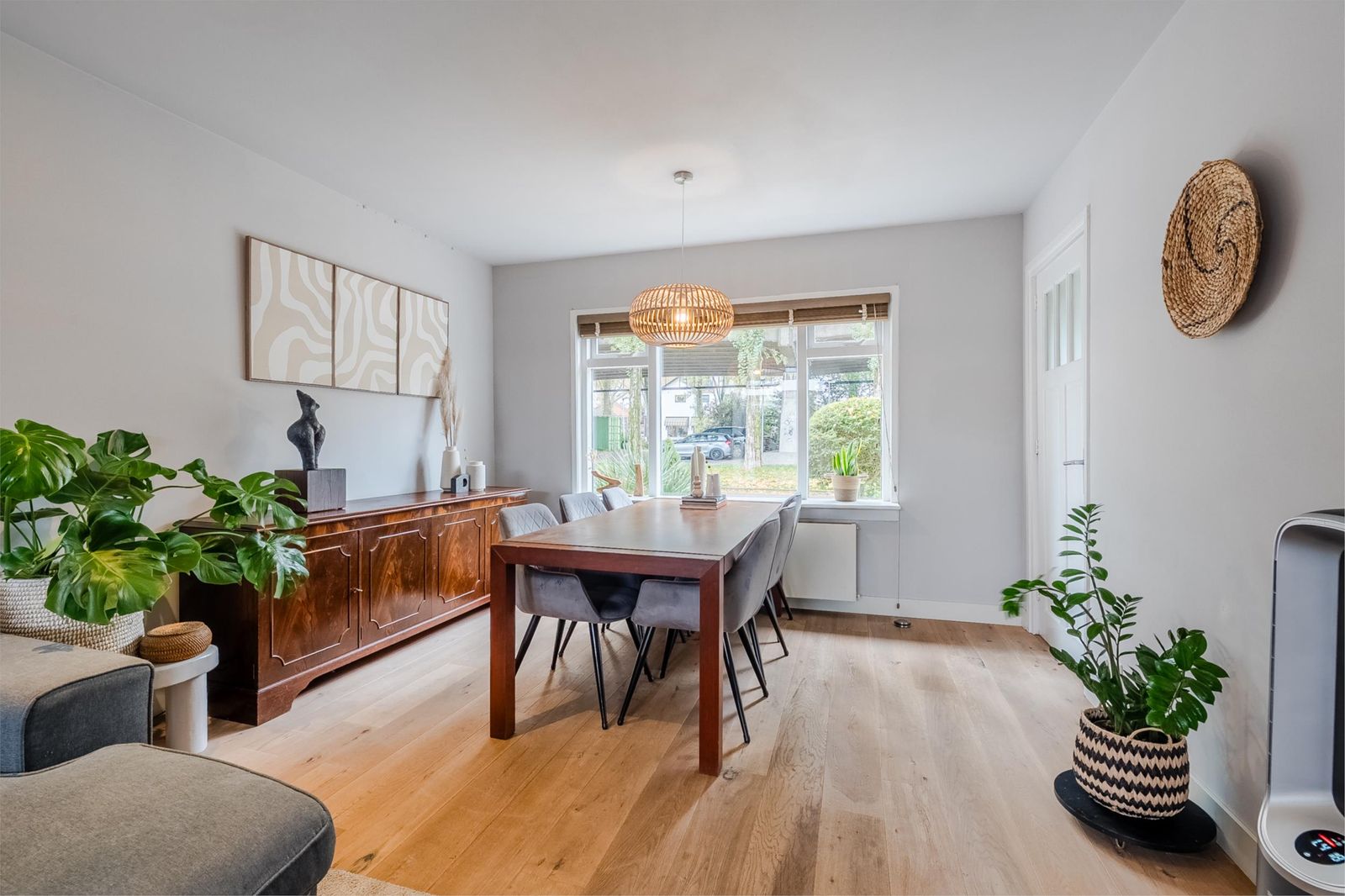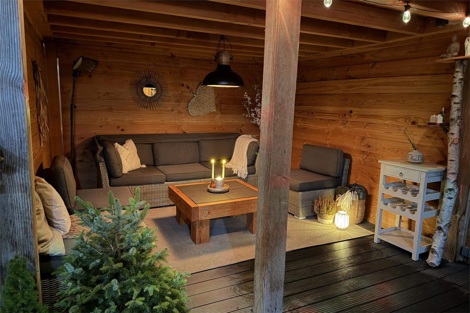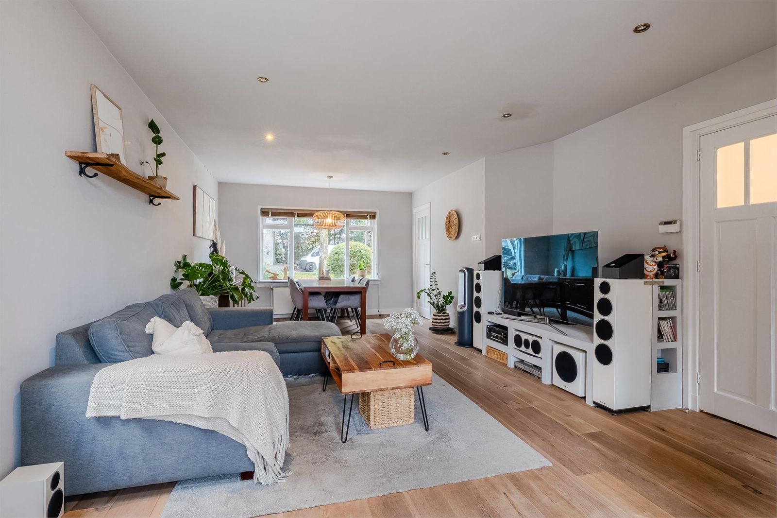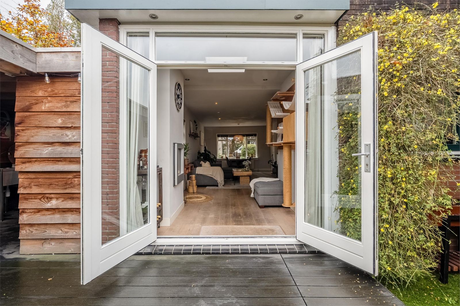 Vanuit de woonkamer stap je direct de tuin en veranda in — een prachtige verbinding tussen binnen en buiten.