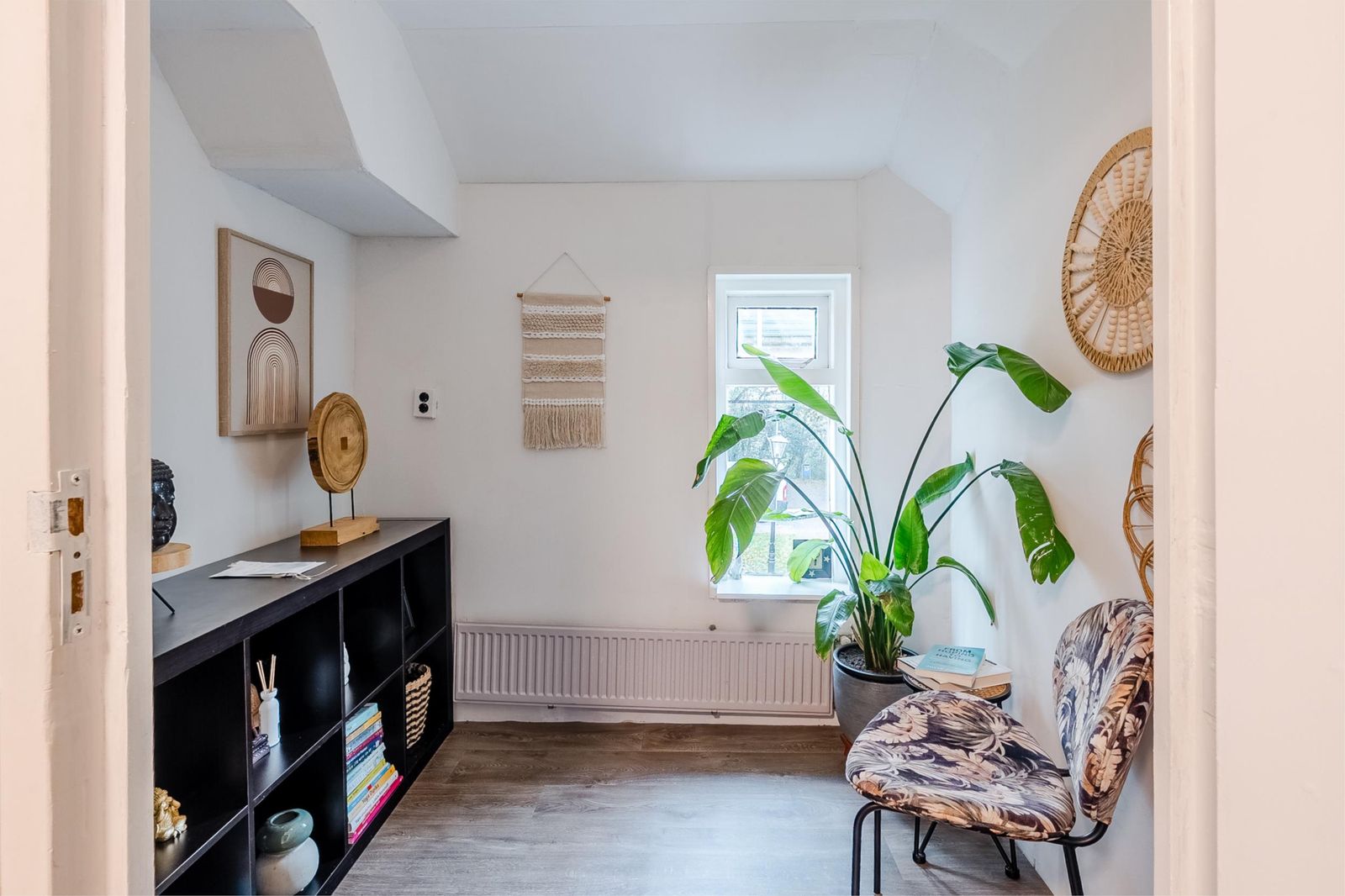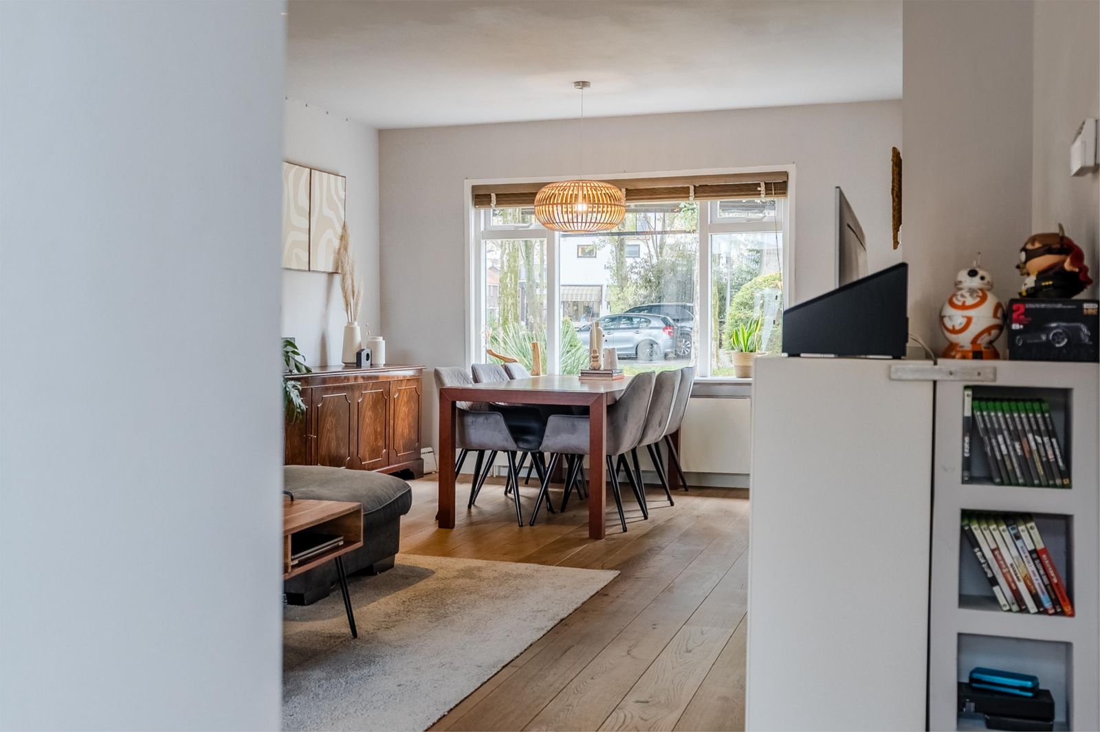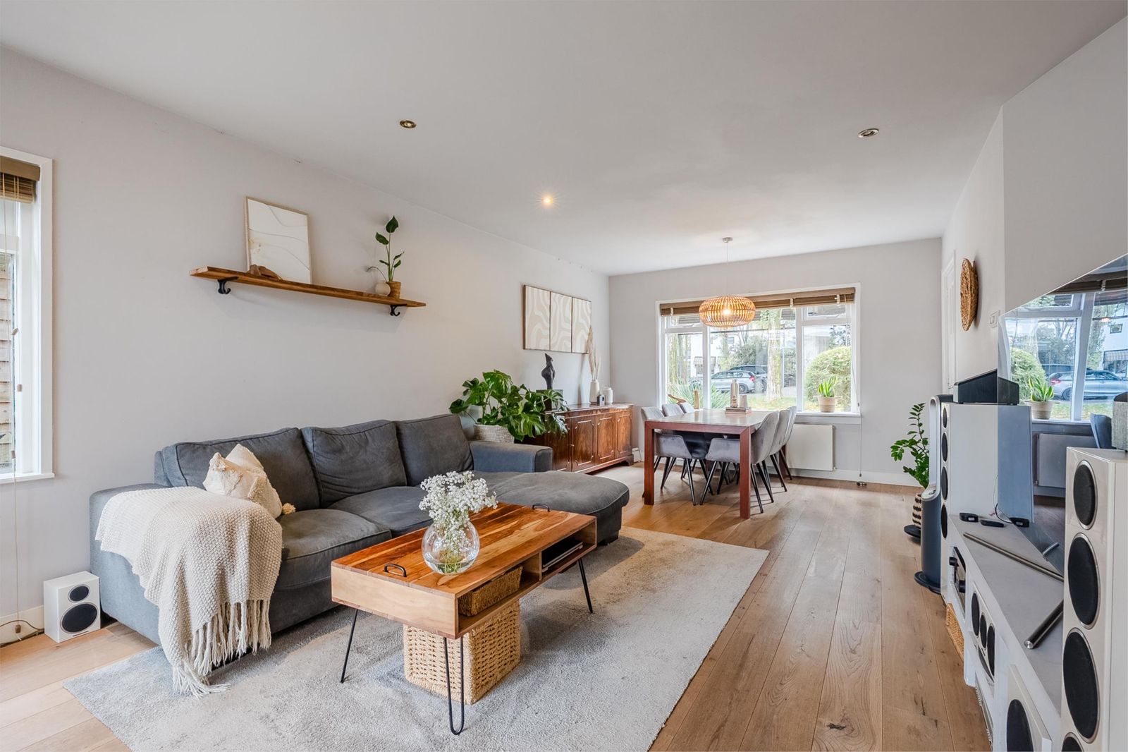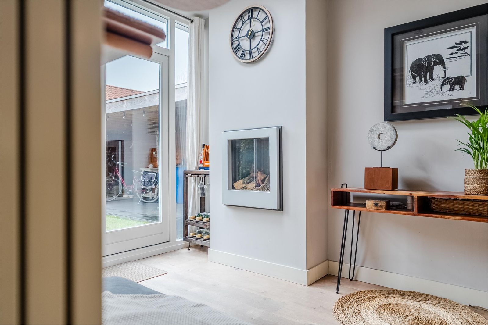 De lichte woonkamer met gas-openhaard en grote uitbouw straalt direct een warme, huiselijke sfeer uit.