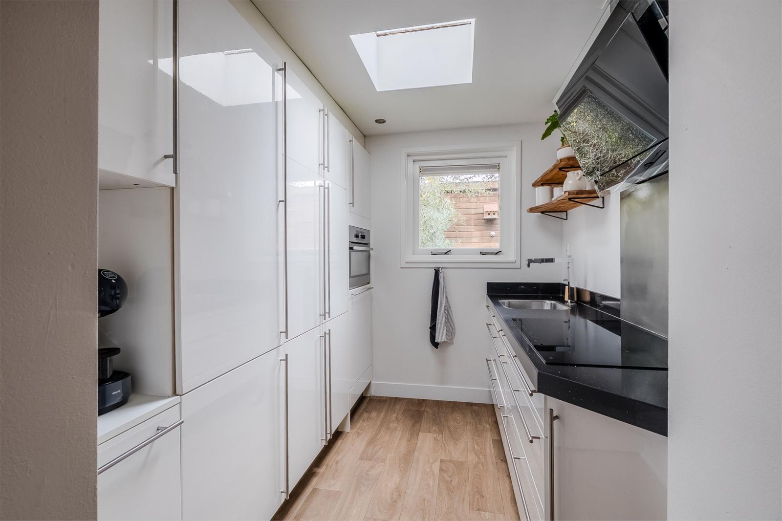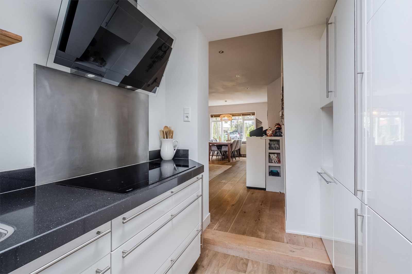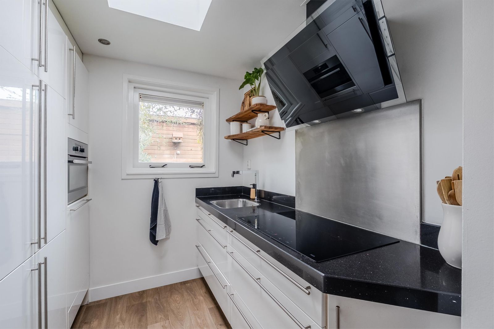 De halfopen keuken aan de achterzijde is modern uitgevoerd en voorzien van inductiekookplaat, combimagnetron, koelkast, vaatwasser en close-in boiler.