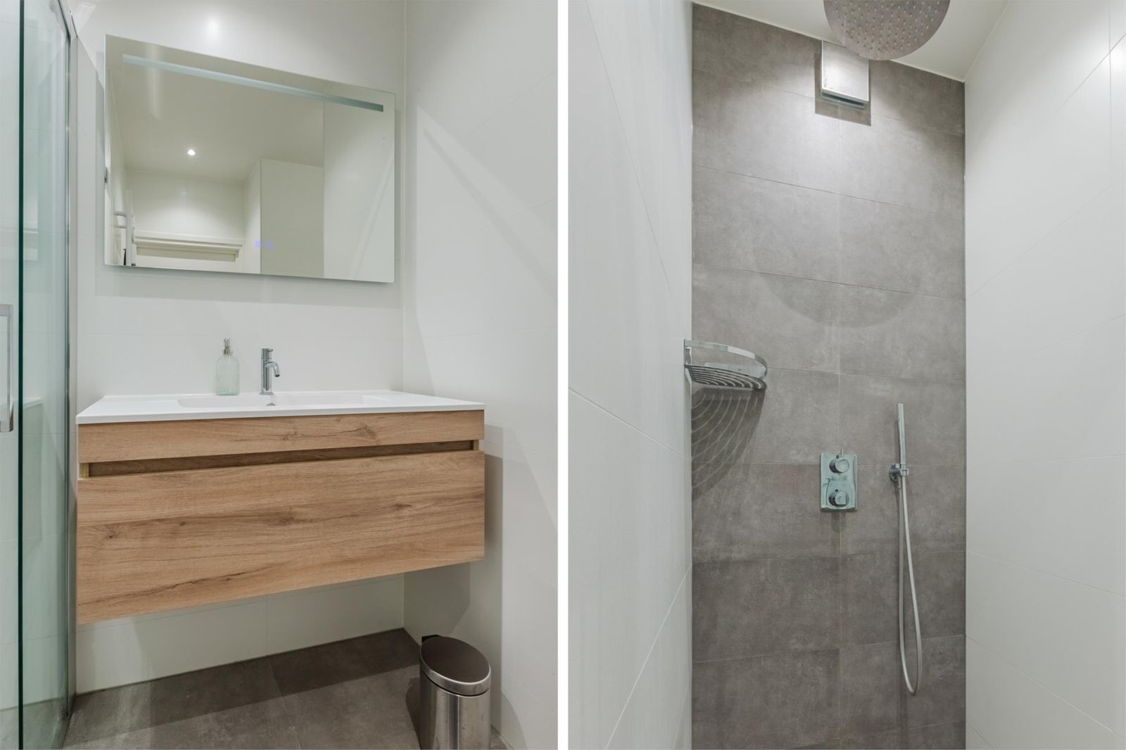There are two generously sized bedrooms (approx. 14 m² and 10 m²), one of which includes two built-in wardrobes. The contemporary bathroom features a spacious walk-in (rain) shower with glass doors, a wide vanity with drawers, a heated and illuminated mirror, towel radiator, and recessed ceiling lights. The bathroom also offers space for a washing machine and dryer.