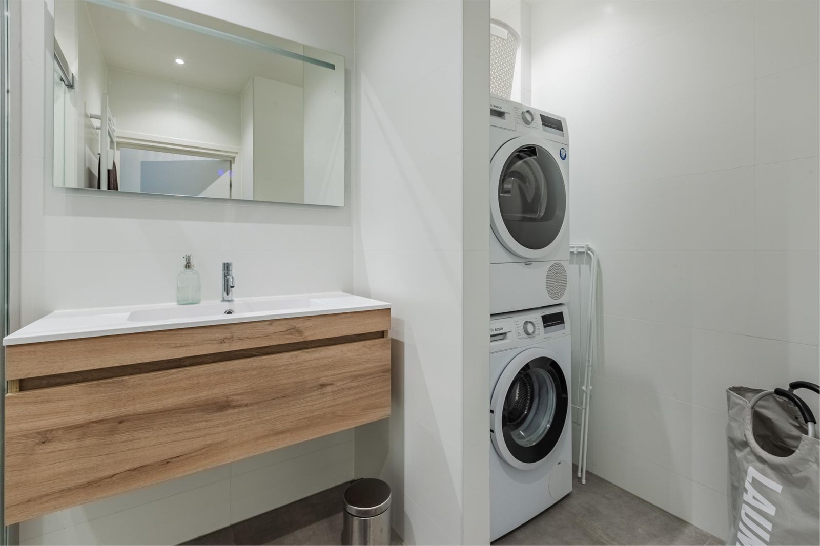 Het appartement beschikt over twee goed bemeten slaapkamers (ca. 14 m² en 10 m²), waarvan één met praktische inbouwkasten. De luxe badkamer is uitgerust met een royale (regen)douche met glazen deuren, een breed wastafelmeubel met lades, een verlichte en verwarmde spiegel, handdoekradiator en inbouwspots. Hier is tevens ruimte voor een wasmachine en droger.