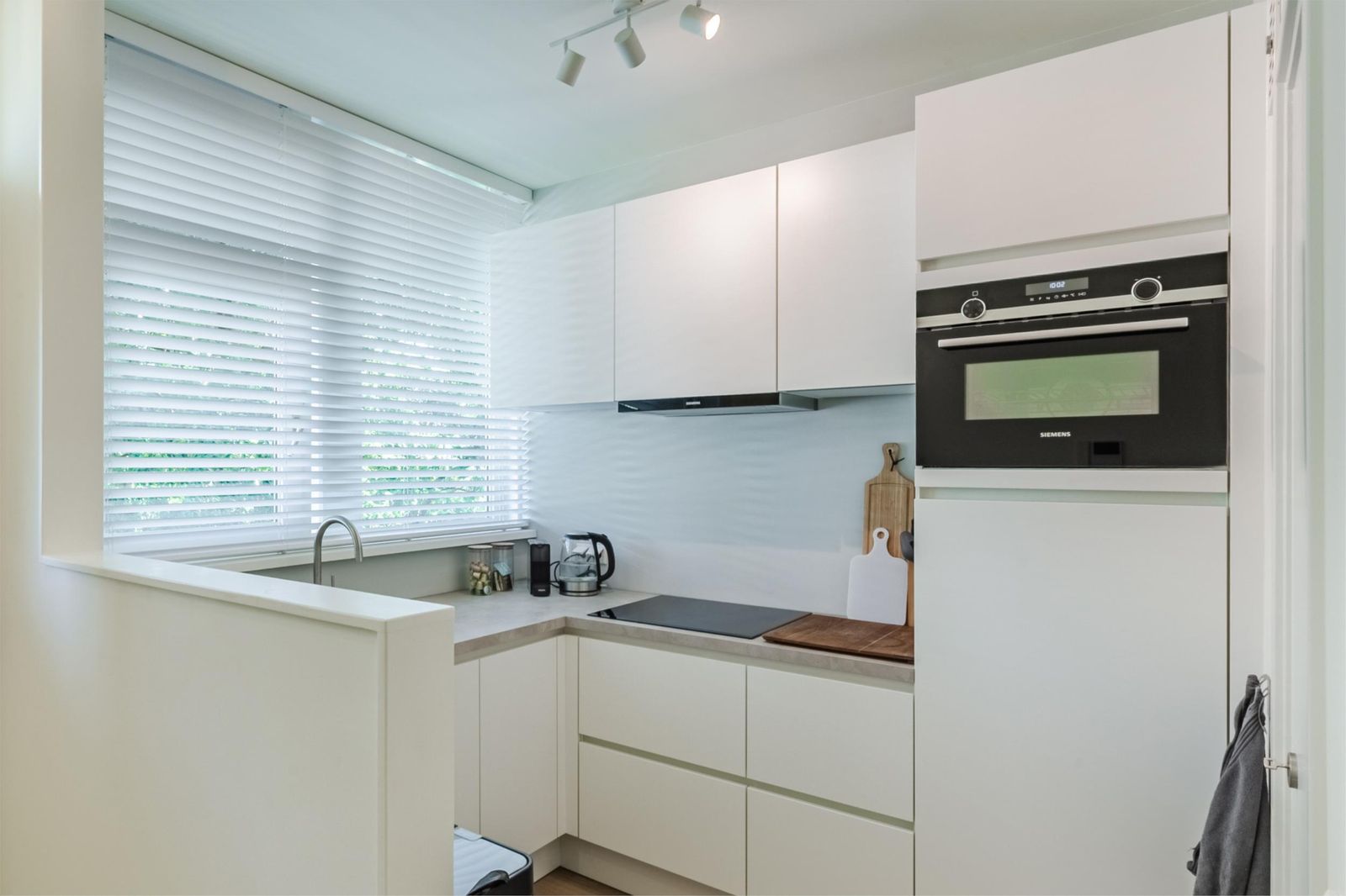 Entrance with hallway and wardrobe space, separate toilet with built-in reservoir and washbasin. The bright living and dining area provides access to the south-facing balcony. The semi-open, L-shaped kitchen is equipped with high-quality built-in appliances, including a combination microwave-oven, induction cooktop, fridge-freezer, integrated extractor hood, and dishwasher.