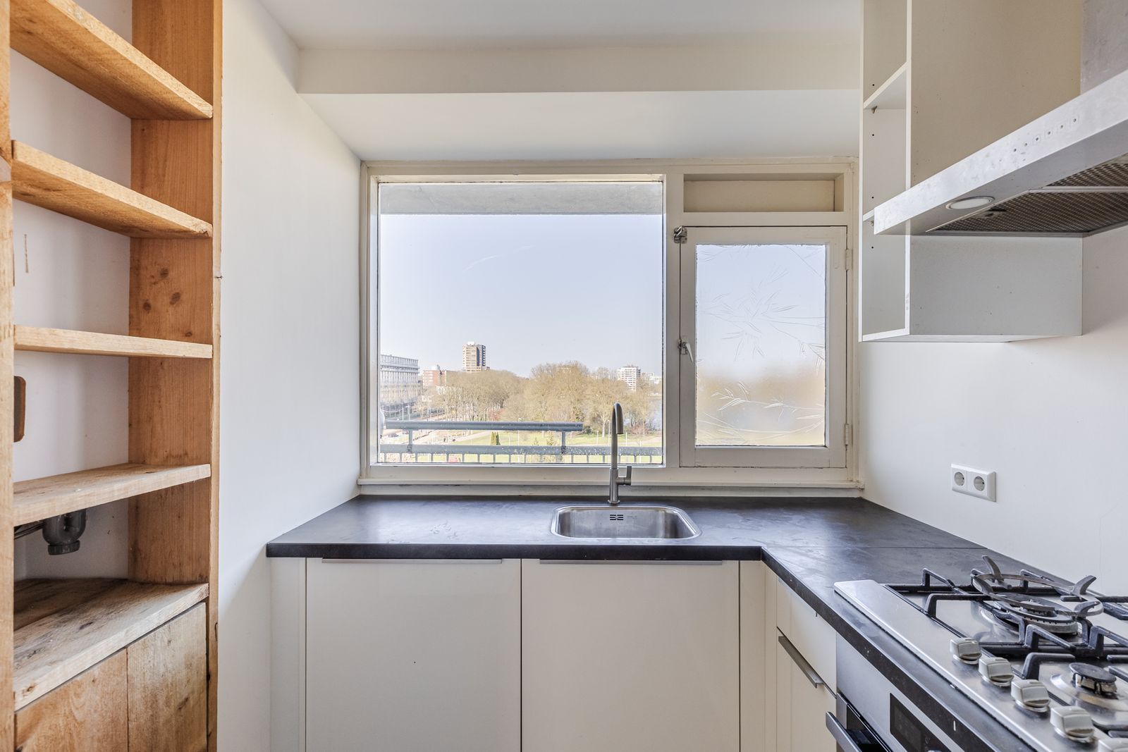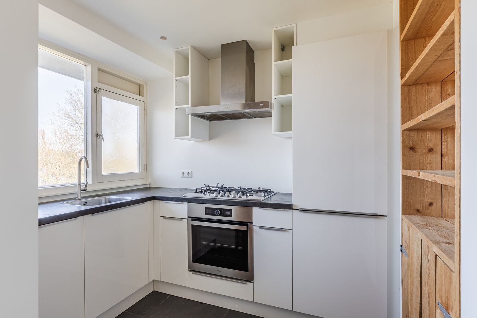 De hal leidt je naar de royale woonkamer, de open keuken en de badkamer. De L-opstelling open keuken is praktisch ingericht met voldoende werkruimte. De keuken heeft een vaatwasser een oven, 5-pits gaskookplaat, een Boretti afzuigkap inclusief verlichting en een grote koelkast met vriesgedeelte. De elektrische boiler voor het warme water is netjes weggewerkt achter steigerhouten inbouwkasten.