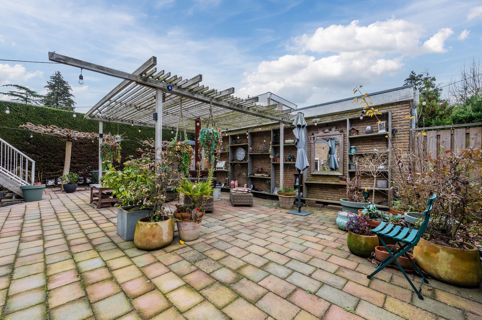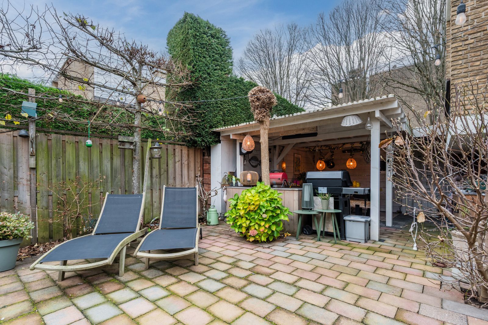 Riante luxe grote zonnige tuin met buitenkeuken en mogelijkheden tot parkeren in achtertuin naast de woning van camper of caravan.
