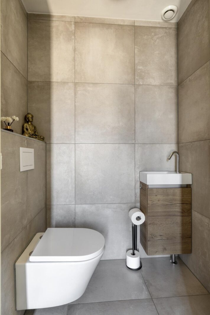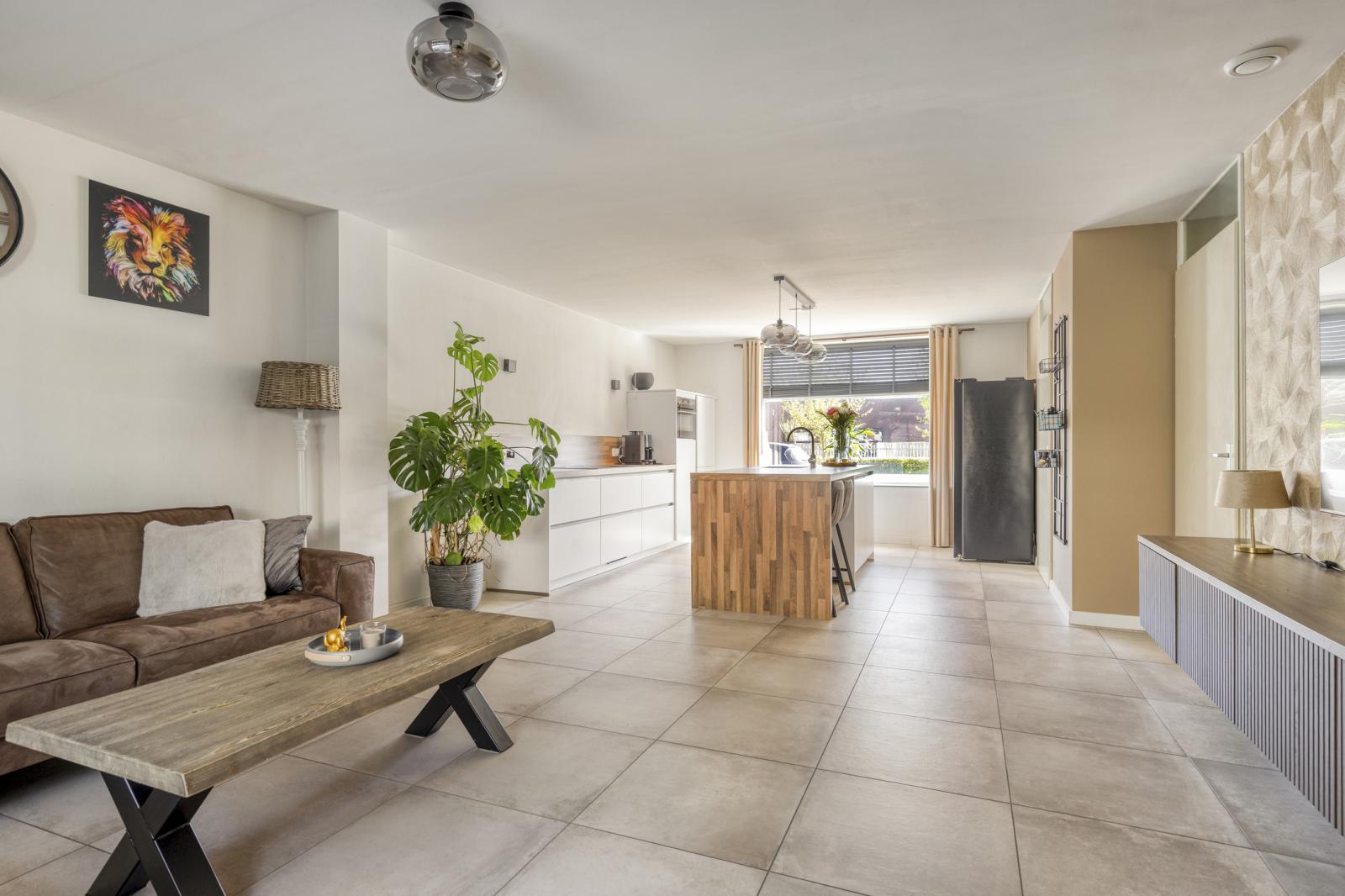 De voordeur opent op een nette hal met garderobe en een volledig betegeld toilet met zwevend closet en fonteintje. De tegelvloer loopt soepel door naar de woonkamer, die meteen indruk maakt door de enorme lichtinval via grote raampartijen aan zowel voor- als achterzijde.