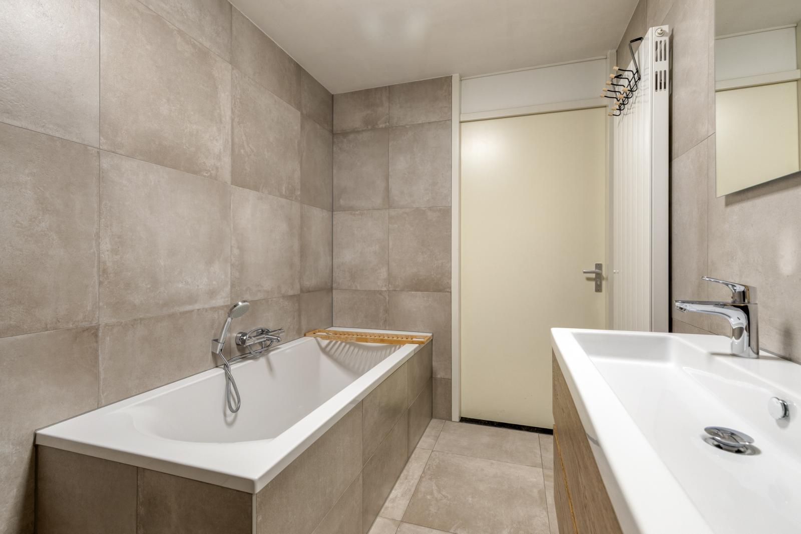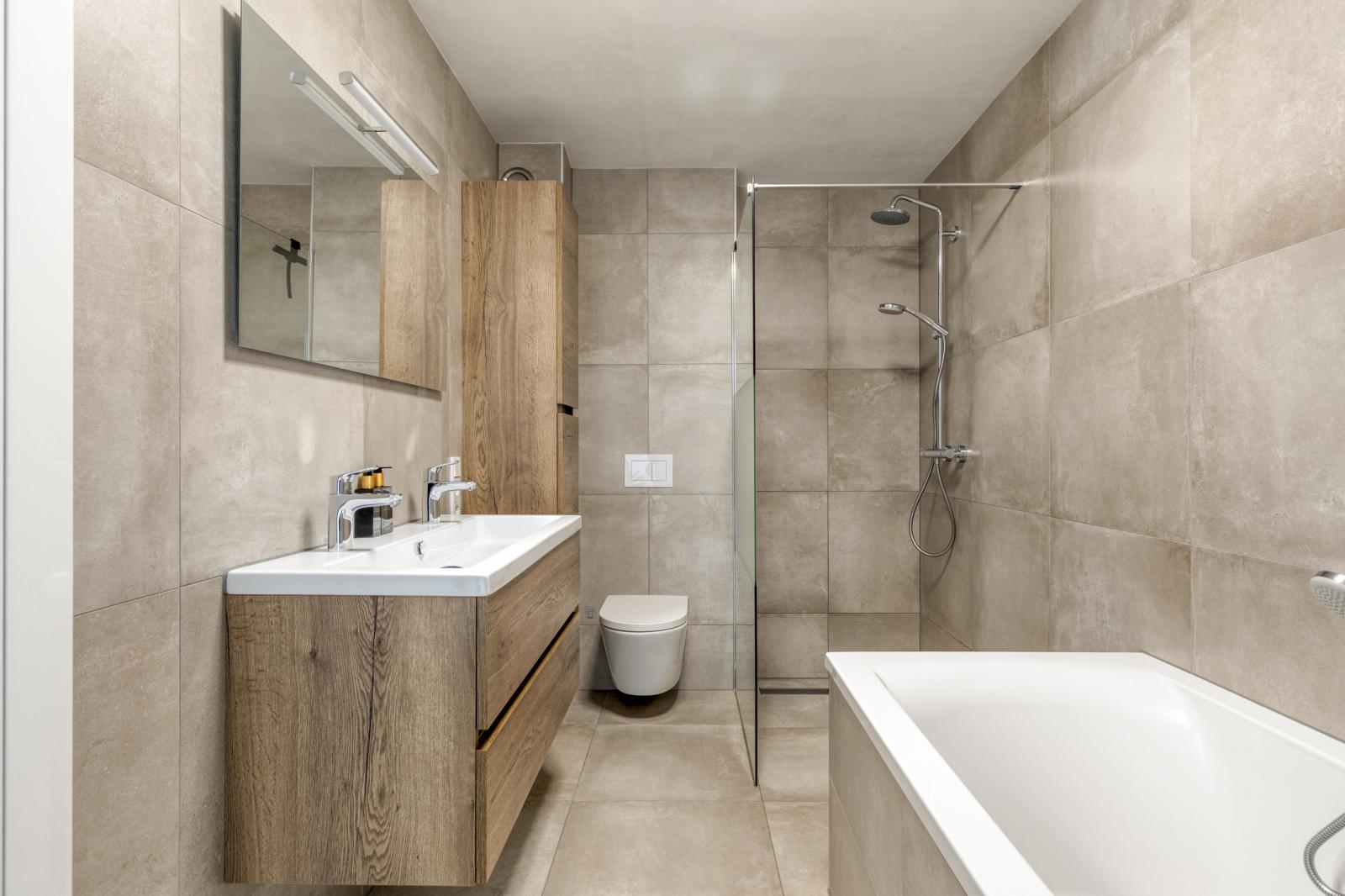 Op de eerste verdieping vind je twee ruime slaapkamers en een badkamer die overtuigt op het eerste gezicht. Volledig betegeld in warme taupe tinten, met een wastafelmeubel in houtlook, een royale inloopdouche met regendouche, een ligbad én een toilet, hier start elke ochtend goed. Op de overloop en beide slaapkamers ligt een strakke laminaatvloer die het geheel rustig en samenhangend houdt.